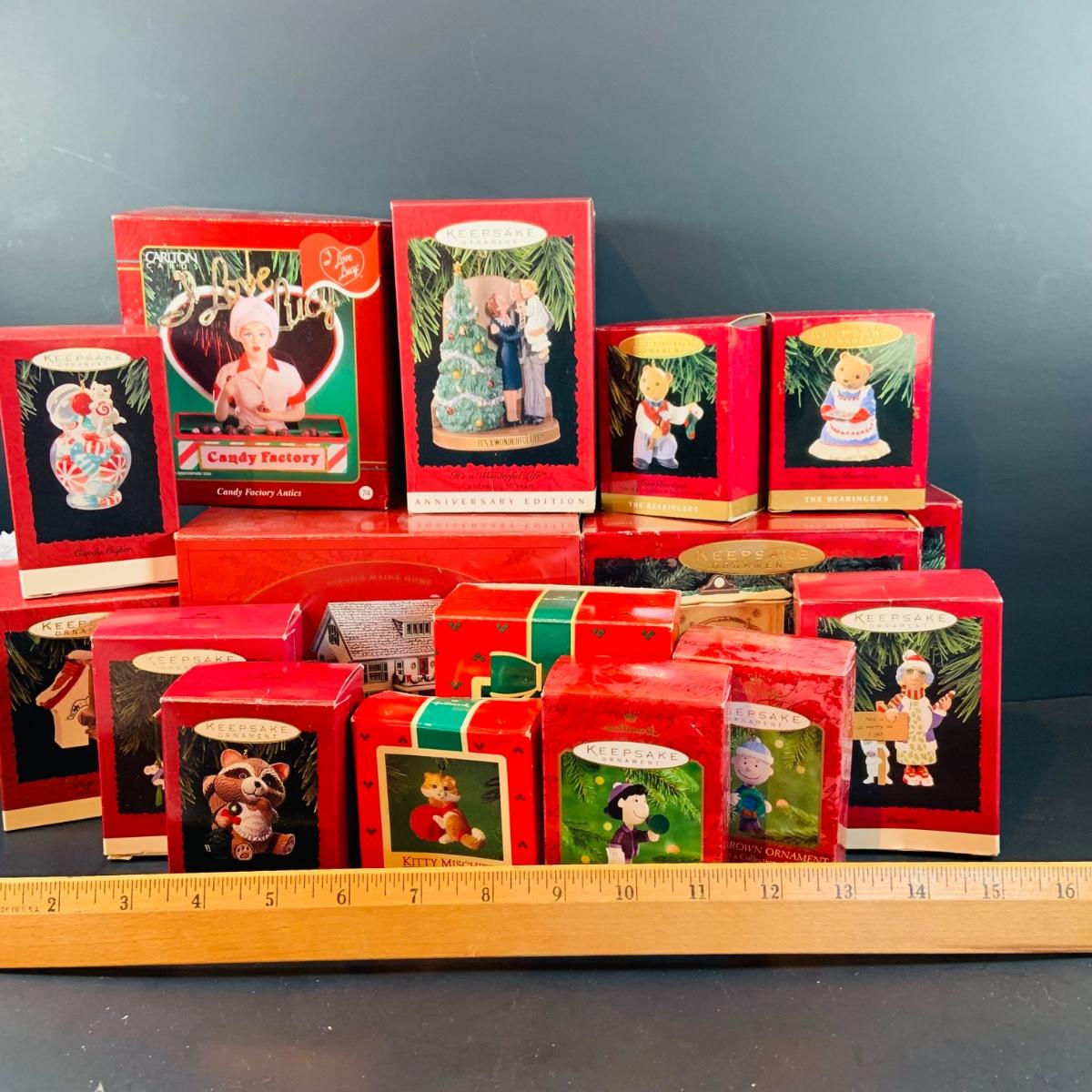 LOT 323: Large Assortment of Hallmark Christmas Ornaments Including I Love Lucy, Peanuts, It's a Wonderful Life and Many More