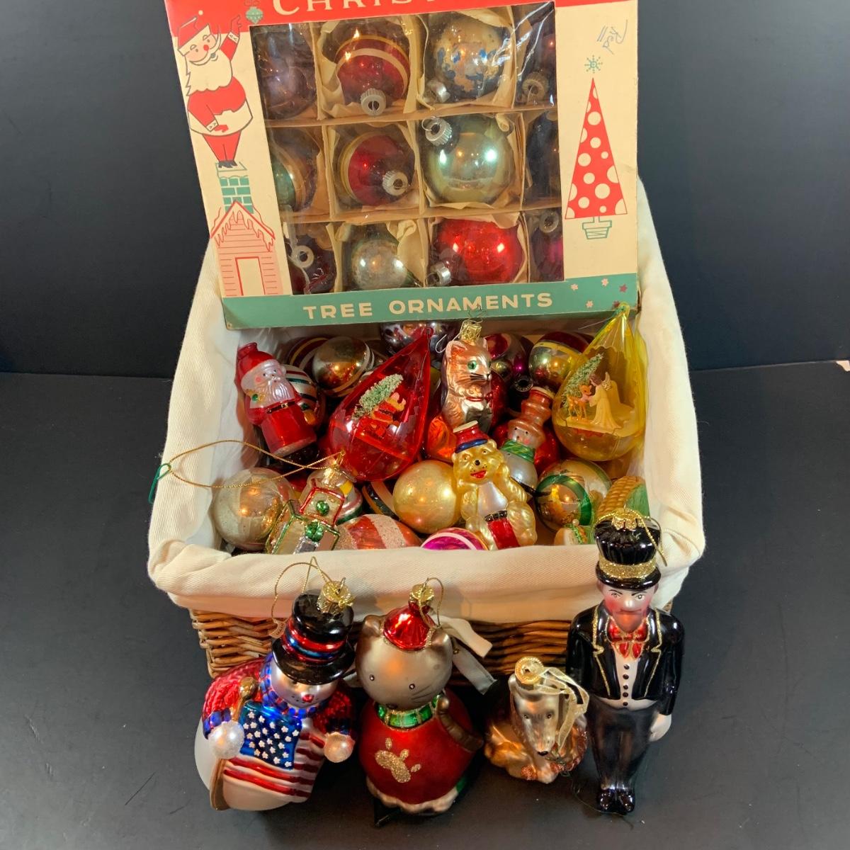 LOT 324: Large Assortment of Holiday Tree Ornament - Bulbs, Mercury Syle Glass Figures, Light Covers and More