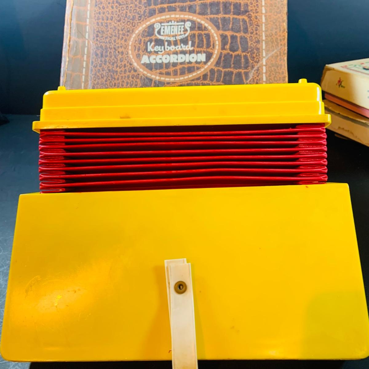 LOT 357: Vintage Childrens Toys, Games, and Books Including a Toy Piano and Ememee Toy Accordion