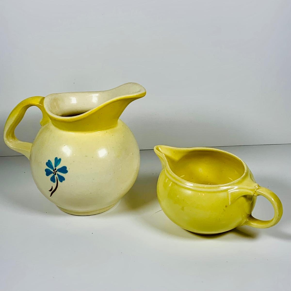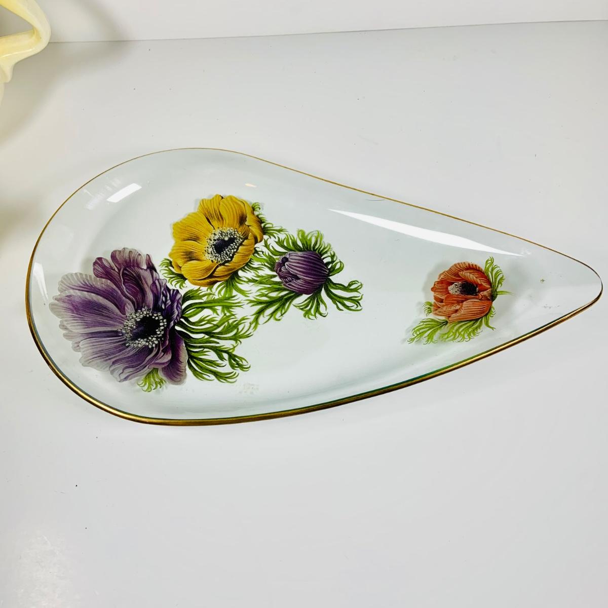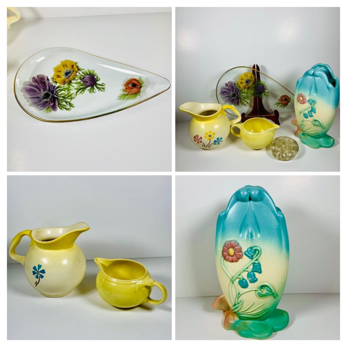 LOT 360: Beautiful Spring Collection Including Hull Floral Vase, Tear Drop Shaped Glass Plate with Painted Flowers, Hull Pitcher and Fiestaware Creamer and Glass Flower Frog