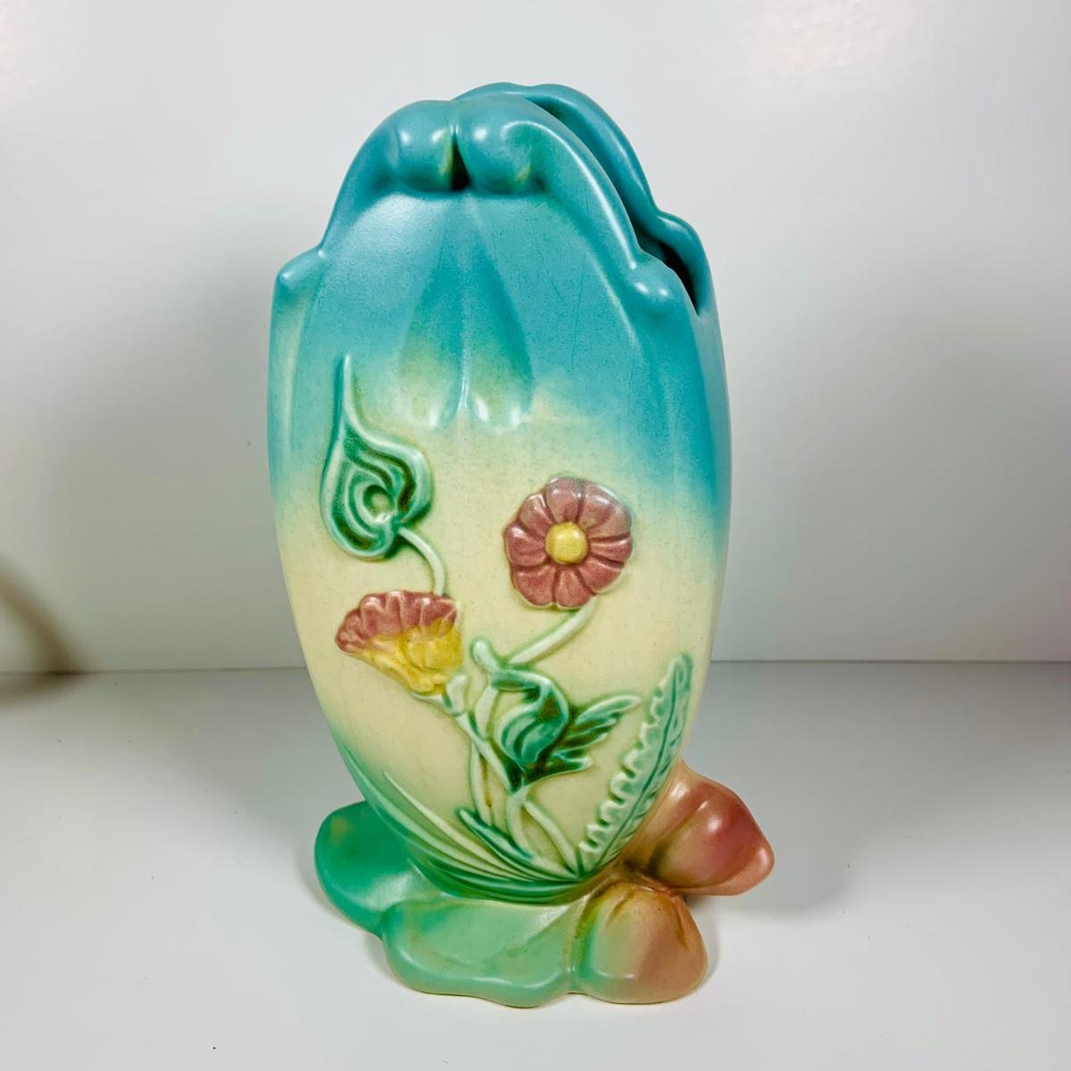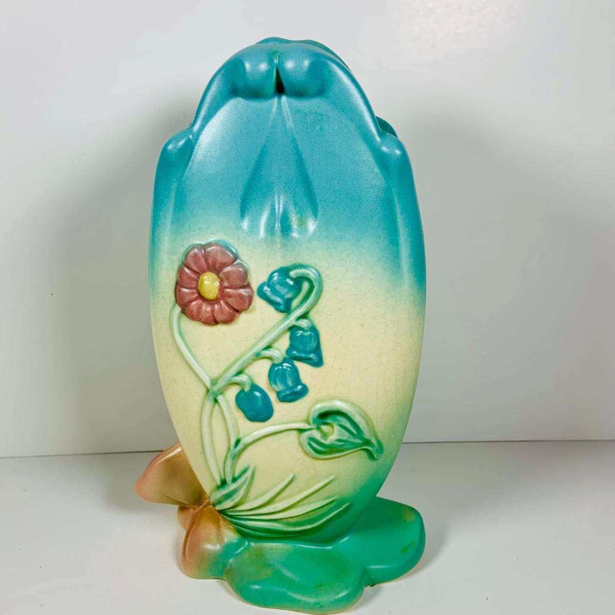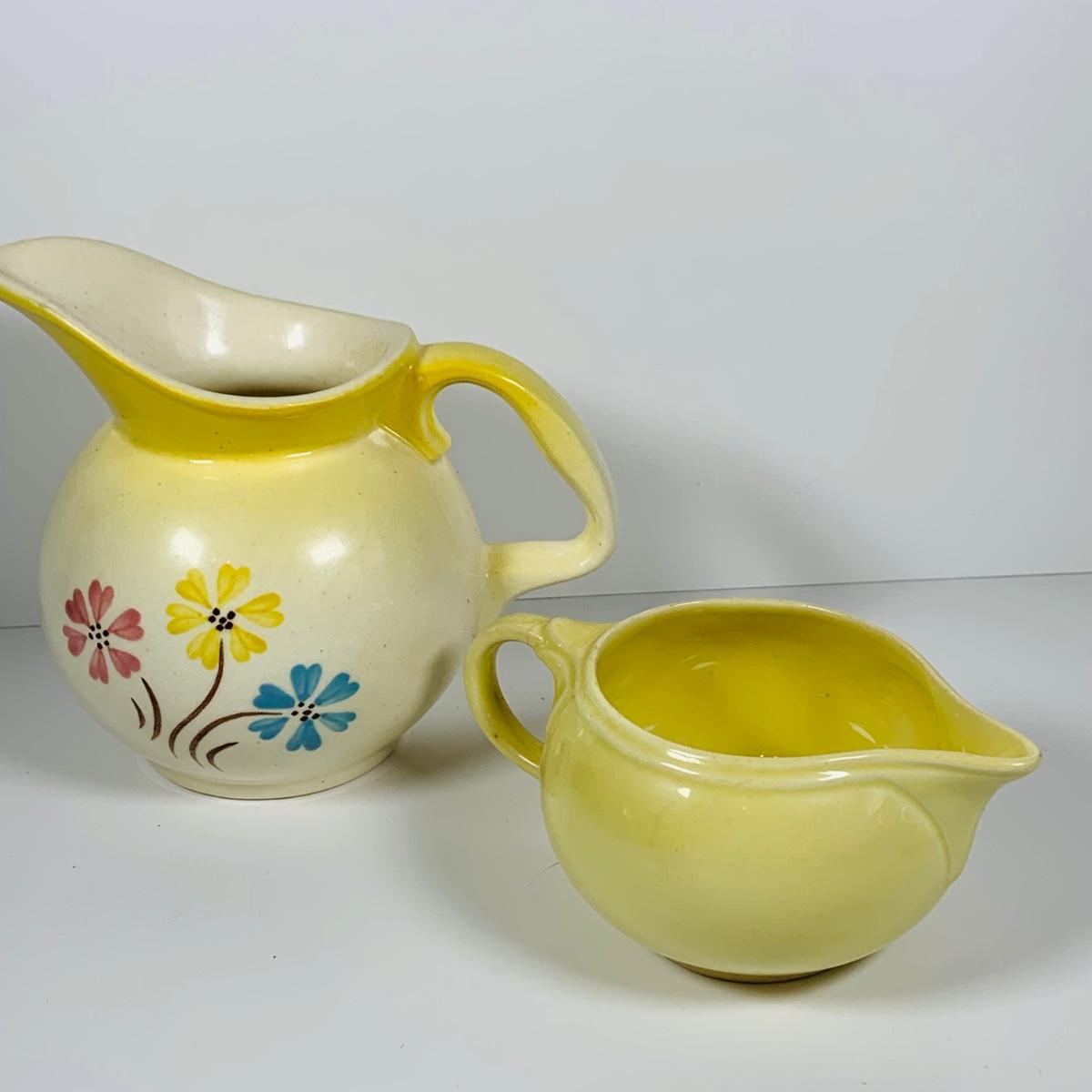 LOT 360: Beautiful Spring Collection Including Hull Floral Vase, Tear Drop Shaped Glass Plate with Painted Flowers, Hull Pitcher and Fiestaware Creamer and Glass Flower Frog