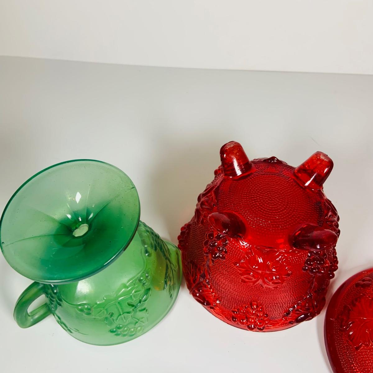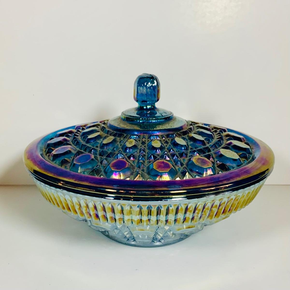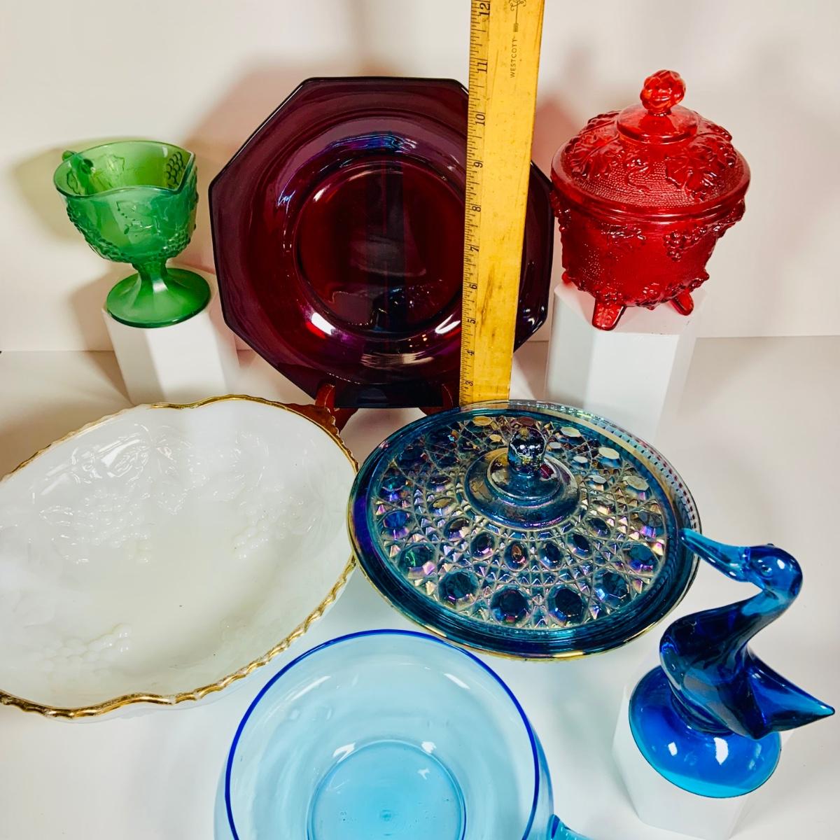 LOT 362: Assortment of Art Glass Pieces Including Ruby Red Glass Plate, Windsor Blue Carinval Glass Covered Dish, Gold Trimmed Milk Glass Bowl, Empoli Blue Glass Dish, Viking Glass Blue Duck and More