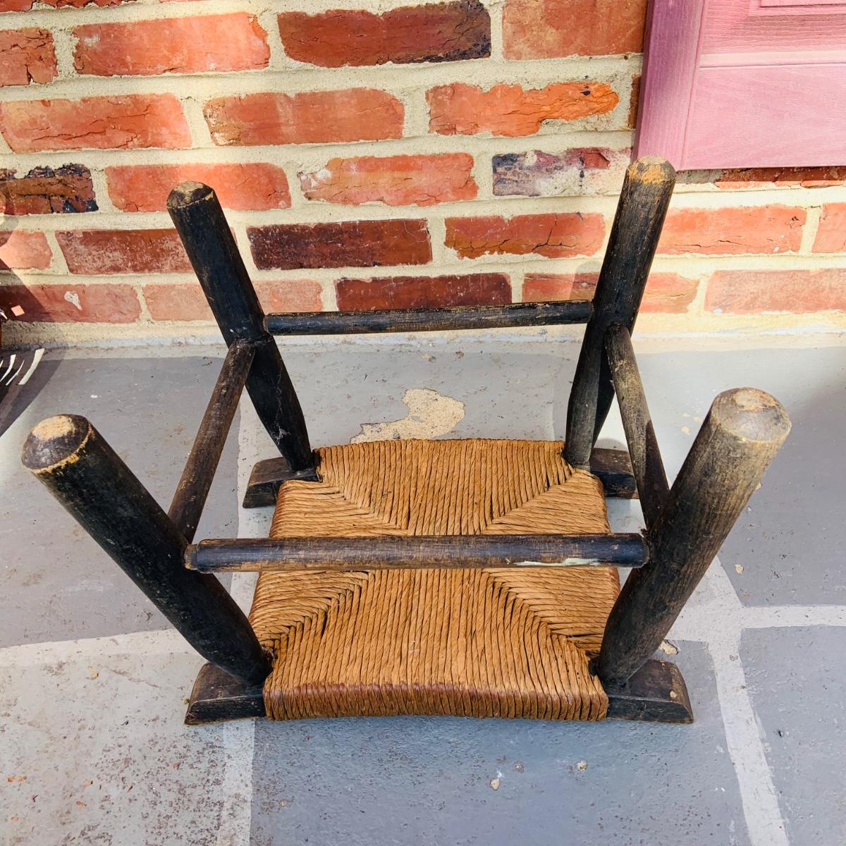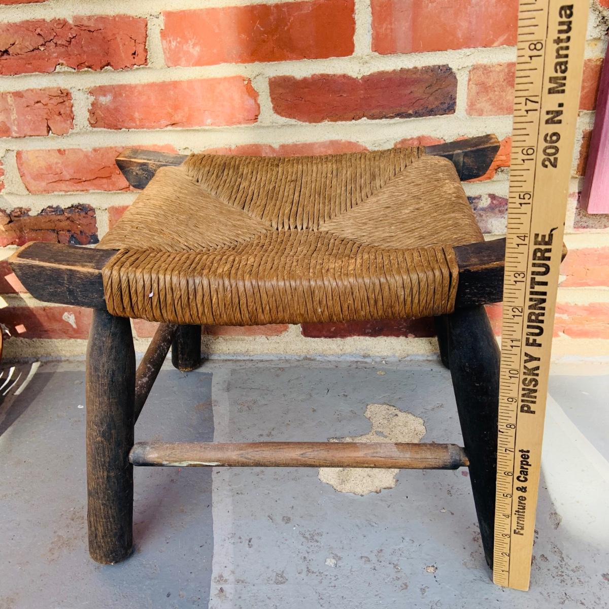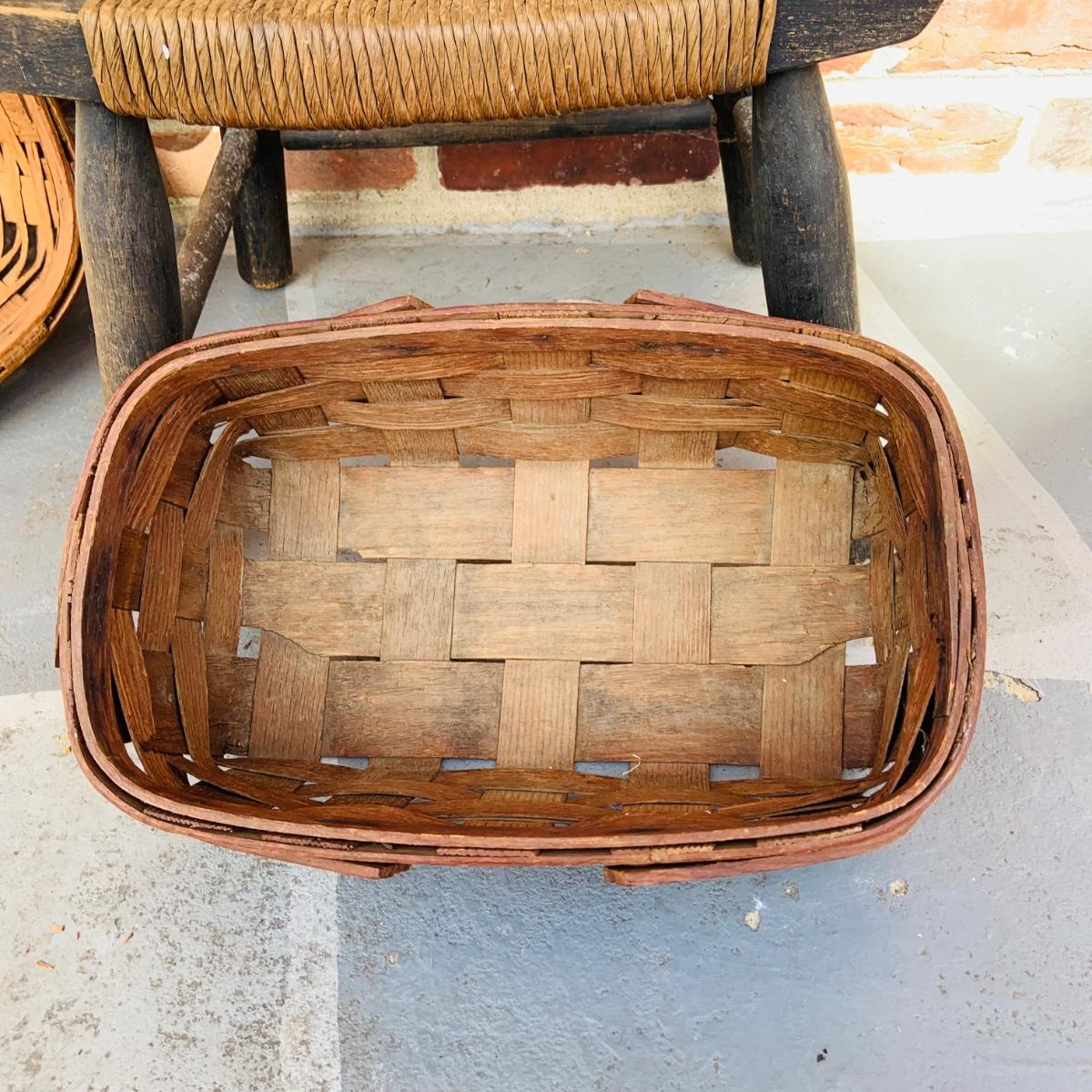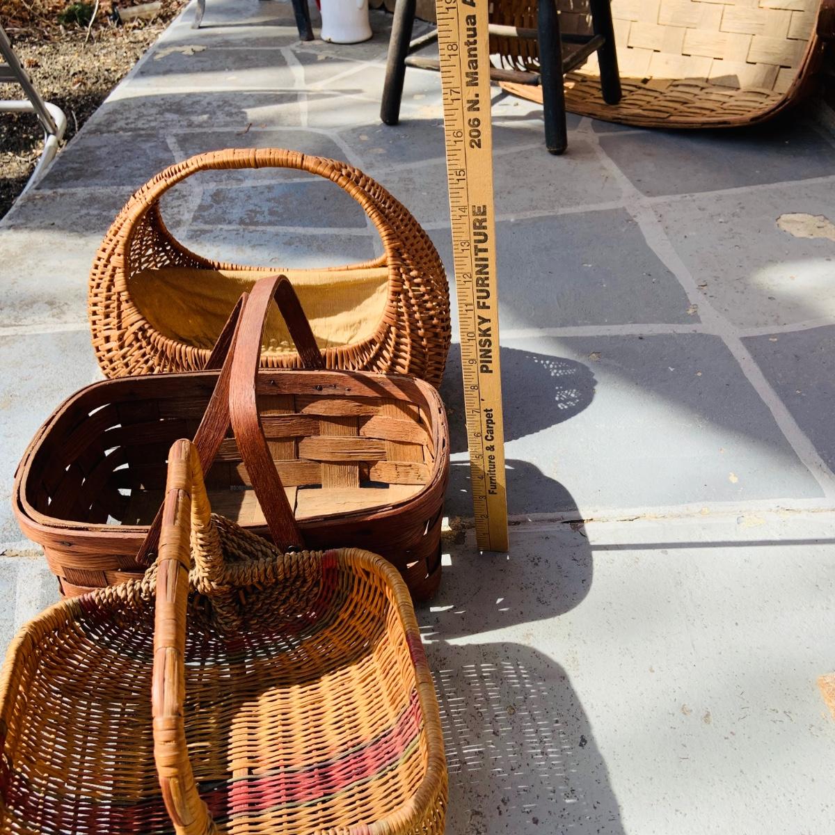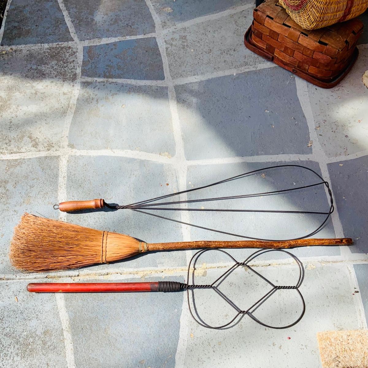 LOT 364: Collection of Primitive Baskets, Arts & Crafts Country Rush Footstool, Primitive Broom and Rug Beaters