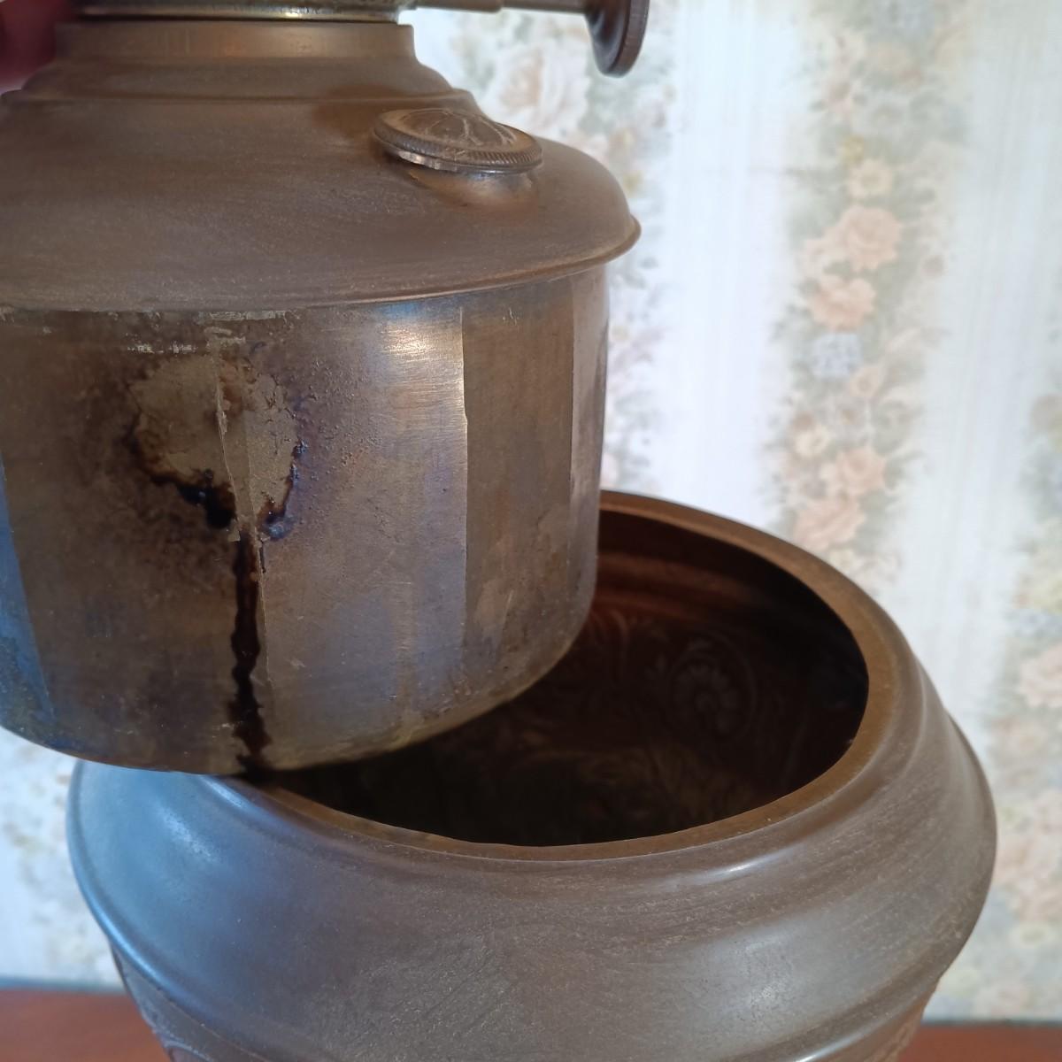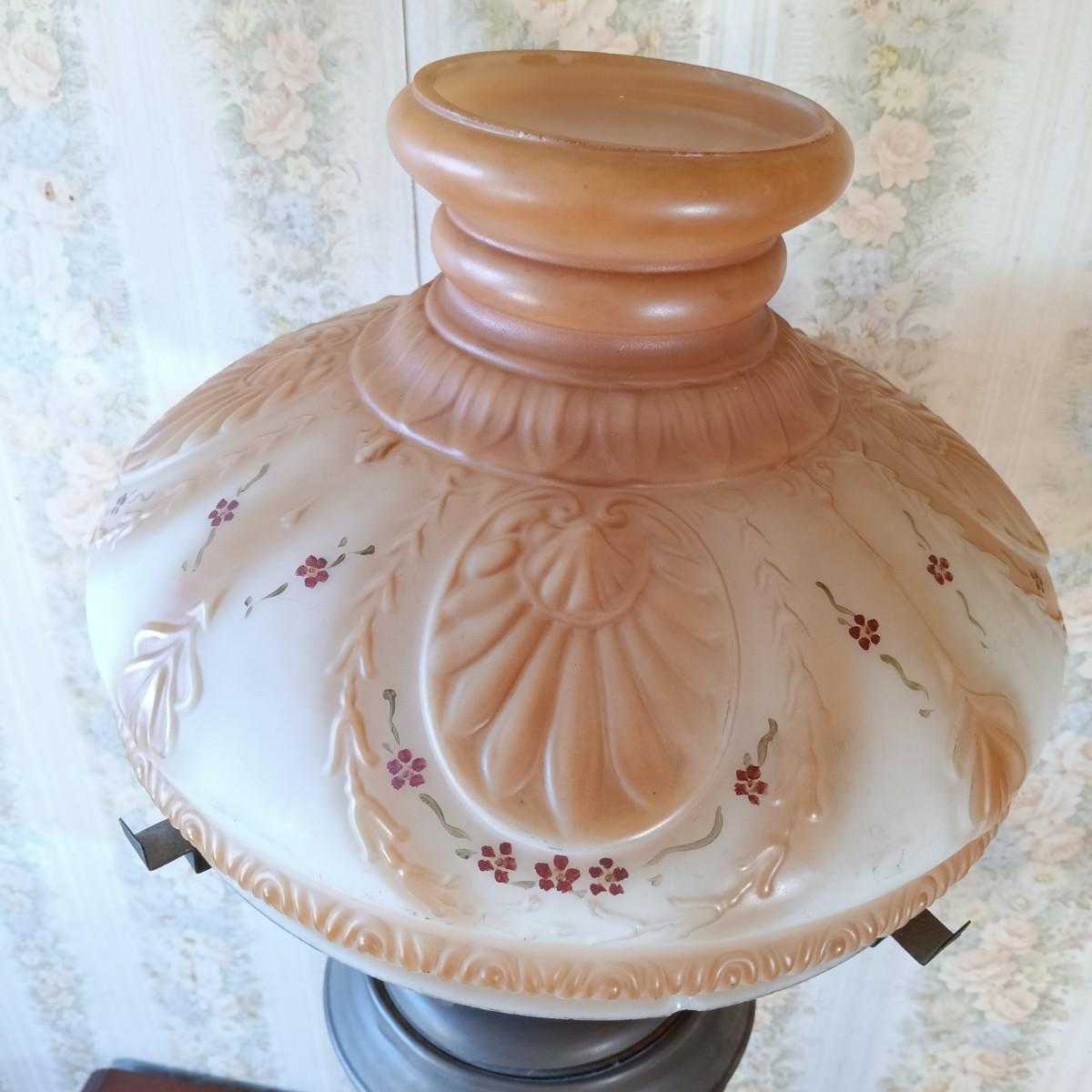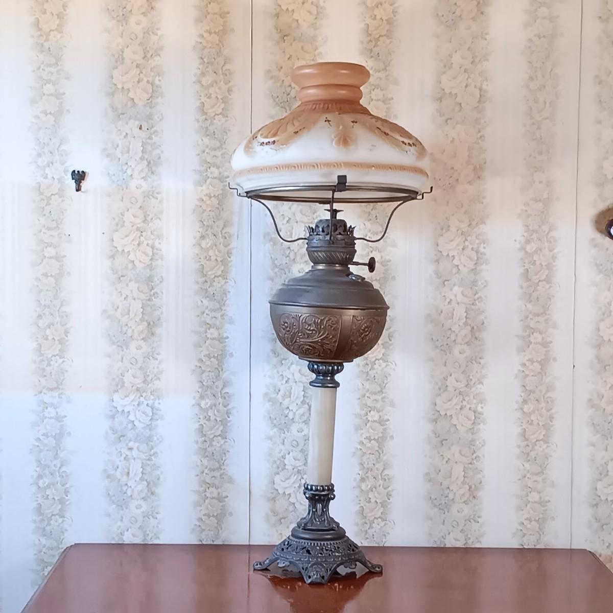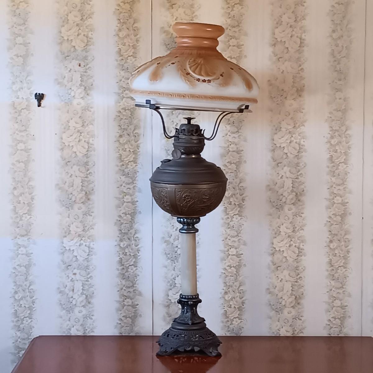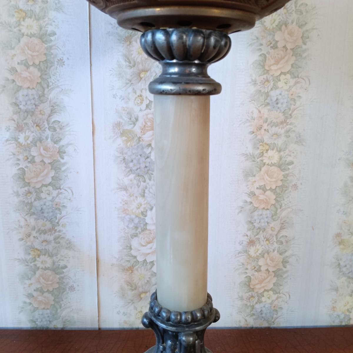 LOT 383: Victorian-Style Brass and Stone Oil Lamp with Glass Shade