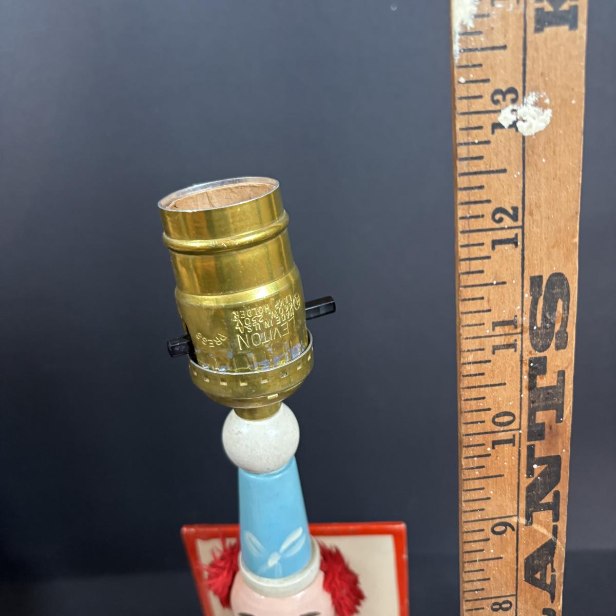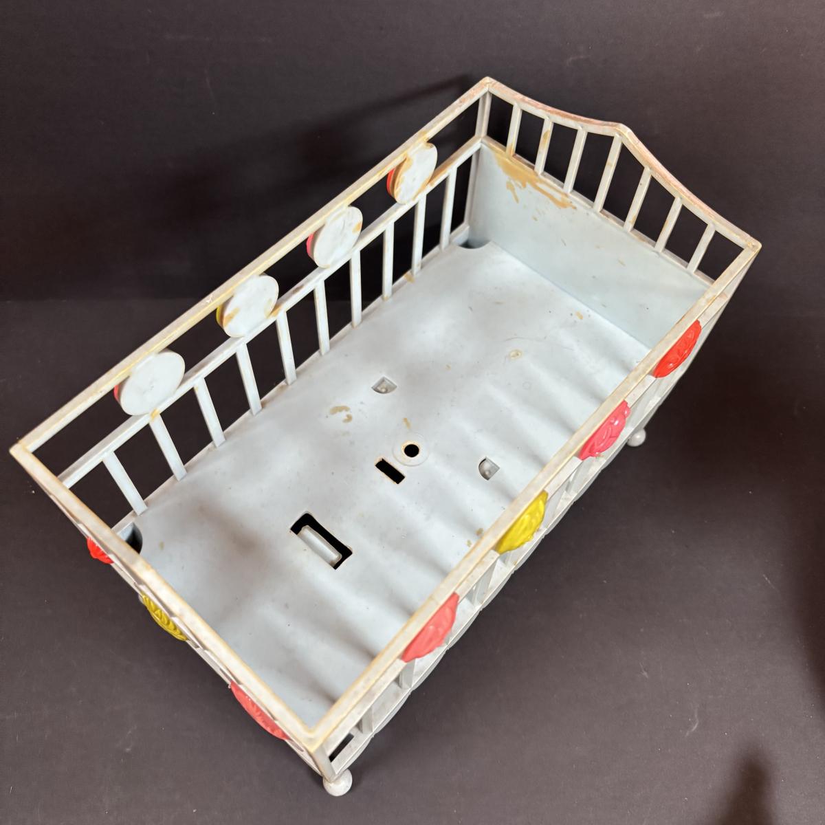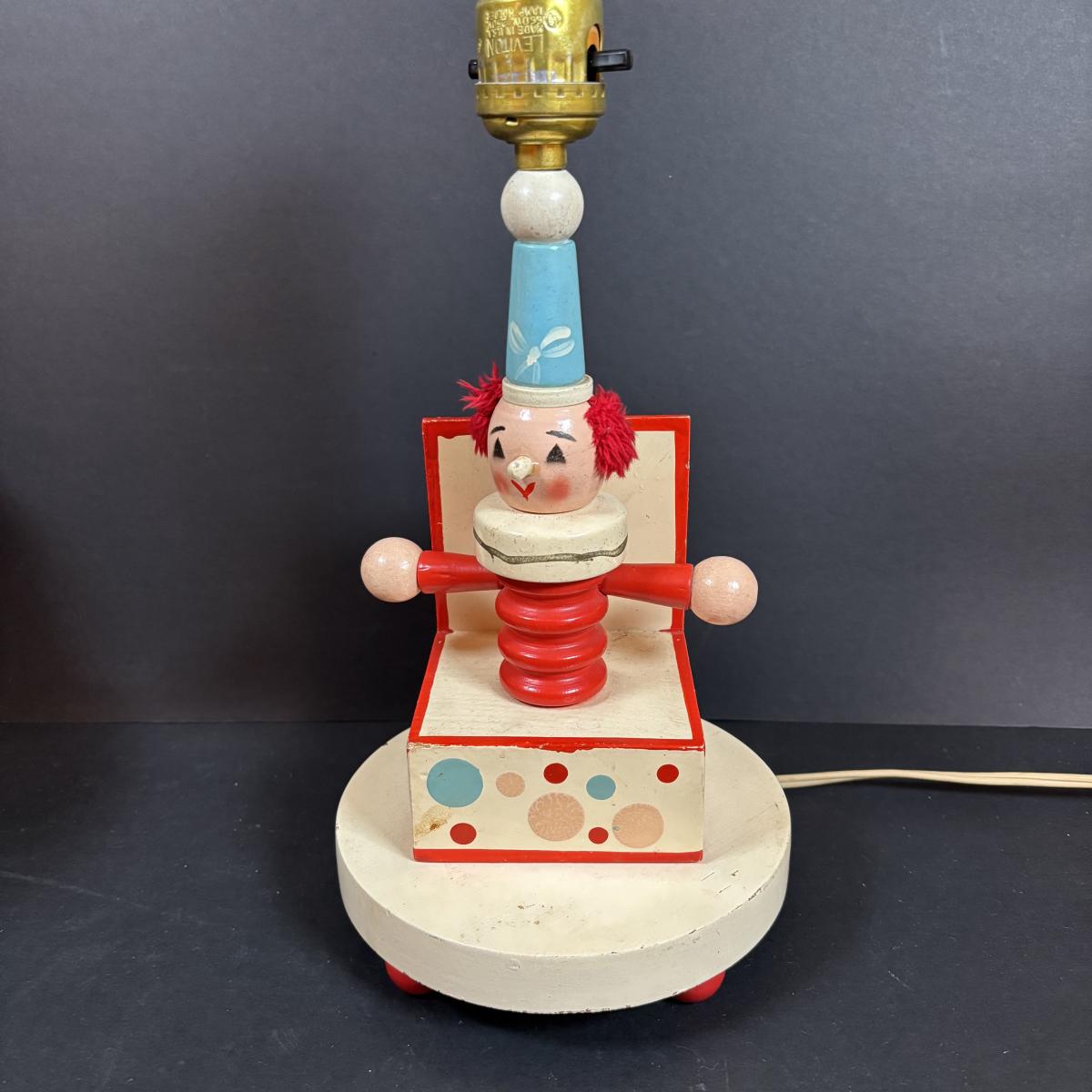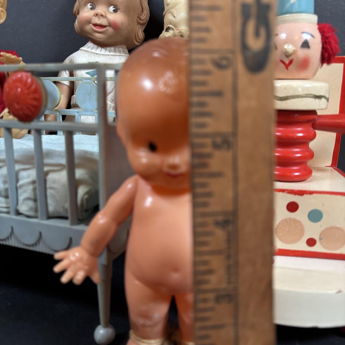 LOT 406: Vintage Doll Collection: Irwin Kewpie Doll, Plastic Doll w/Sleepy Eyes, Blue Doll Crib, Rubber Salvation Army Doll, Squeaky Clown & Wooden Jack in the Box Nursery Lamp