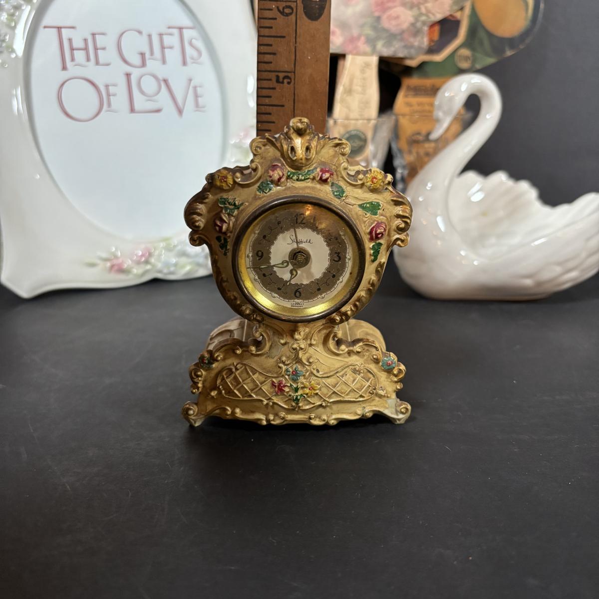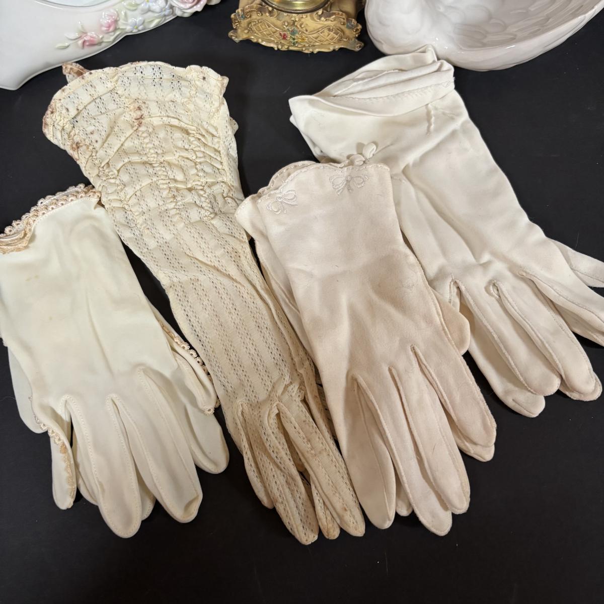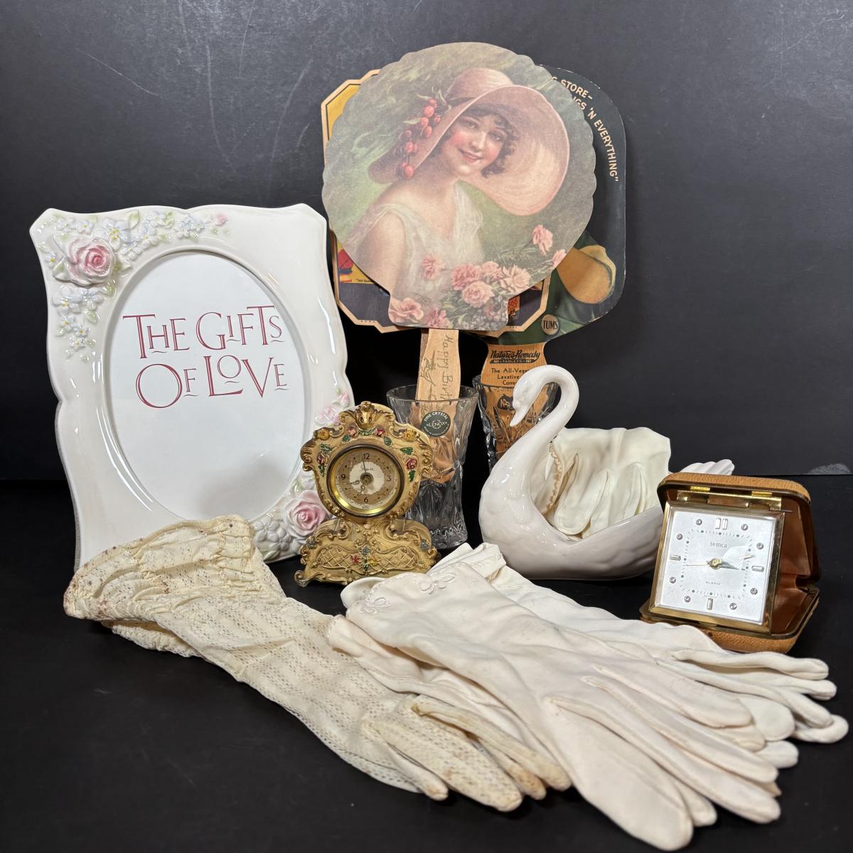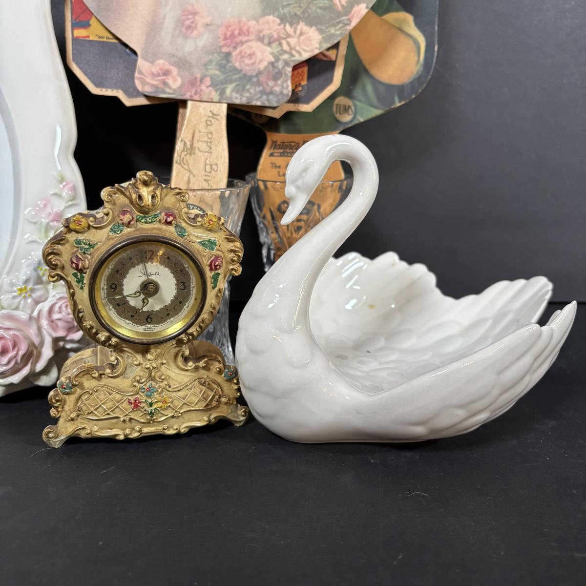 LOT 413: Goebel W. Germany White Swan ZV161 Candy Dish, Semca Travel Rhinestone Alarm Clock-Germany, Sheffield Clock-Germany, Lenox Crystal Vases, Paper Advertising Fans, Ladies Gloves & More