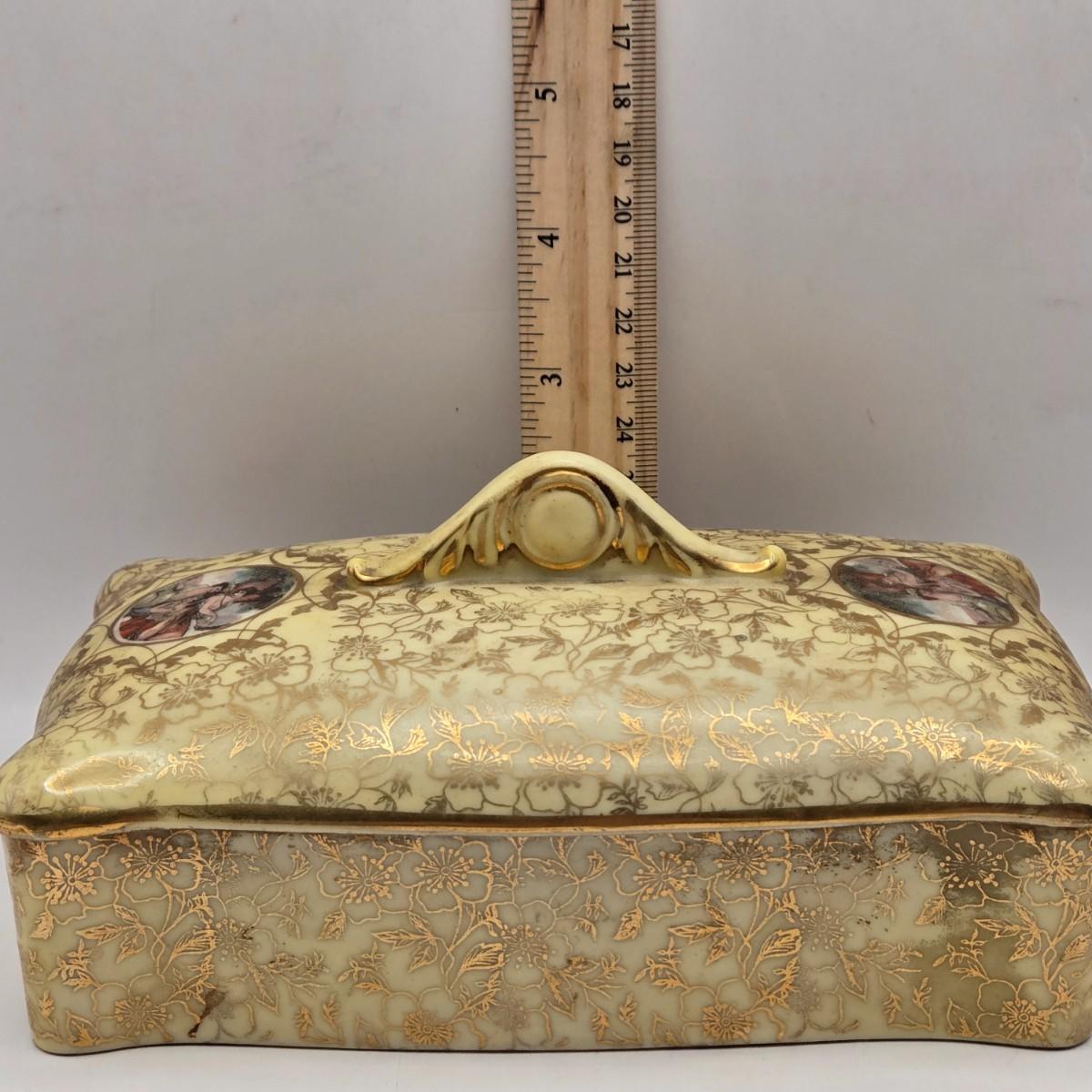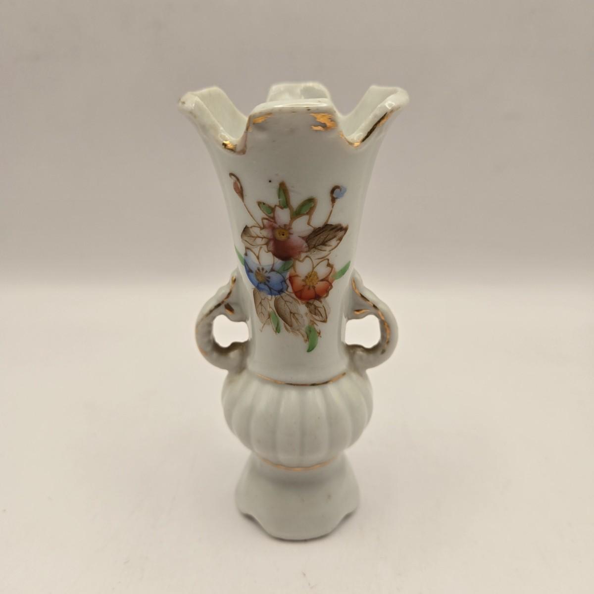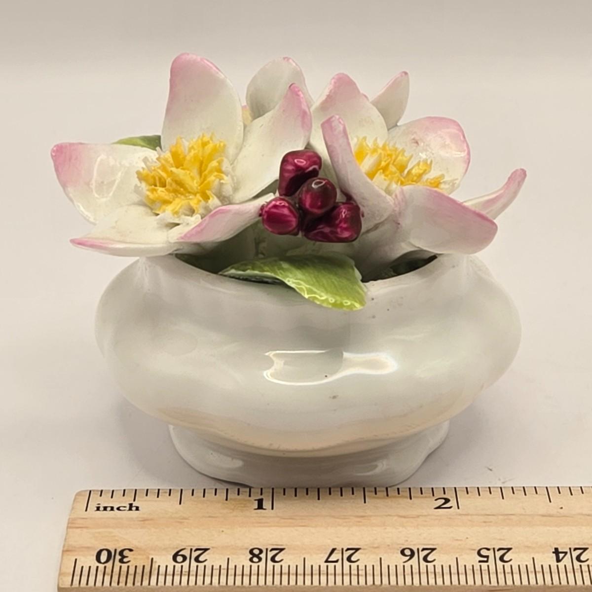 LOT 47K: Victorian Double Handled Bud Vase, Vintage Enesco Bud Vase, Small Asian Style Bud Vase, Royal Albert Christmas Rose, & Vintage M&R Trinket Box