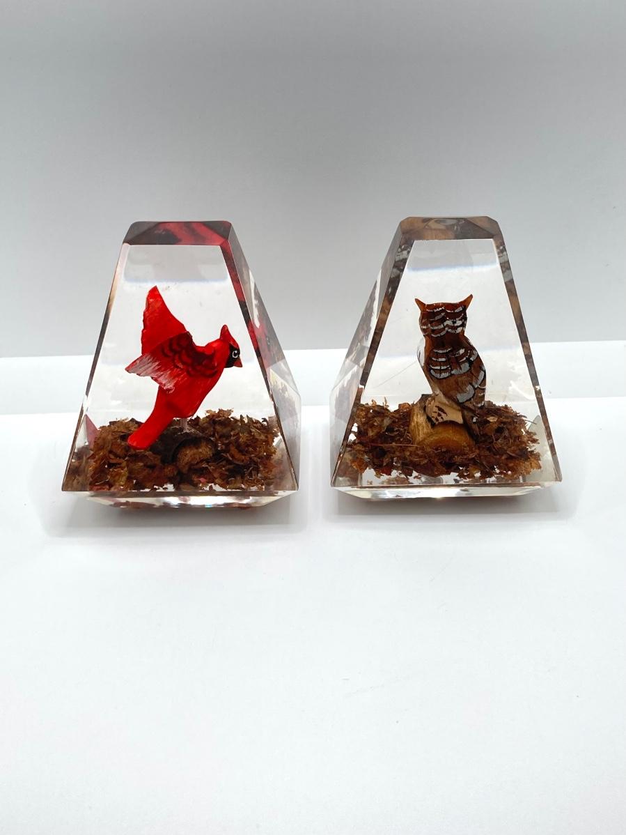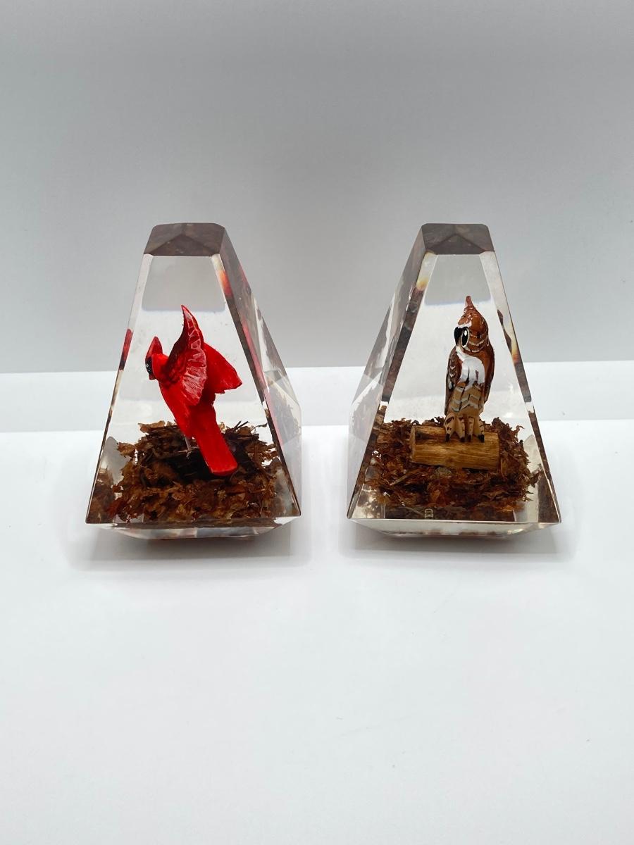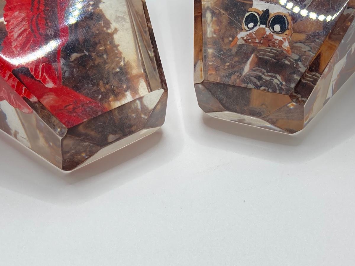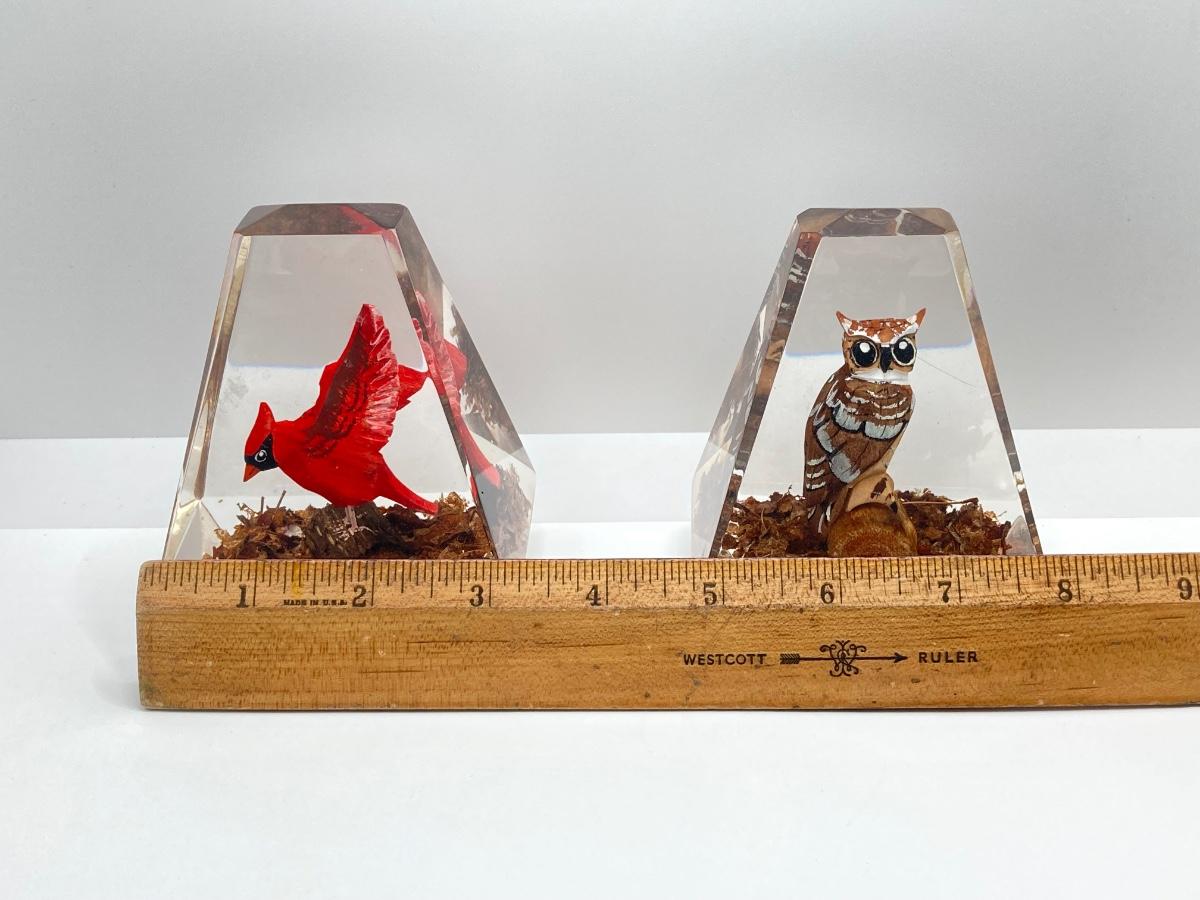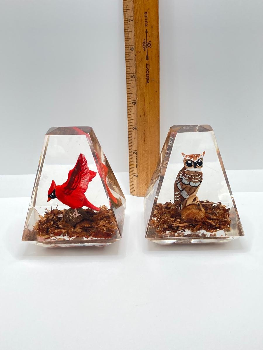 LOT 45K: Hand Carved Wooden Cardinal and Owl Lucite (Made in Canada) Paperweights