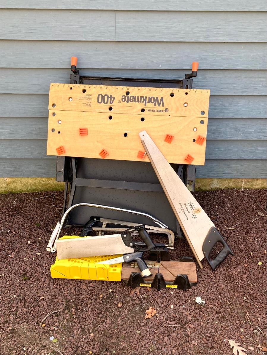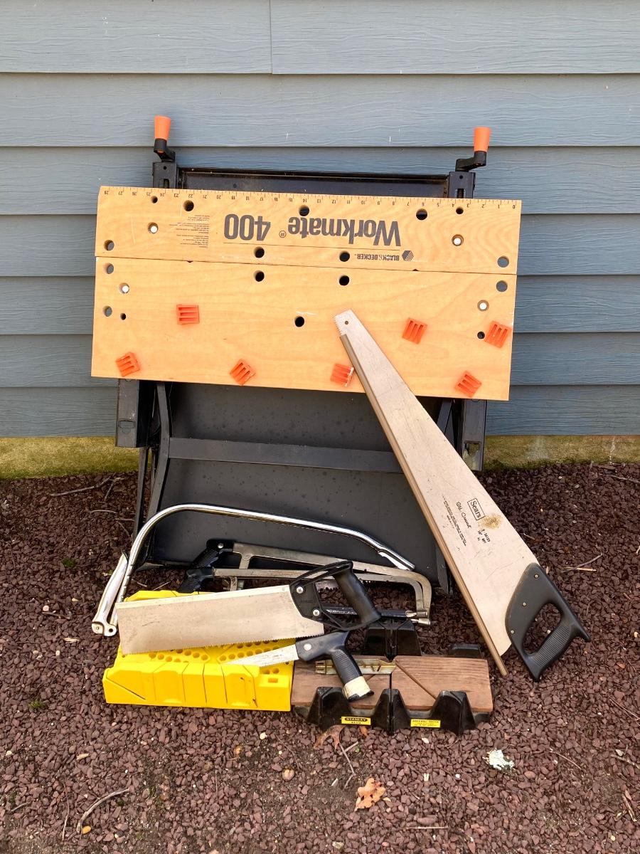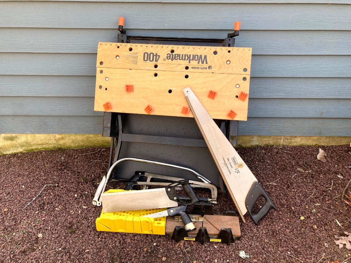 LOT 47G: Black & Decker 400 Workmate Work Bench, Miter Boxes and Assorted Hand Saws