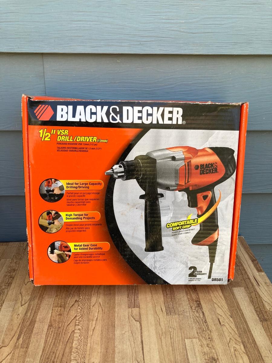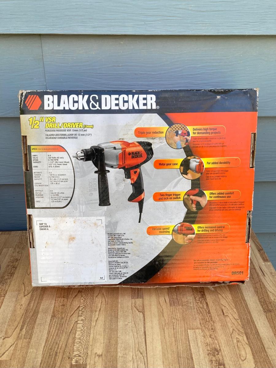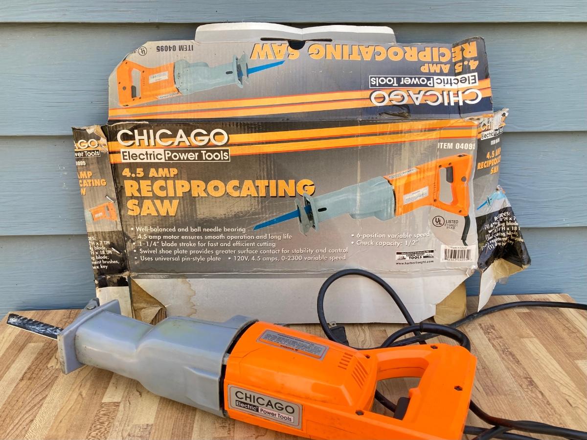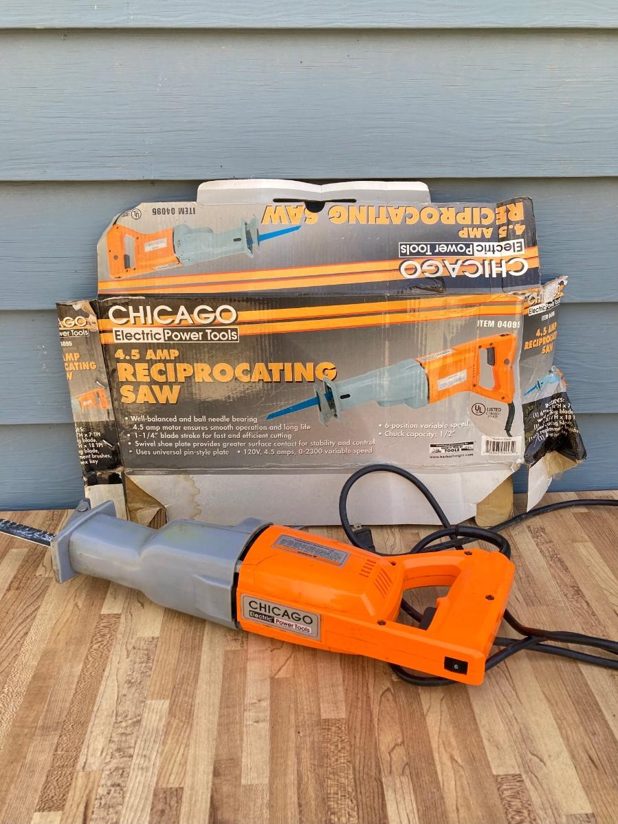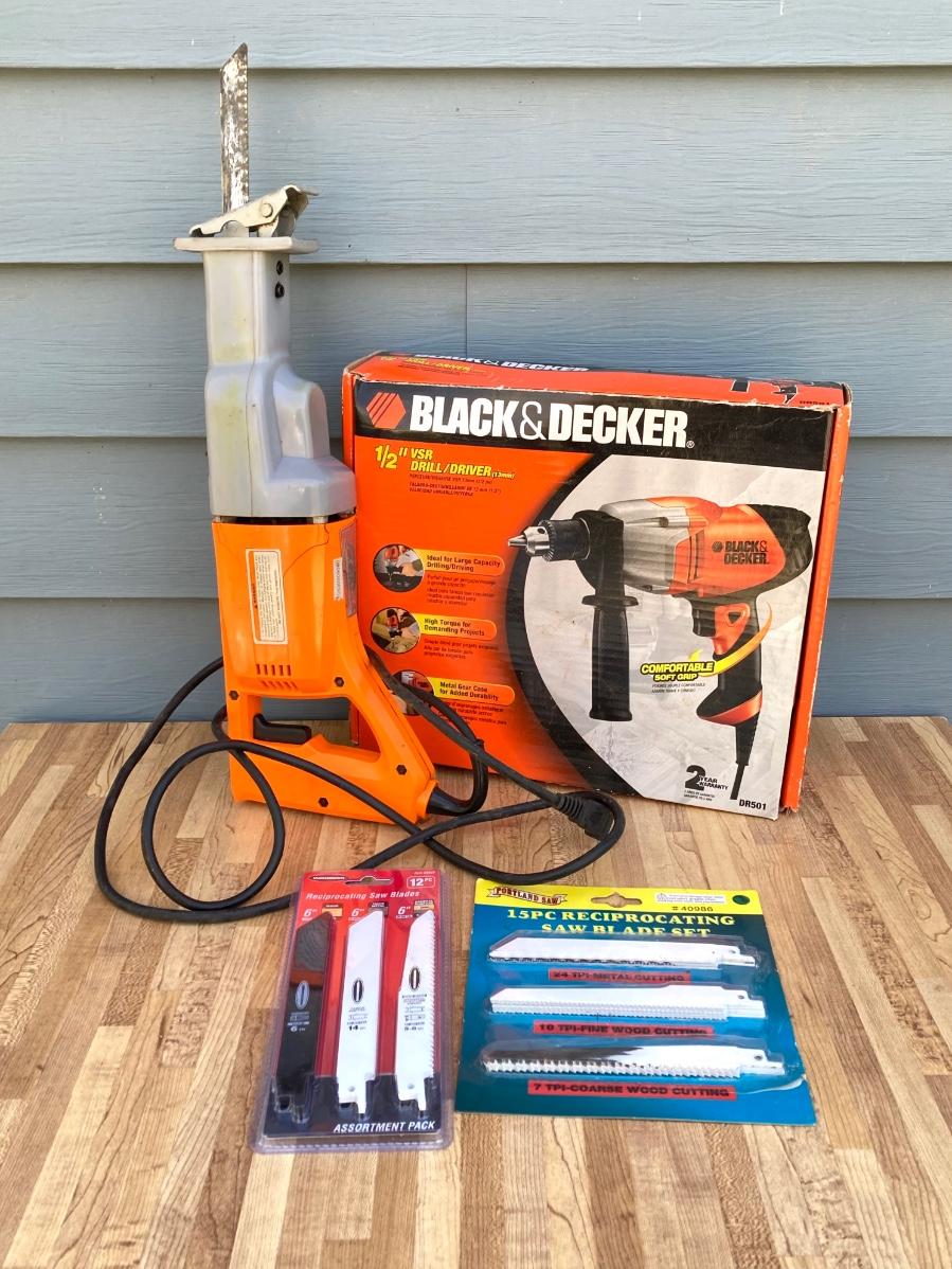 LOT 59G: Black & Decker Drill / Driver DR501 in Original Box, Chicago Reciprocating Saw Item 4095 and Packages of Saw Blades