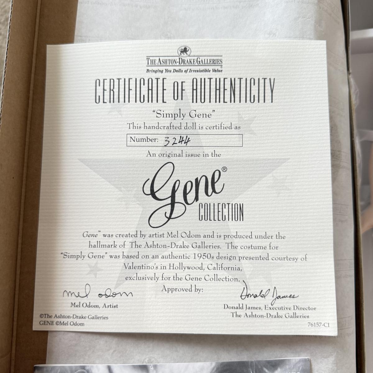 LOT 65L: Ashton-Drake Galleries Mel Odom Gene "Simply Gene" Doll w/ COA & Box (3244) & NIP Gene Costume