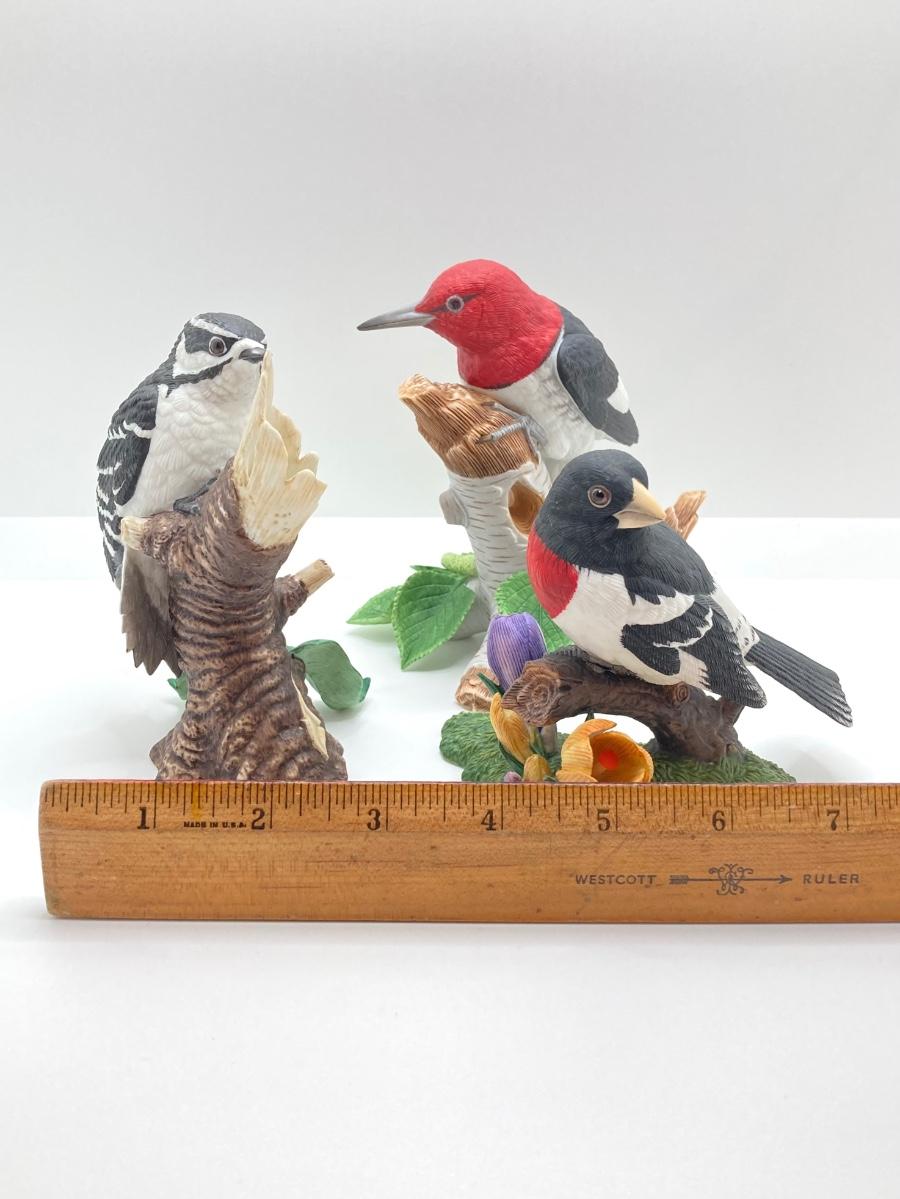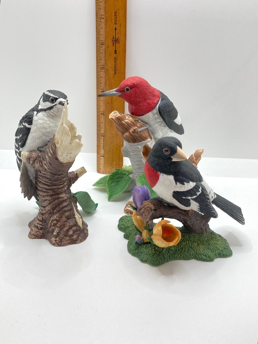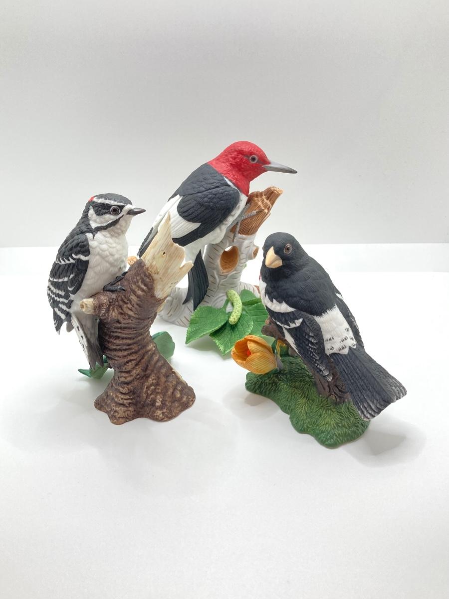 LOT 78K: Collection of Lenox Fine Porcelain Bird Figurines - Red-headed Woodpecker, Downy Woodpecker and Rose-breasted Grosbeak