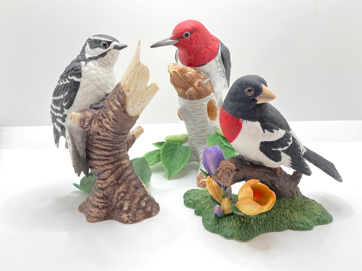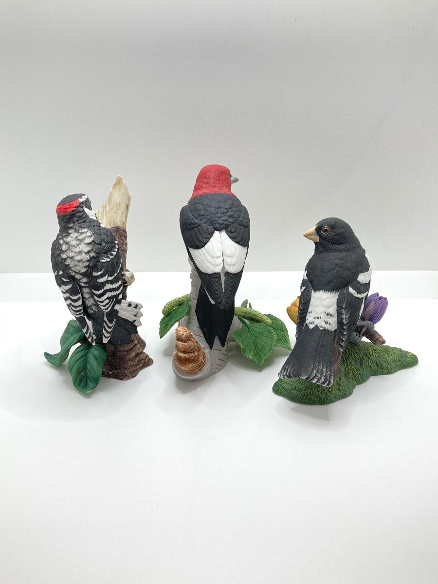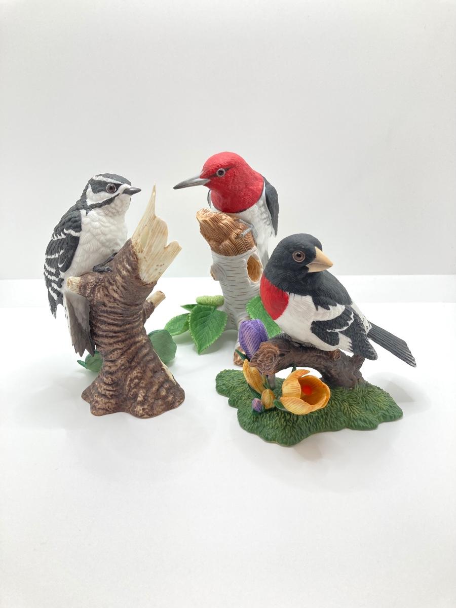 LOT 78K: Collection of Lenox Fine Porcelain Bird Figurines - Red-headed Woodpecker, Downy Woodpecker and Rose-breasted Grosbeak