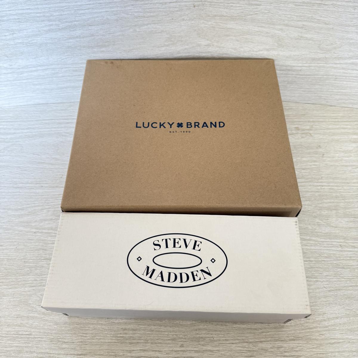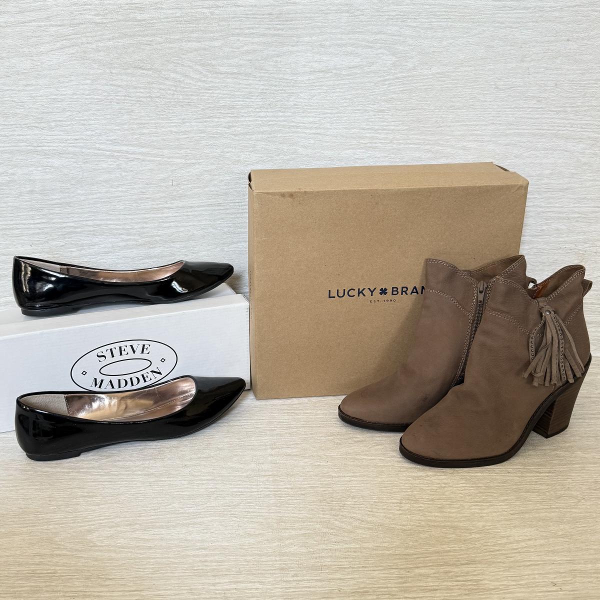 LOT 199D: Ladies' Shoes w/ Boxes: Lucky Brand Brindle Bridgetown Boodies (7) & Steve Madden Patent Leather Flats (7.5)