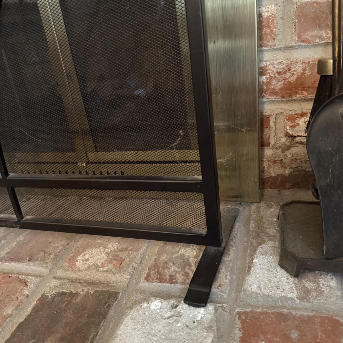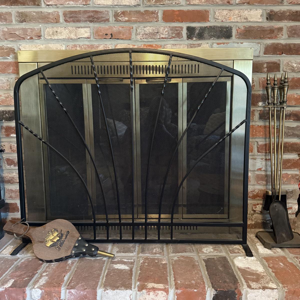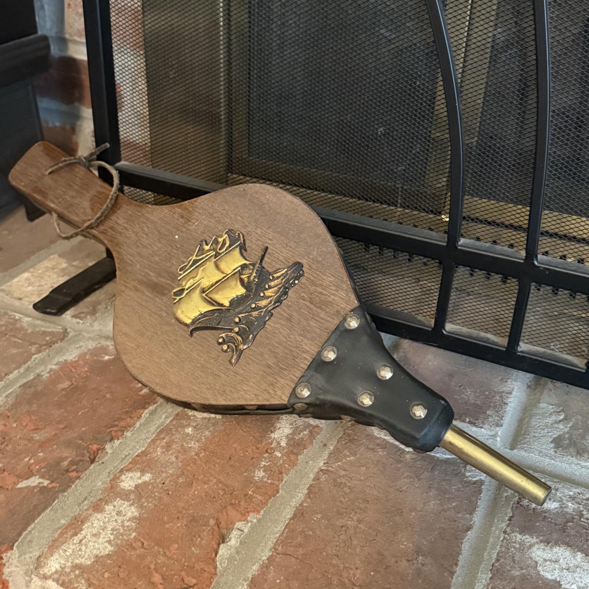 LOT 287F: Fireplace Screen, Tools & Vintage Bellows w/ Ship Motif