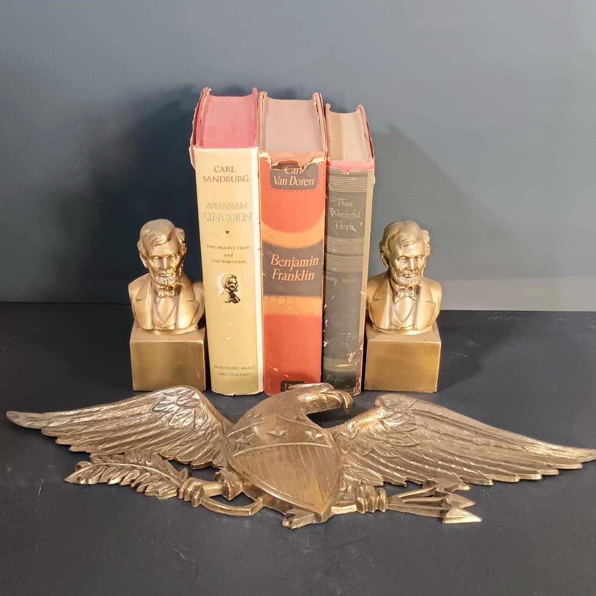LOT 26: Vintage Brass Eagle Plaque, Philadelphia Mfg. Co. Lincoln Bronze Busts & Books