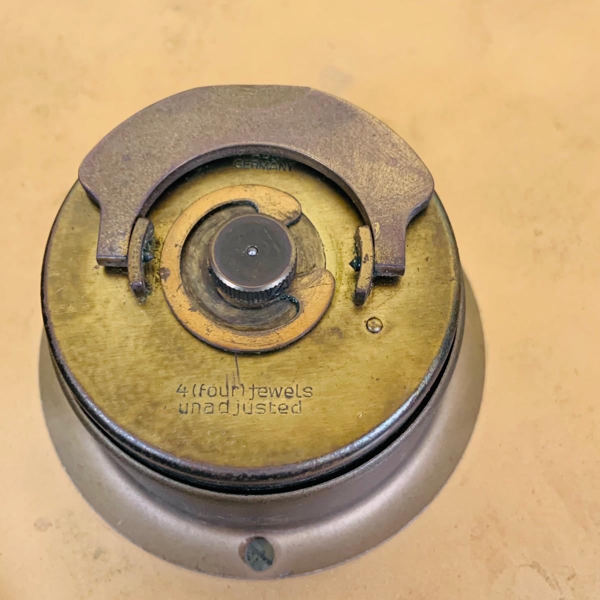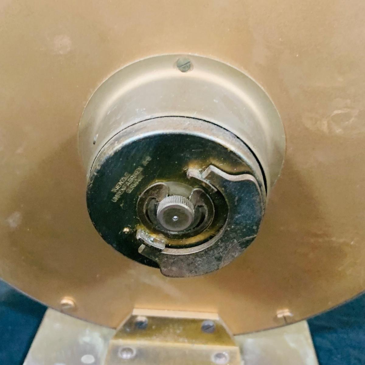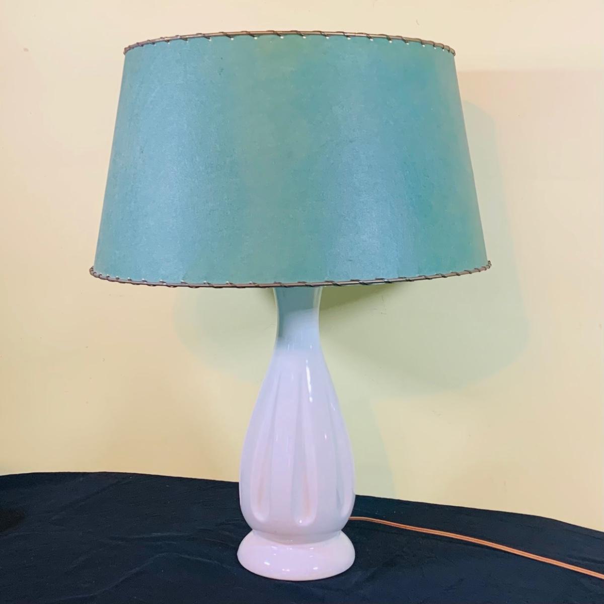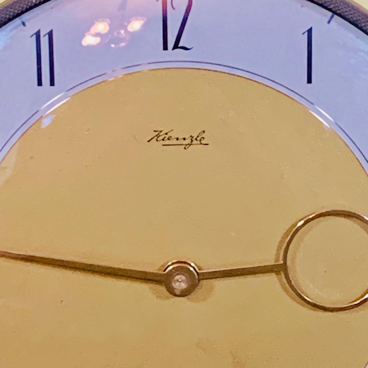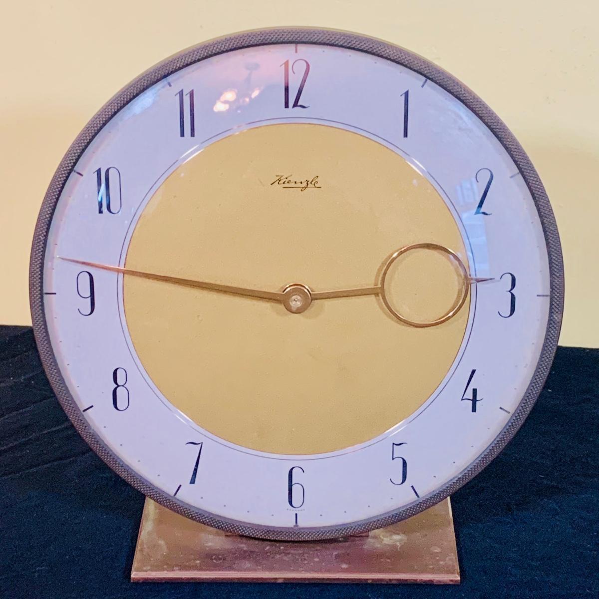 LOT 35: Art Deco Style Wind-up Mechanical Kienzle Brass Desk Clock and a White Ceramic MCM Table Lamp with Teal Colored Shade