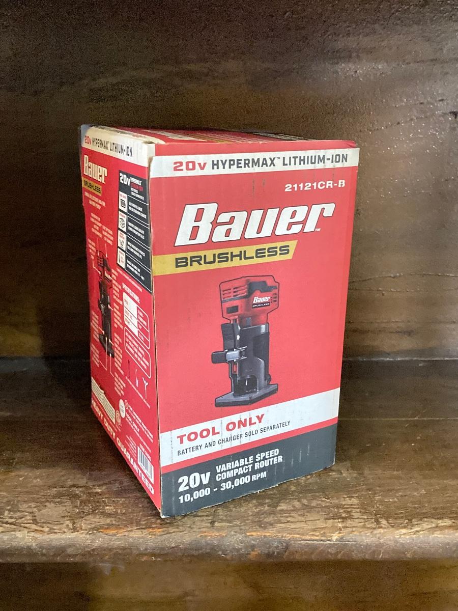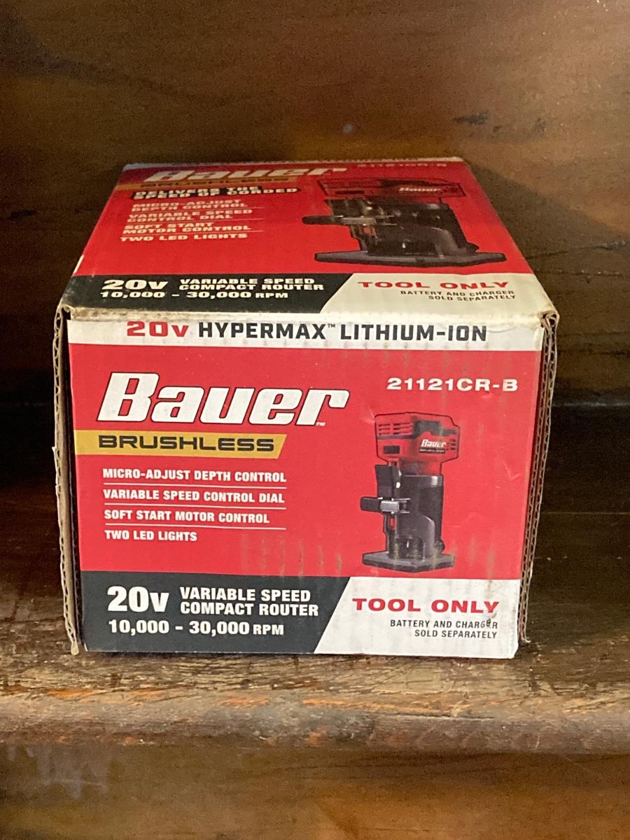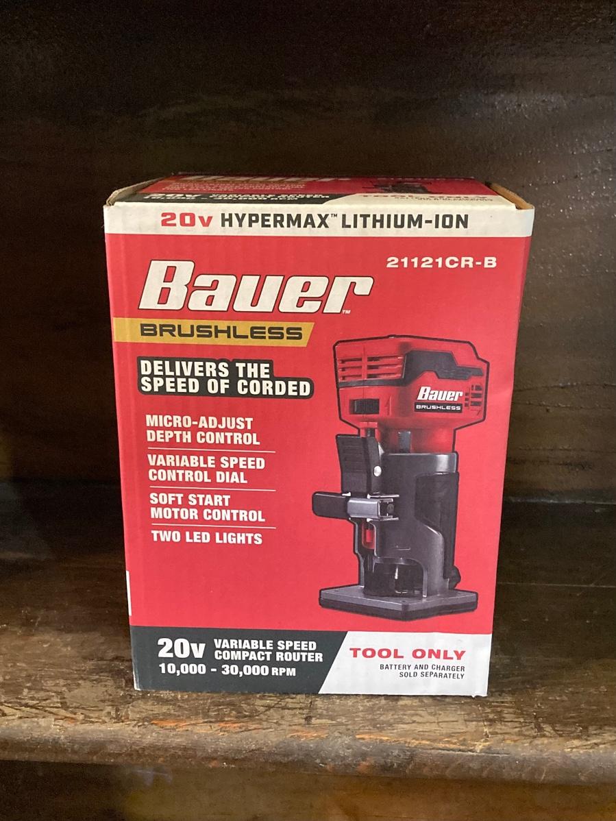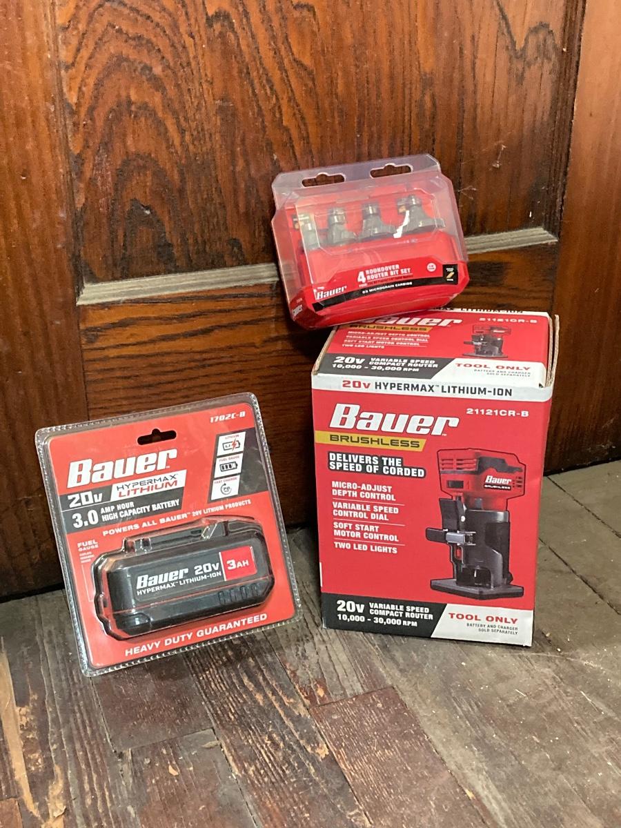 LOT 56: Bauer Cordless Compact Brushless Router, 20v Battery and 4 Roundover Router Bit Set (New in Package)