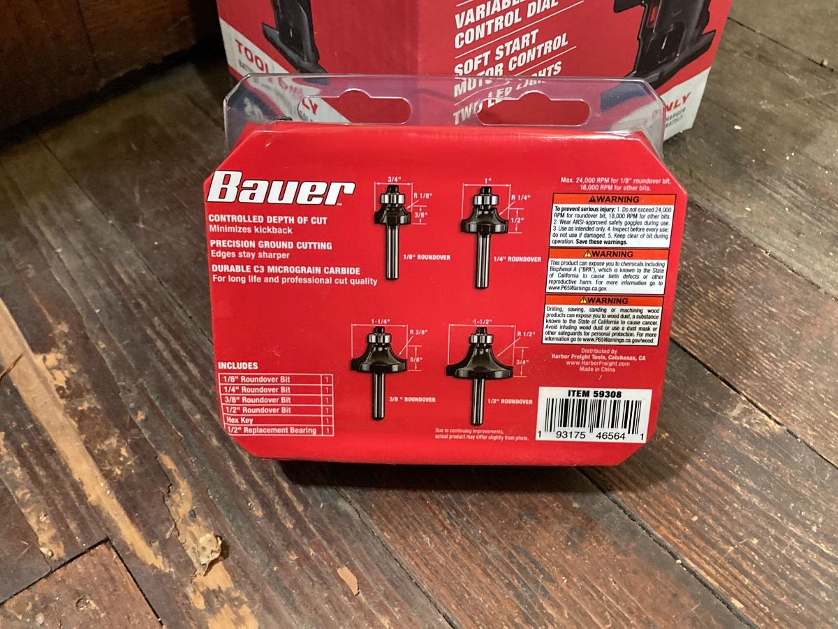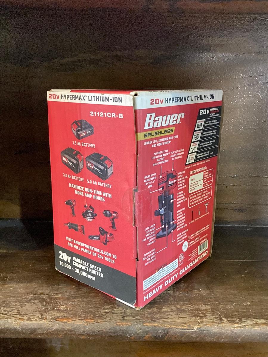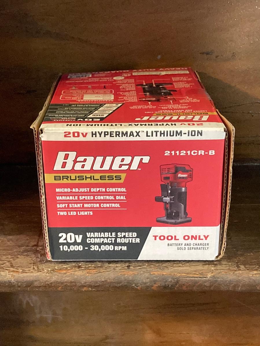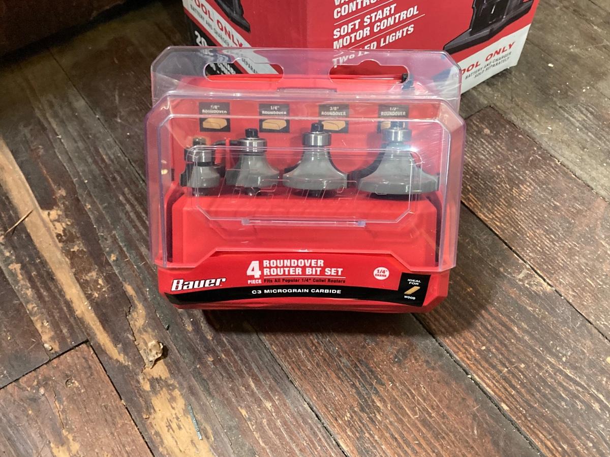 LOT 56: Bauer Cordless Compact Brushless Router, 20v Battery and 4 Roundover Router Bit Set (New in Package)