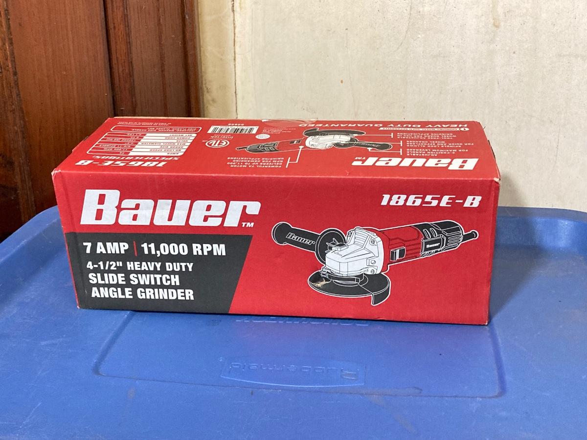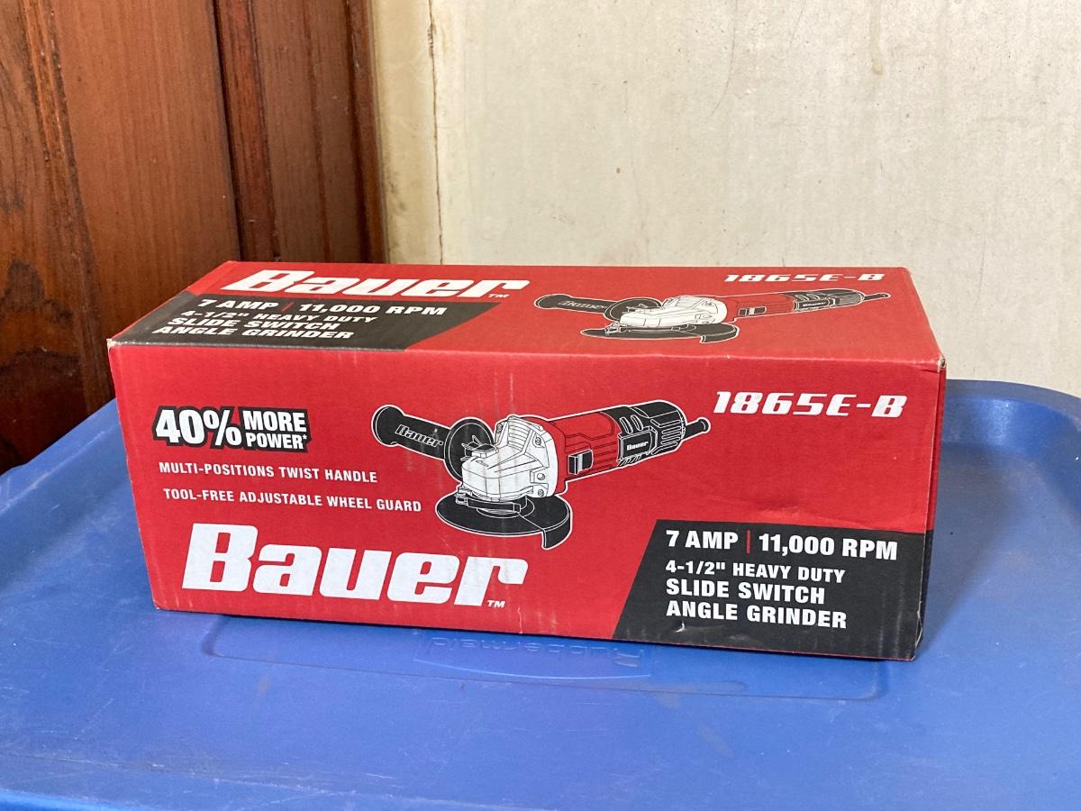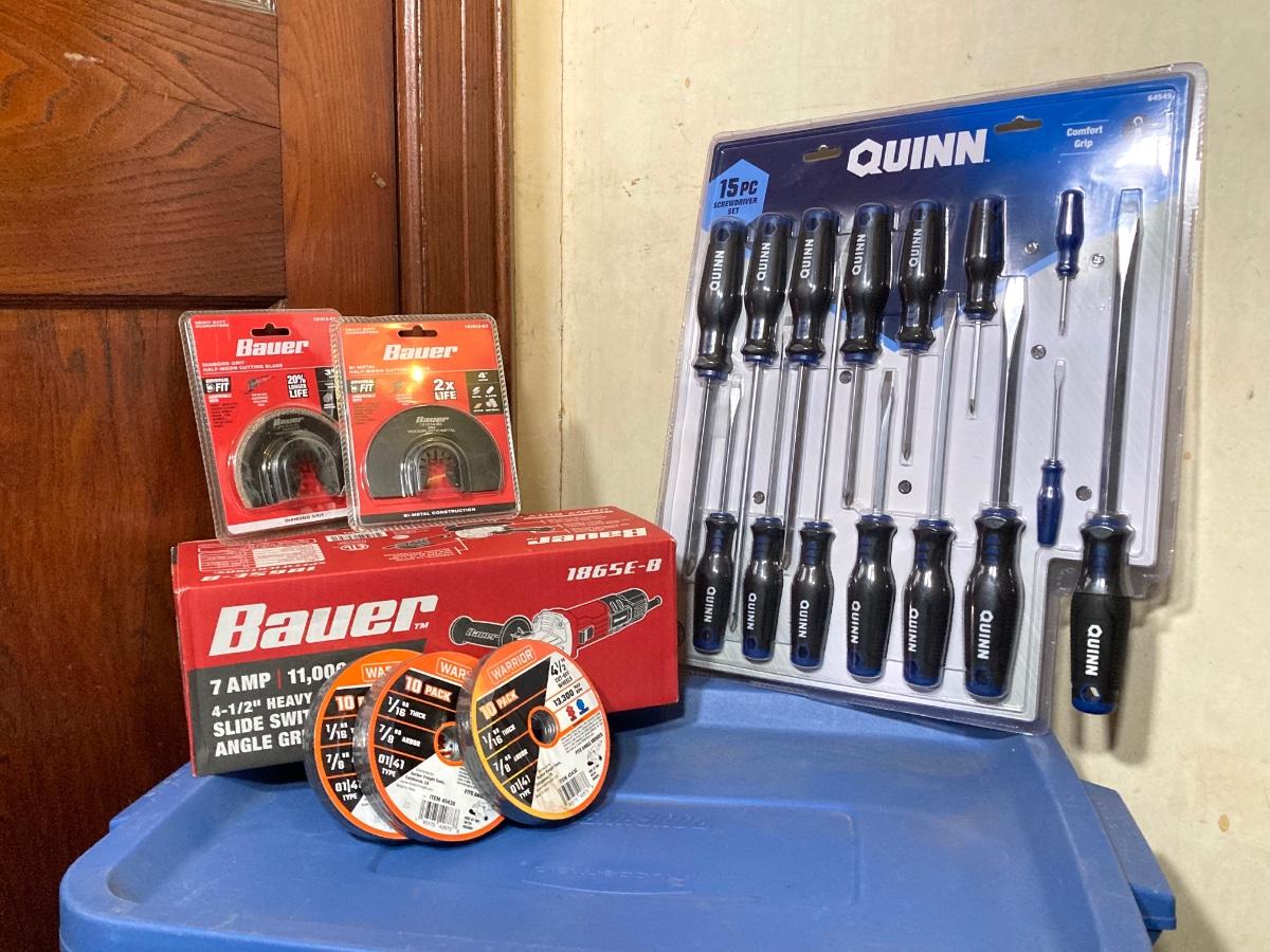LOT 57: Bauer 4 1/2 Inch Heavy Duty Slide Switch Angle Grinder, Blades, Warrior Cut Off Wheels and Quinn 15 Piece Screwdriver Set (New in Package)