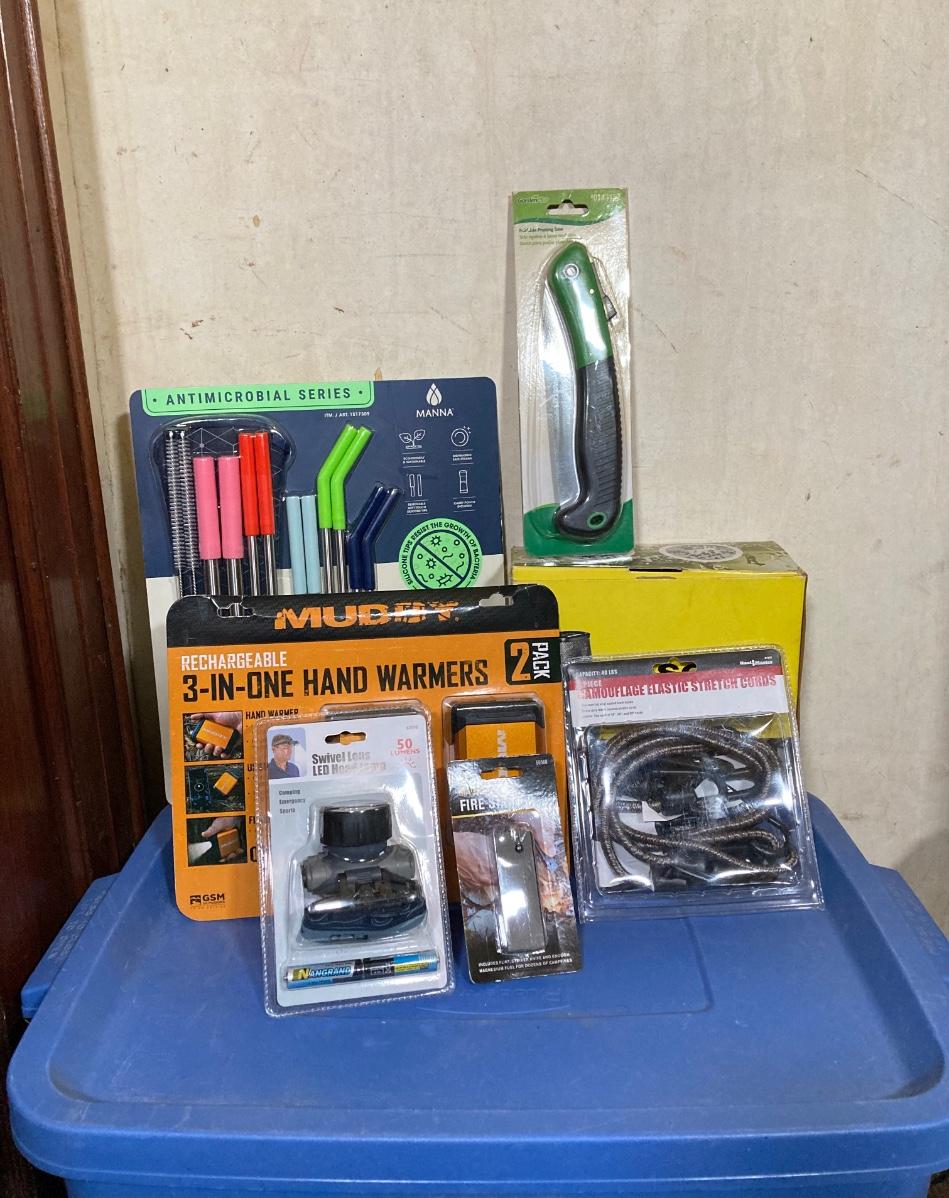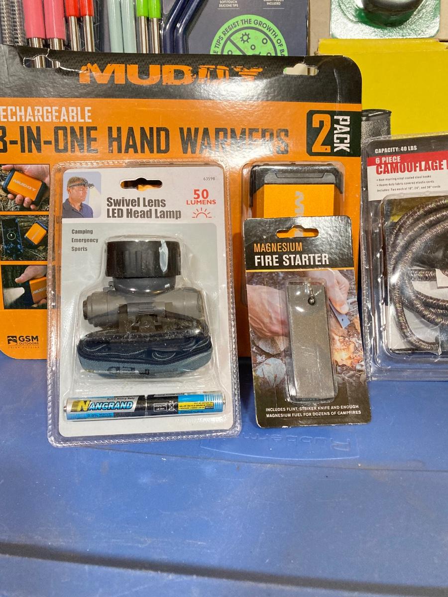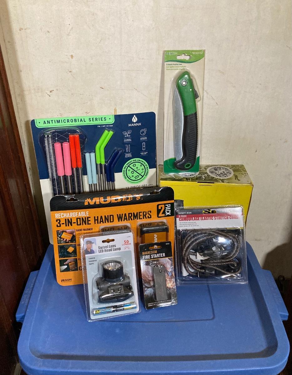 LOT 63: New in Package and More - Muddy Hand Warmers, Pruning Saw, Manna Straws, Swivel Lens Head Lamp, Stretch Cords and Fire Starter