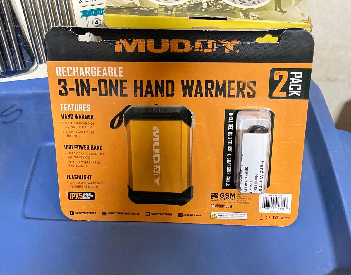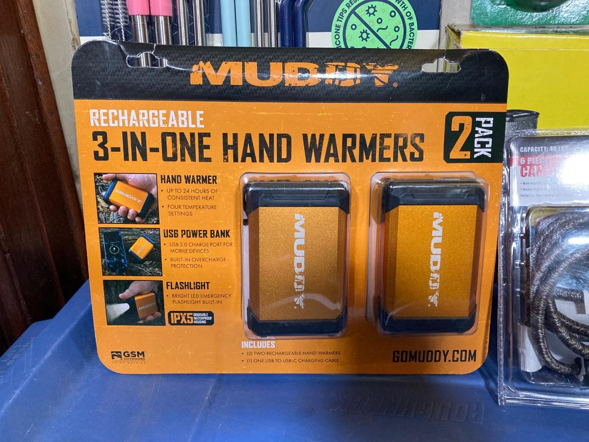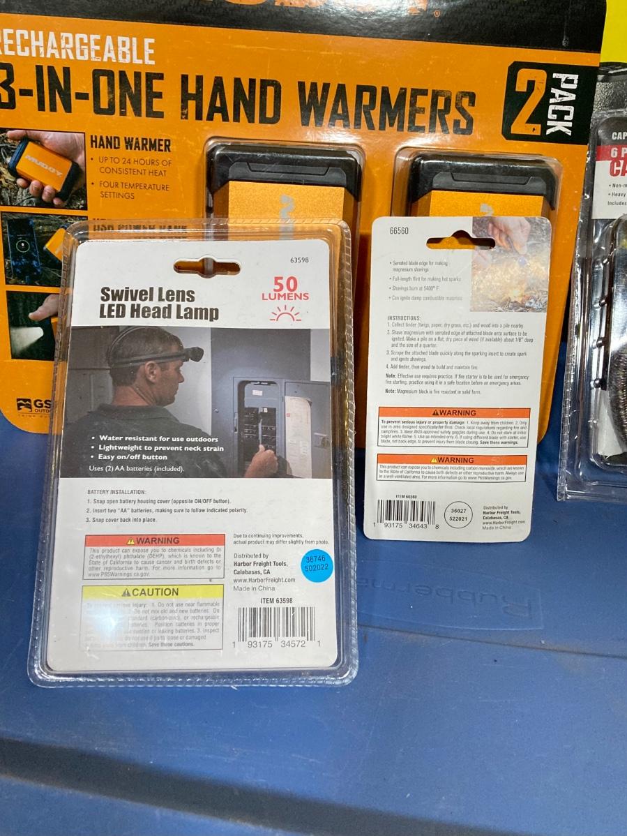 LOT 63: New in Package and More - Muddy Hand Warmers, Pruning Saw, Manna Straws, Swivel Lens Head Lamp, Stretch Cords and Fire Starter
