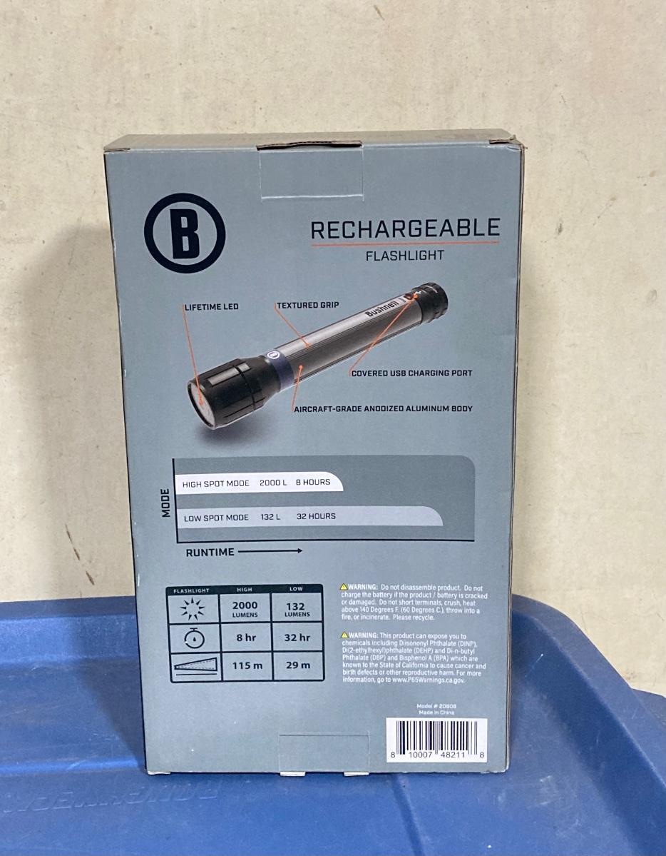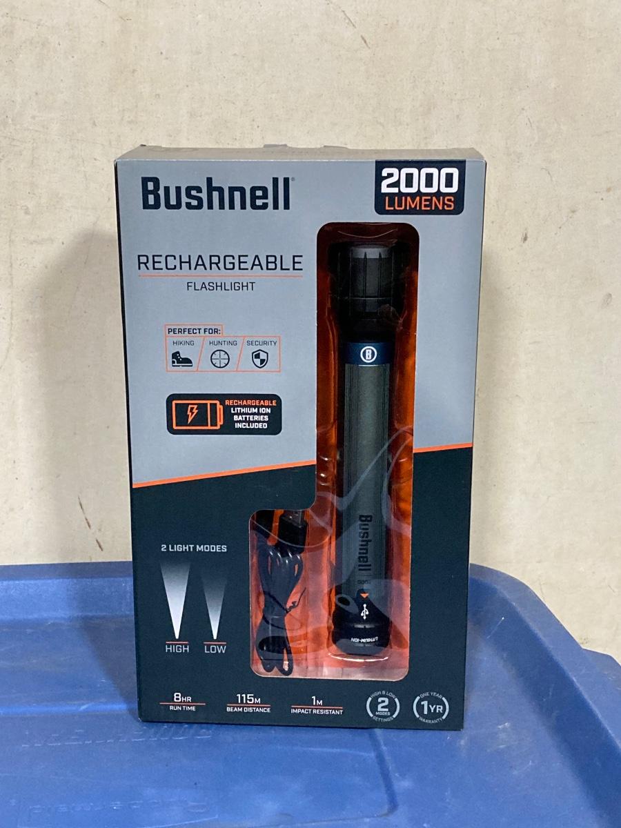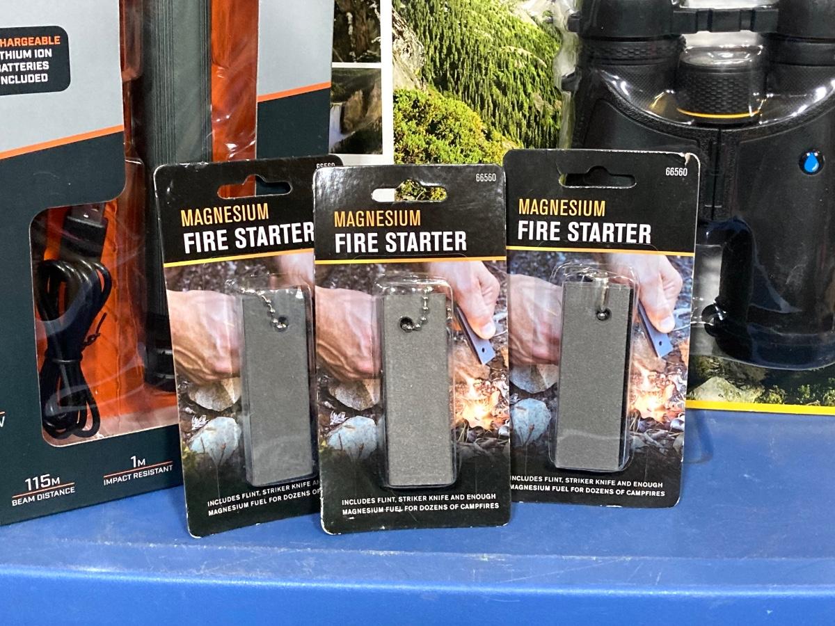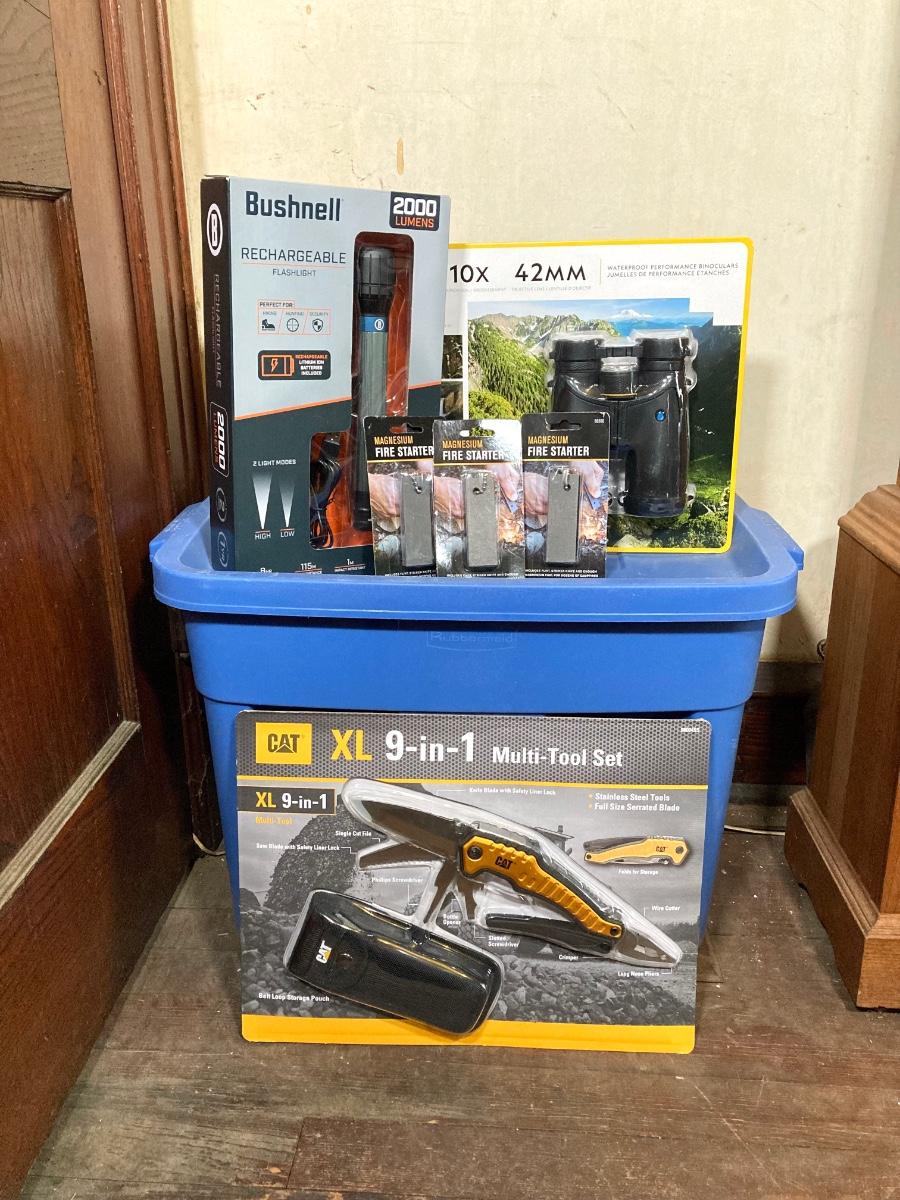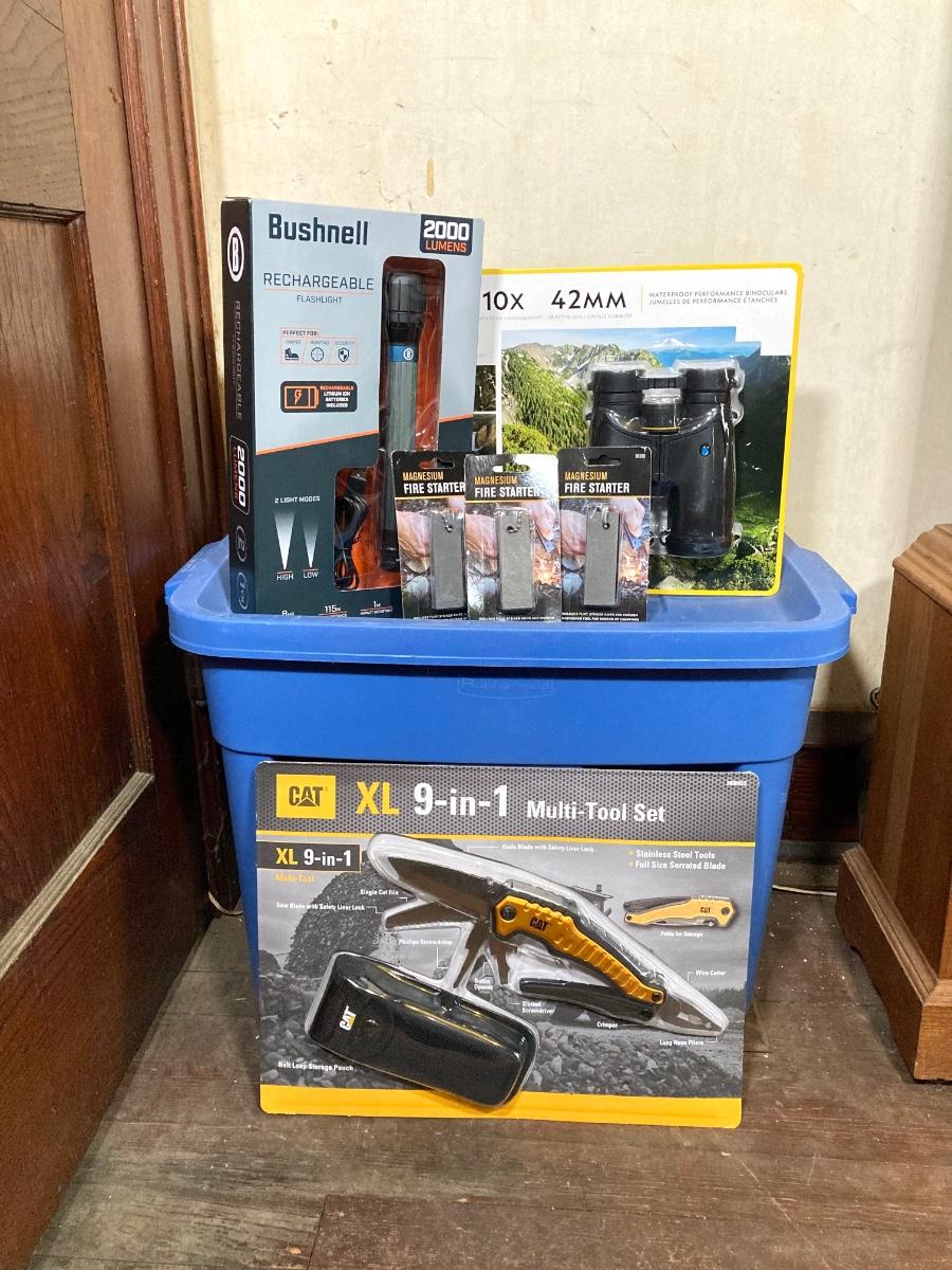 LOT 66: Bushnell Rechargeable Flashlight, CAT XL 9 in 1 Multi-Tool Set, National Geographic Binoculars and Three Magnesium Fire Starters (New in Package)