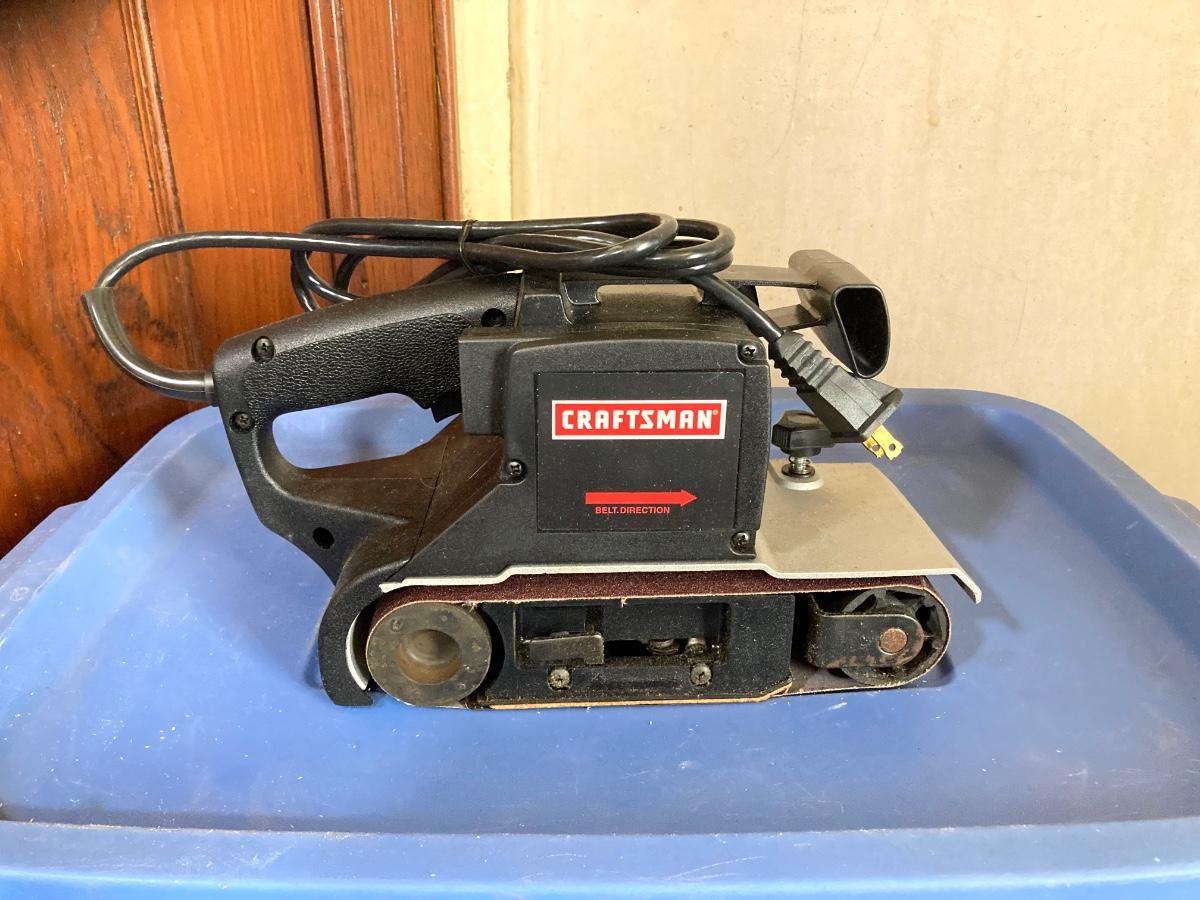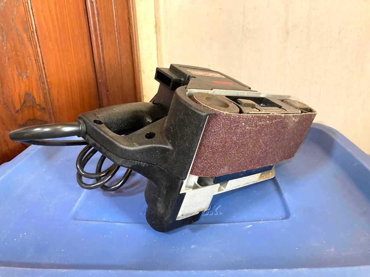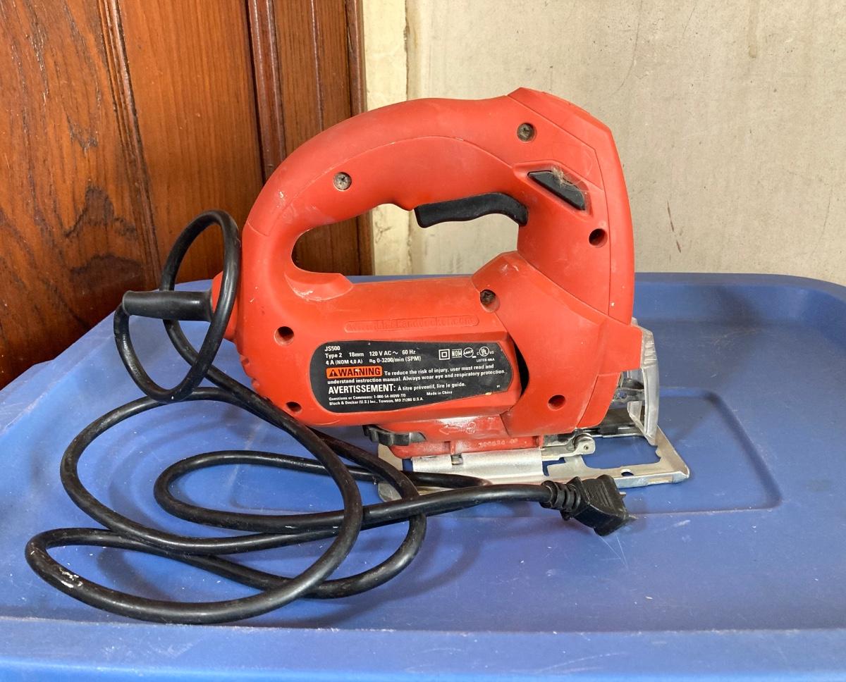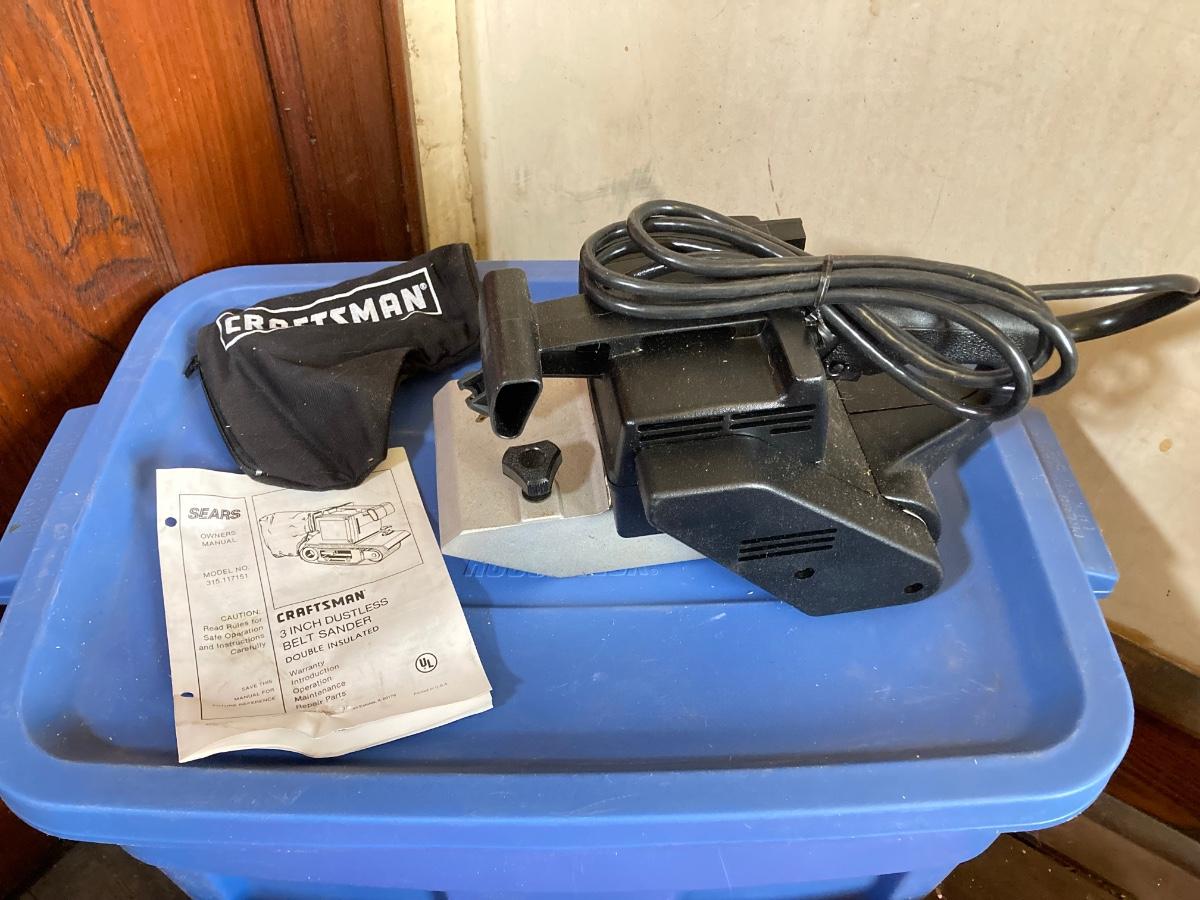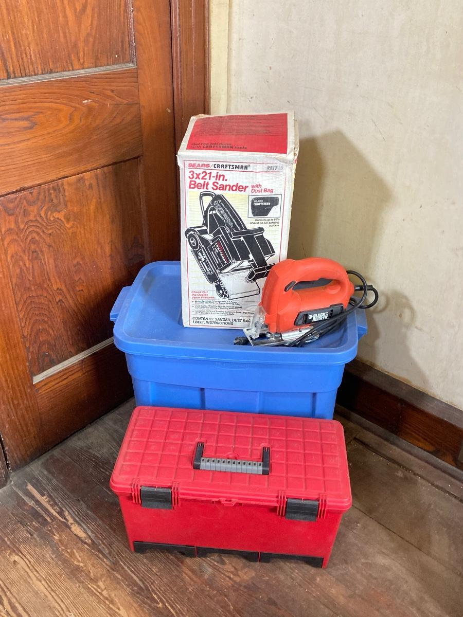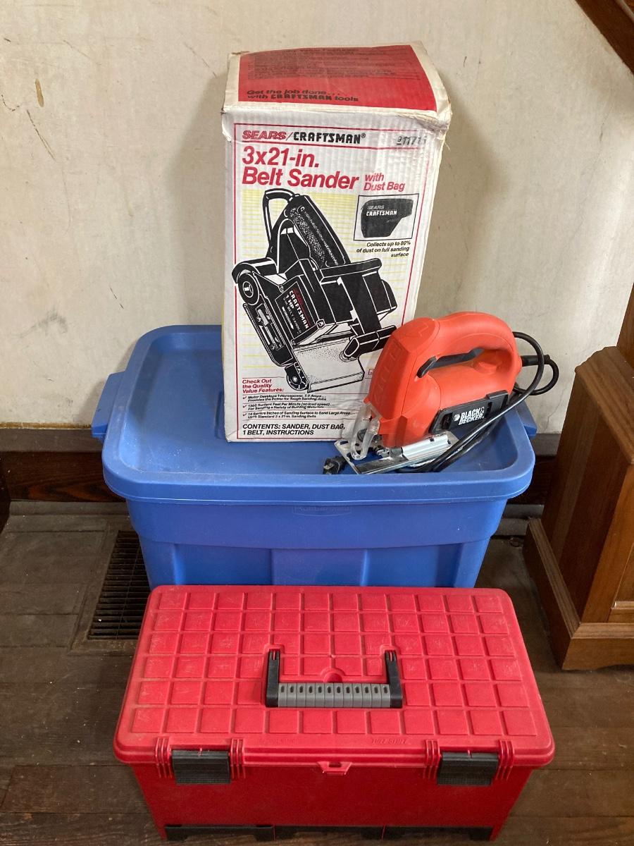 LOT 72: Sears / Craftsman Belt Sander Model # 315.117151, Black & Decker Jig Saw and Red Plastic Toolbox with Contents