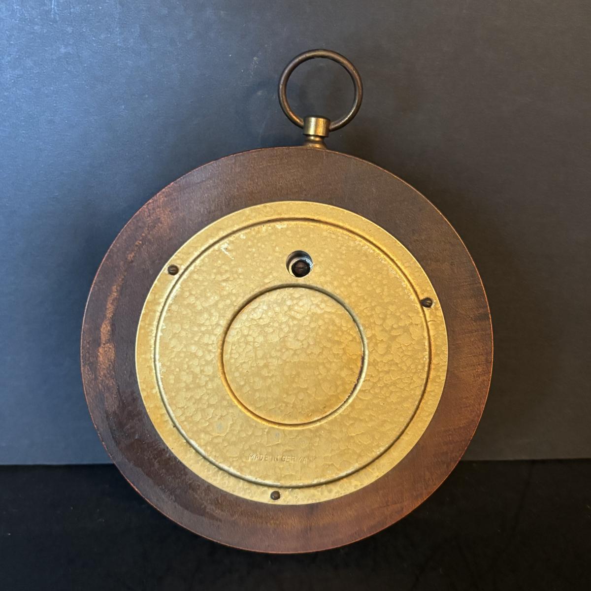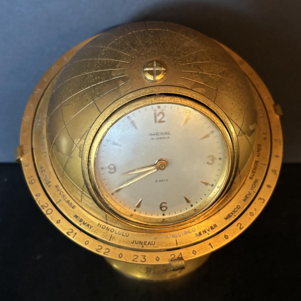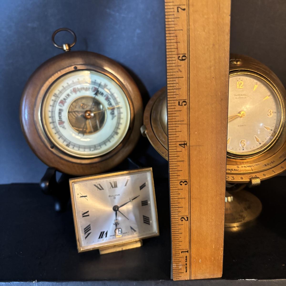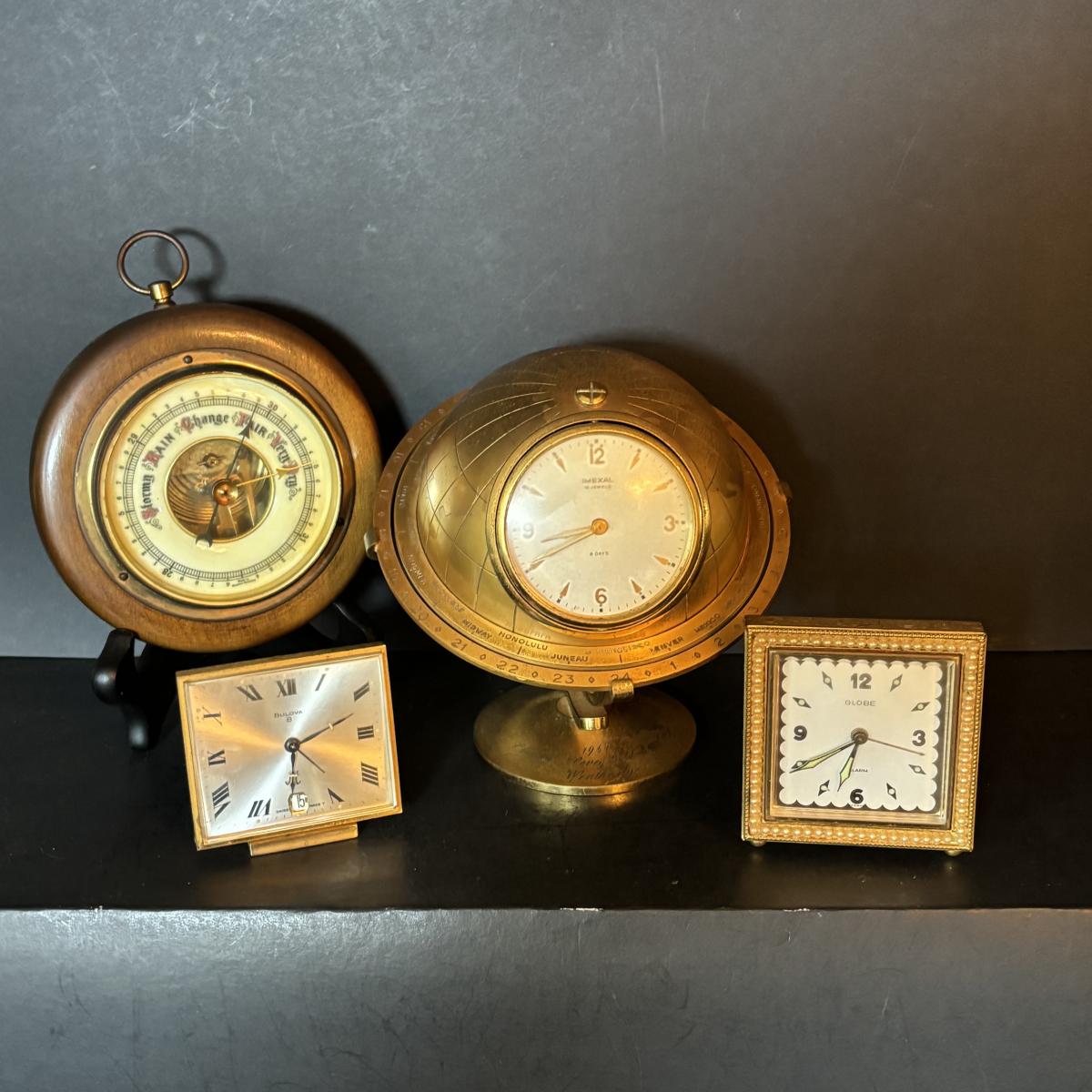 LOT 104: Vintage Imexal 18 Jewel 8-day World Clock, Florn Travel Alarm Clock, Bulova Swiss Made Alarm & Wooden Wall Barometer Made in Western Germany