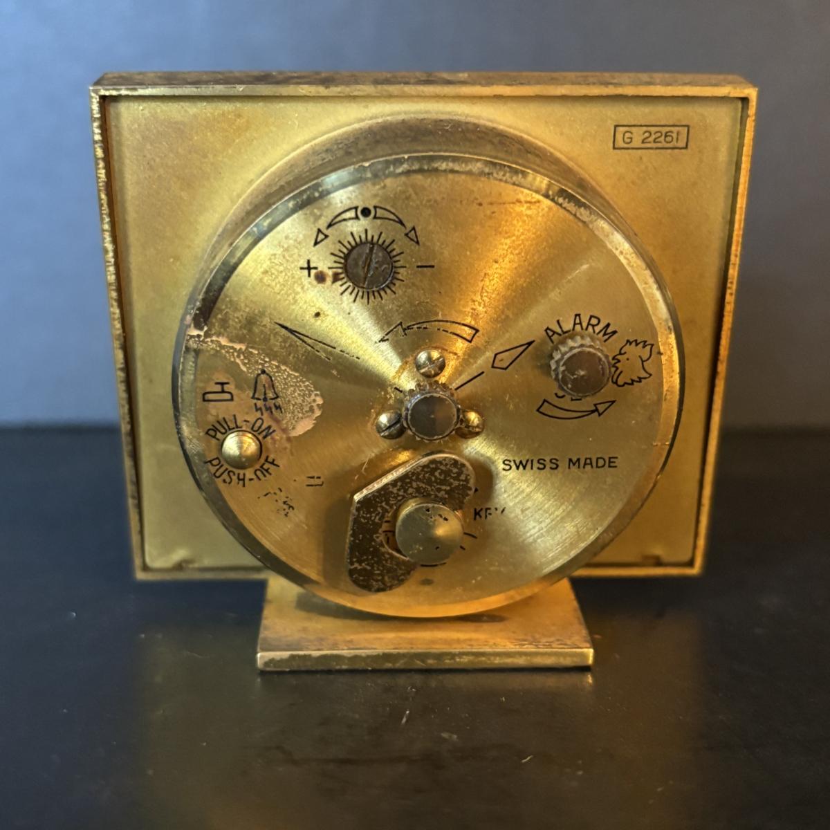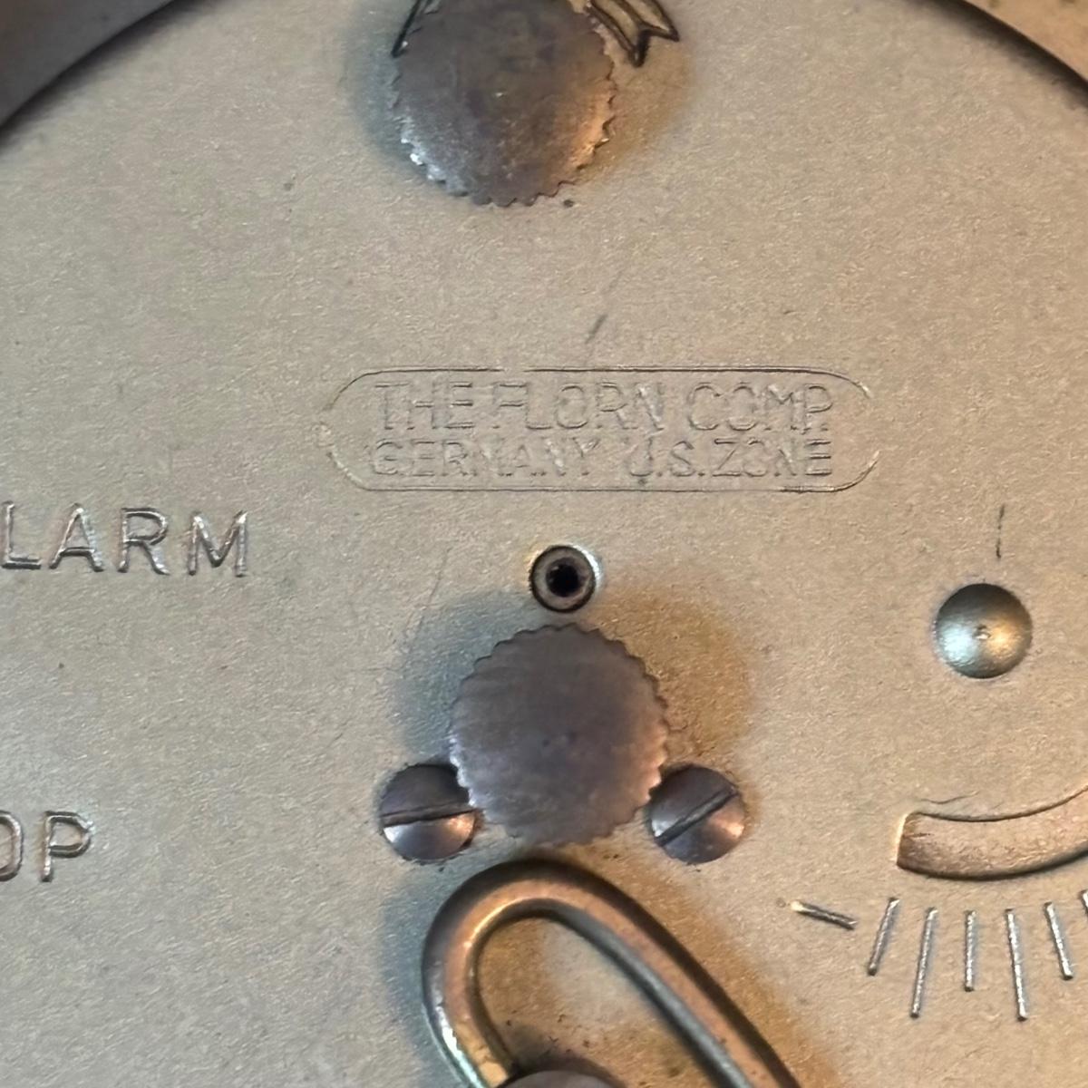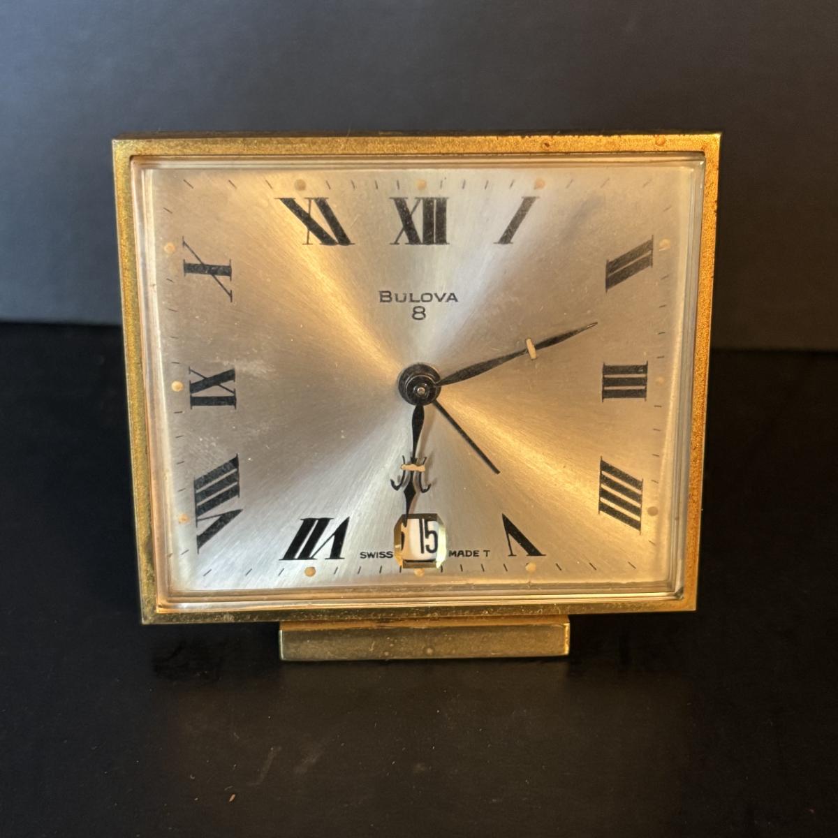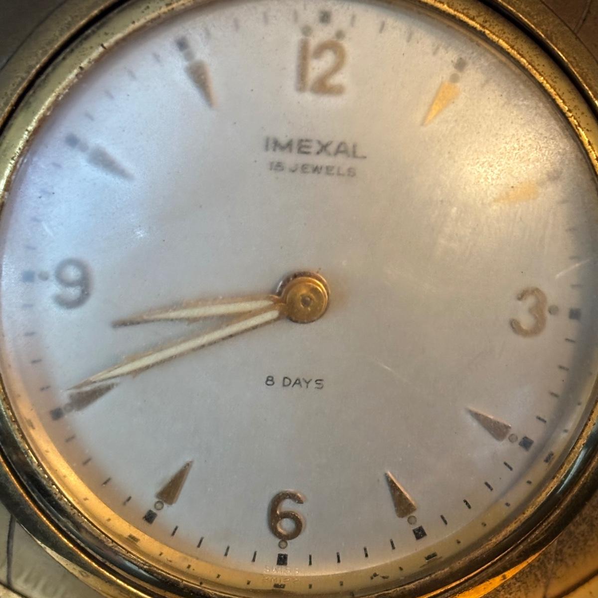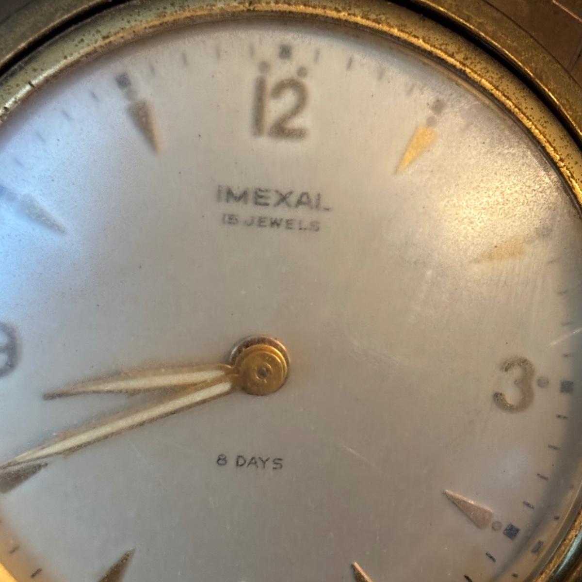 LOT 104: Vintage Imexal 18 Jewel 8-day World Clock, Florn Travel Alarm Clock, Bulova Swiss Made Alarm & Wooden Wall Barometer Made in Western Germany
