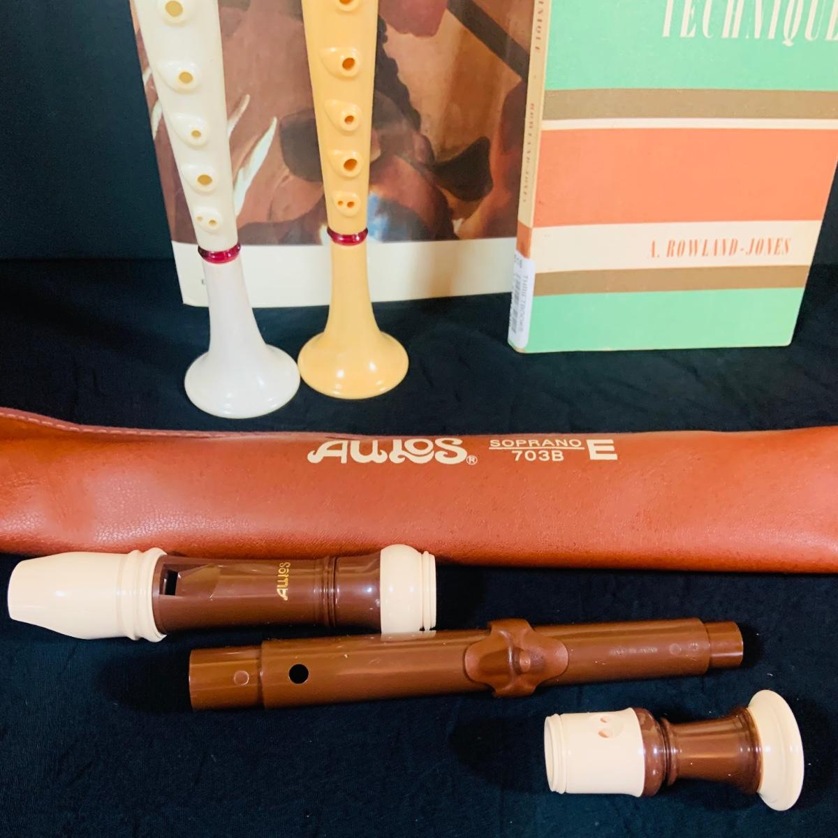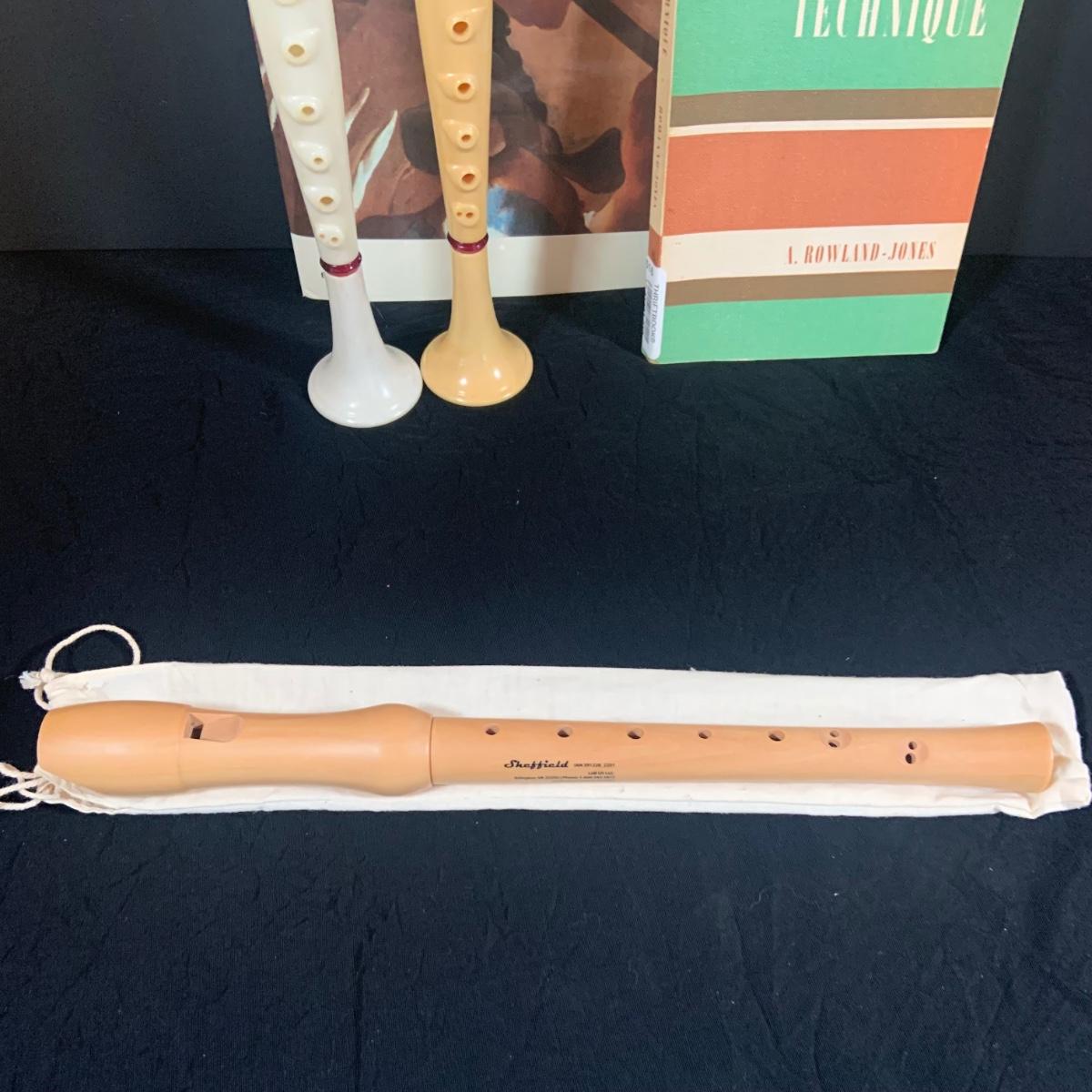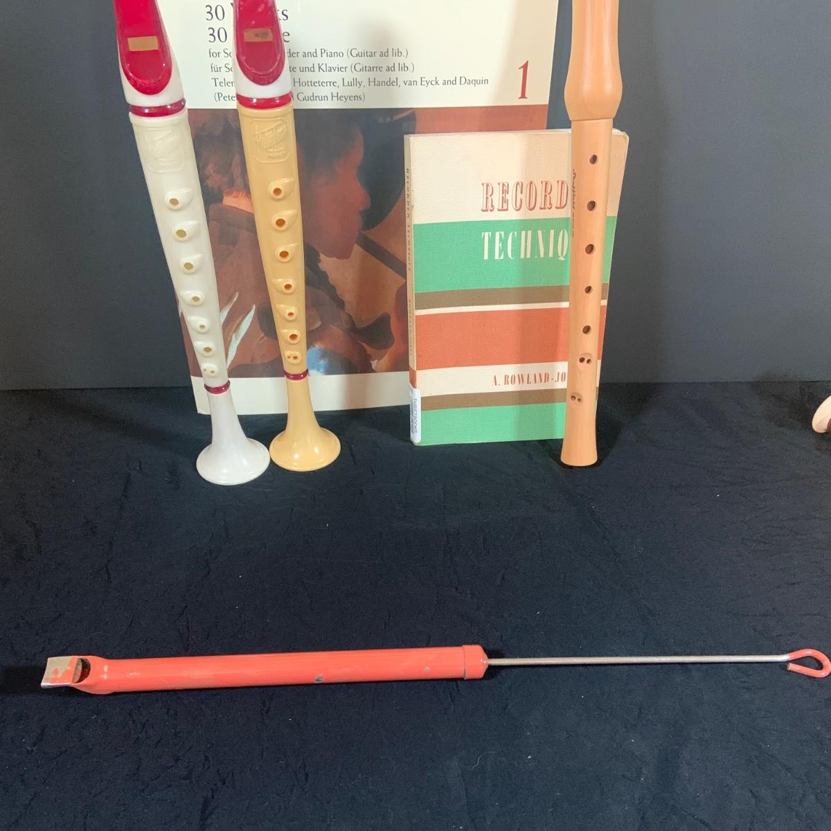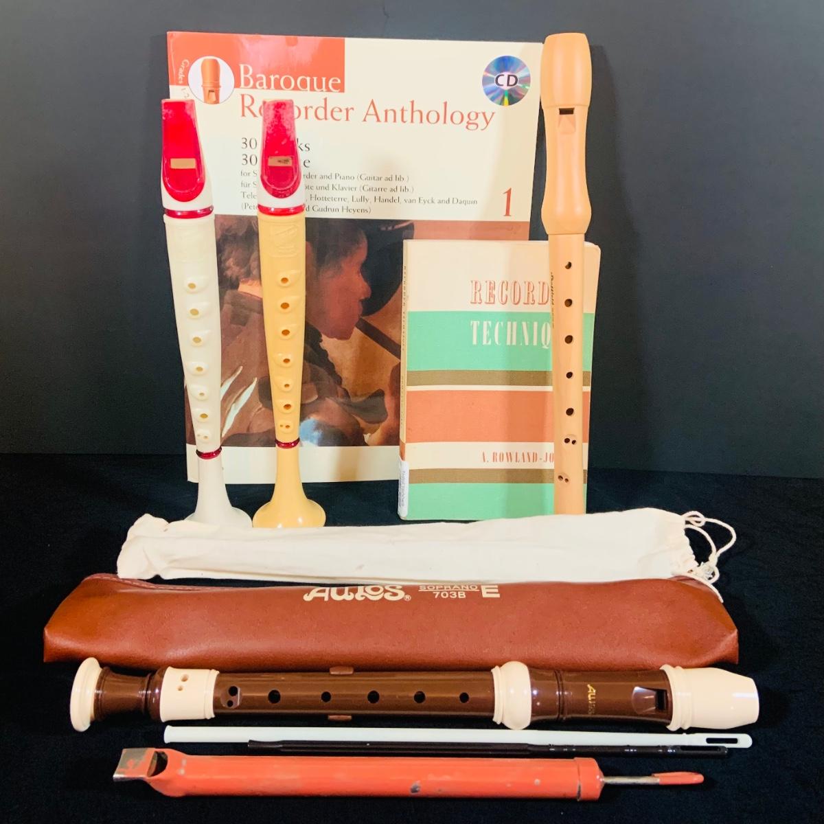 LOT 176: Vintage Wind Instruments Including Two (2) Flutophones, an Aulos Soprano Recorder, Sheffield Recorder, Slide Whistle and Books