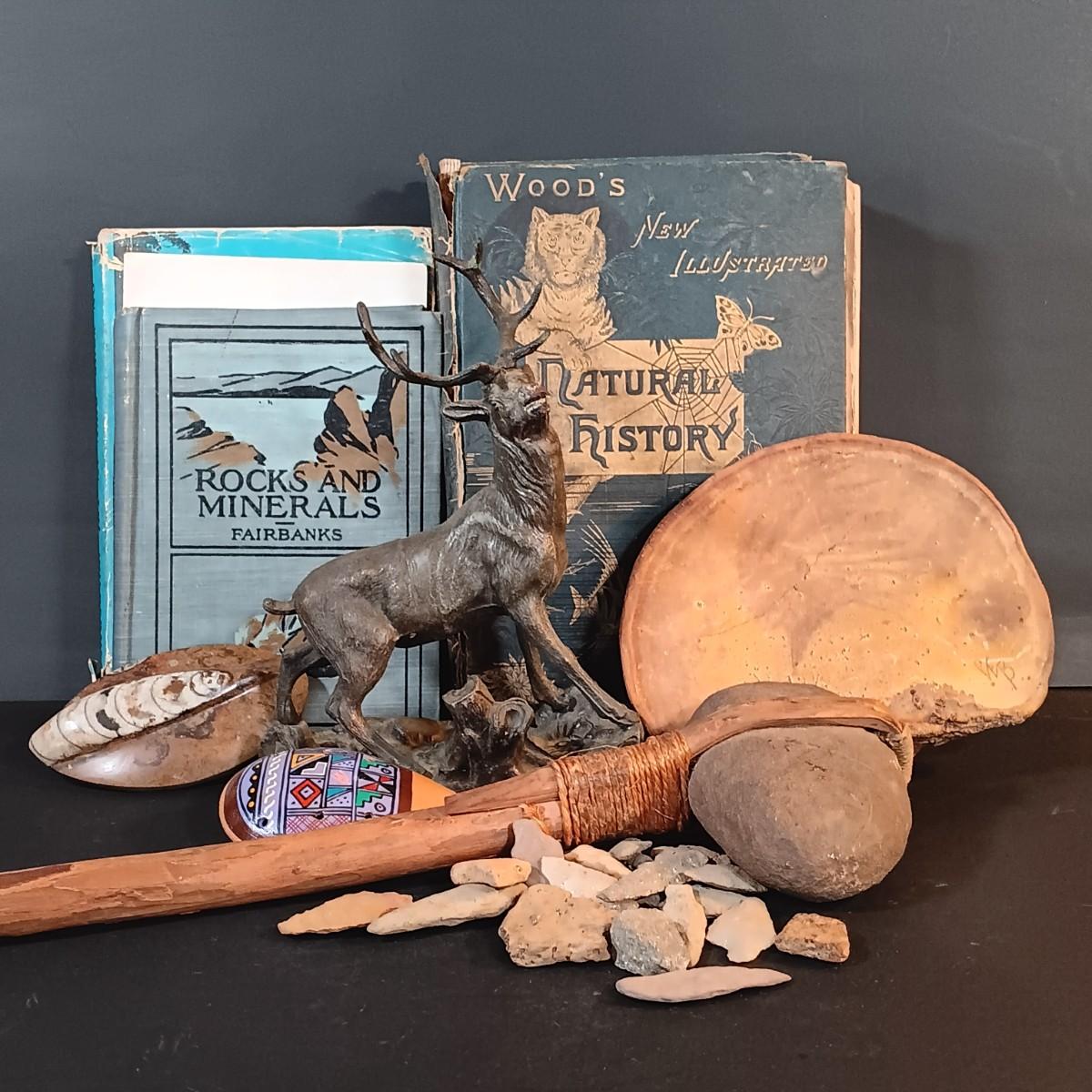 LOT 201: Cast Metal Elk Figurine, Vintage Stone Axe, Stone Arrowheads, Dried Shelf Mushroom & More