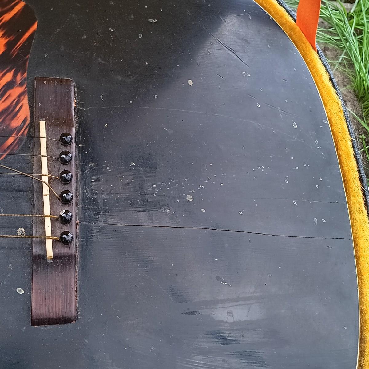 Please view all photos as there are cracks on the front and back of the guitar body.