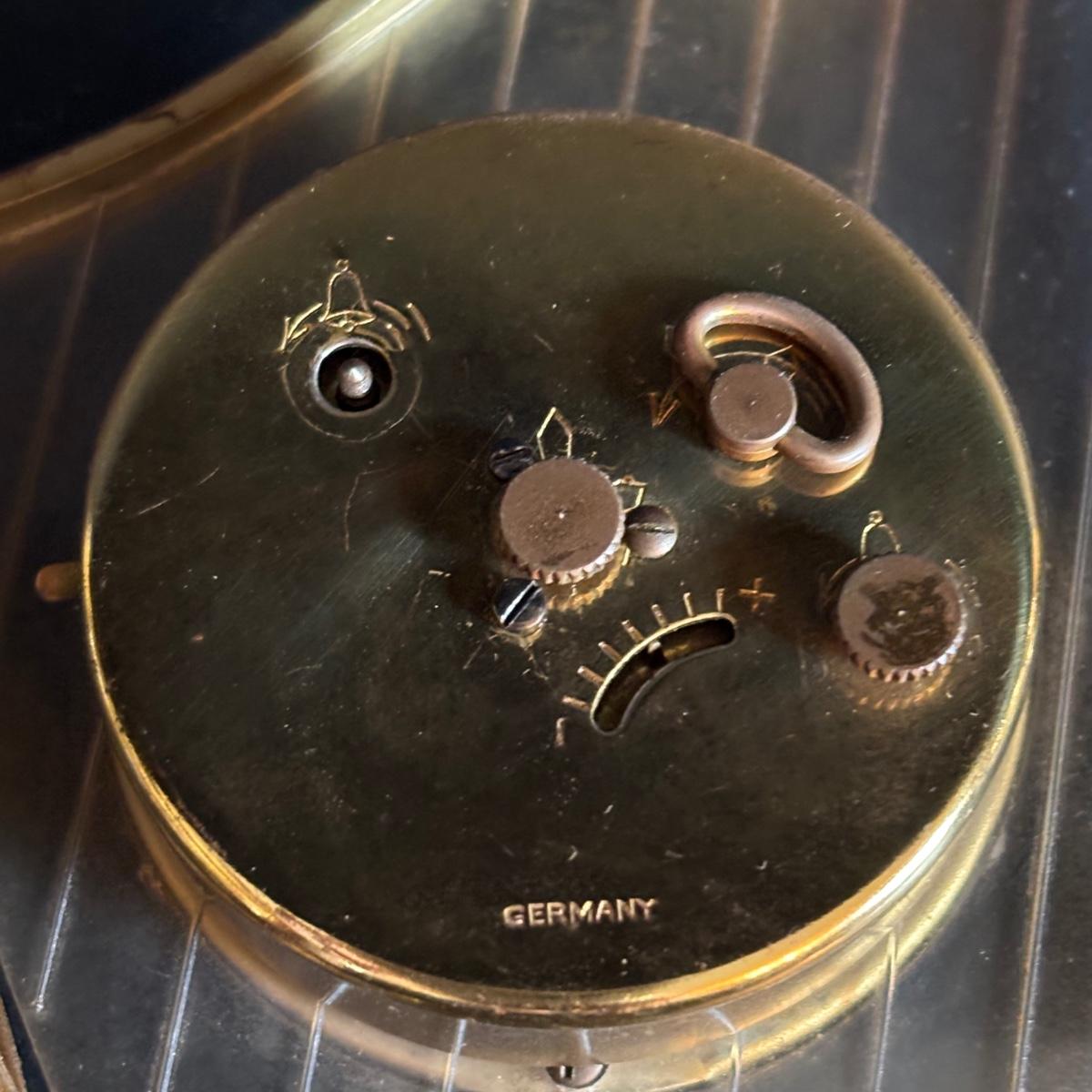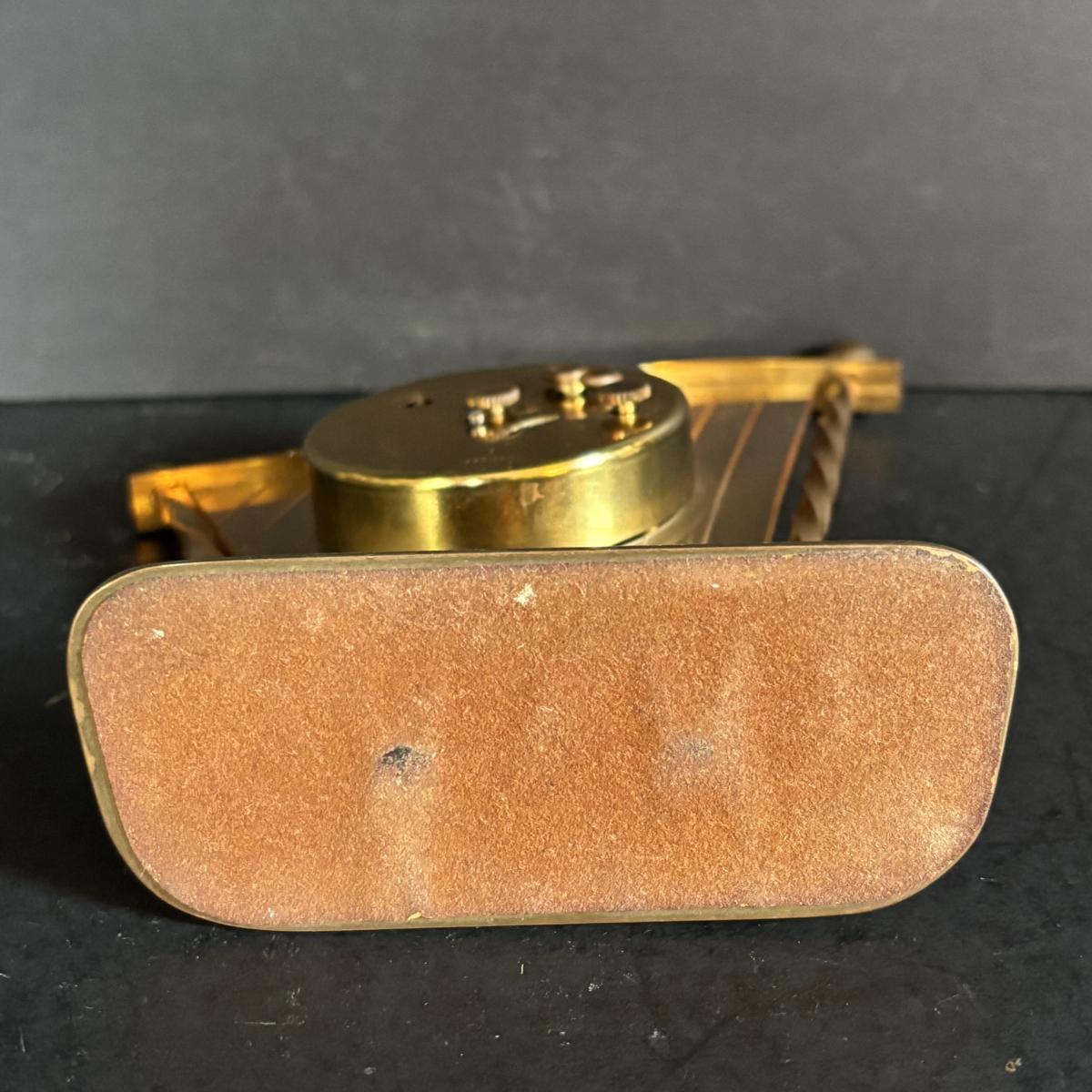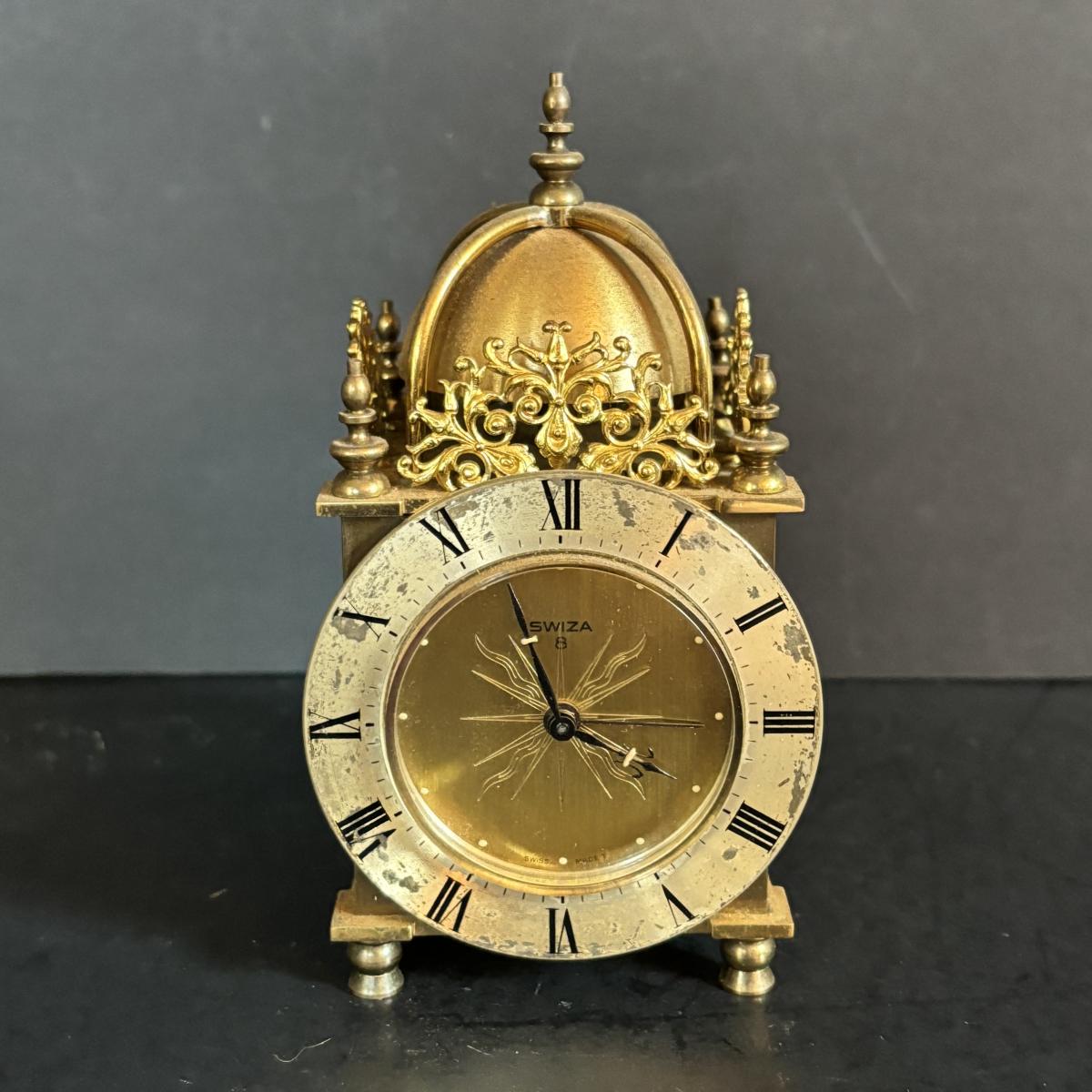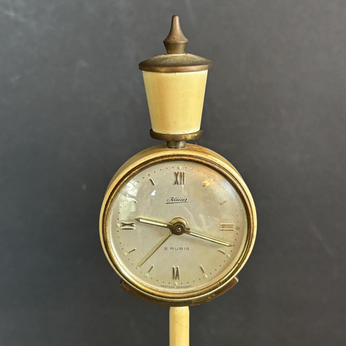 LOT 275: Vintage Linden Lucite Harp Alarm Clock, Luxor Desk Clock w/Scenic Dial, Brass Swiza 8-Day Travel Alarm Clock, & Kaiser Lamp Post Clock
