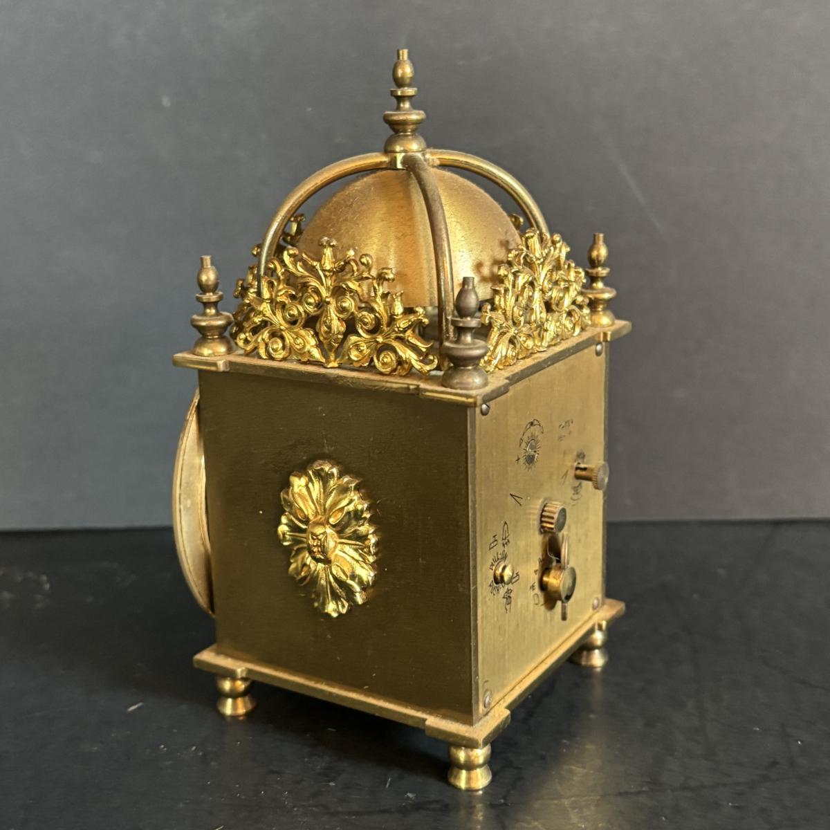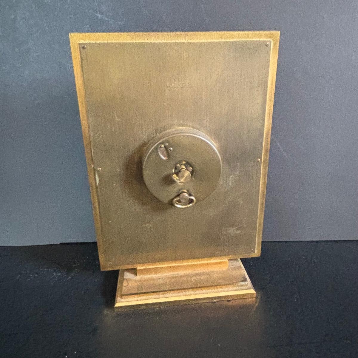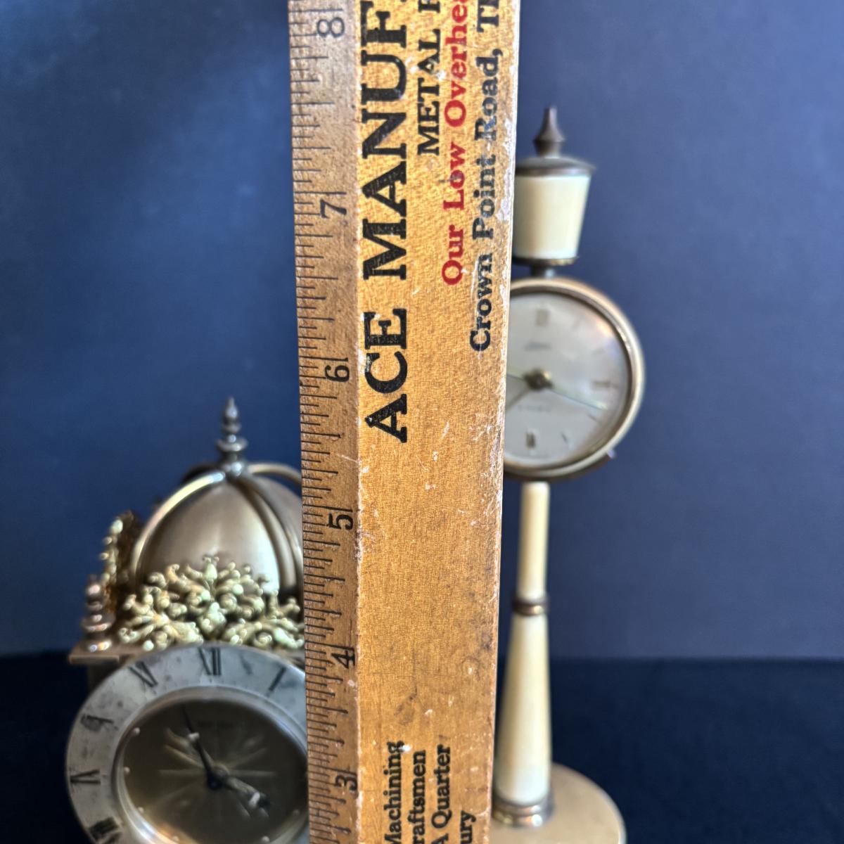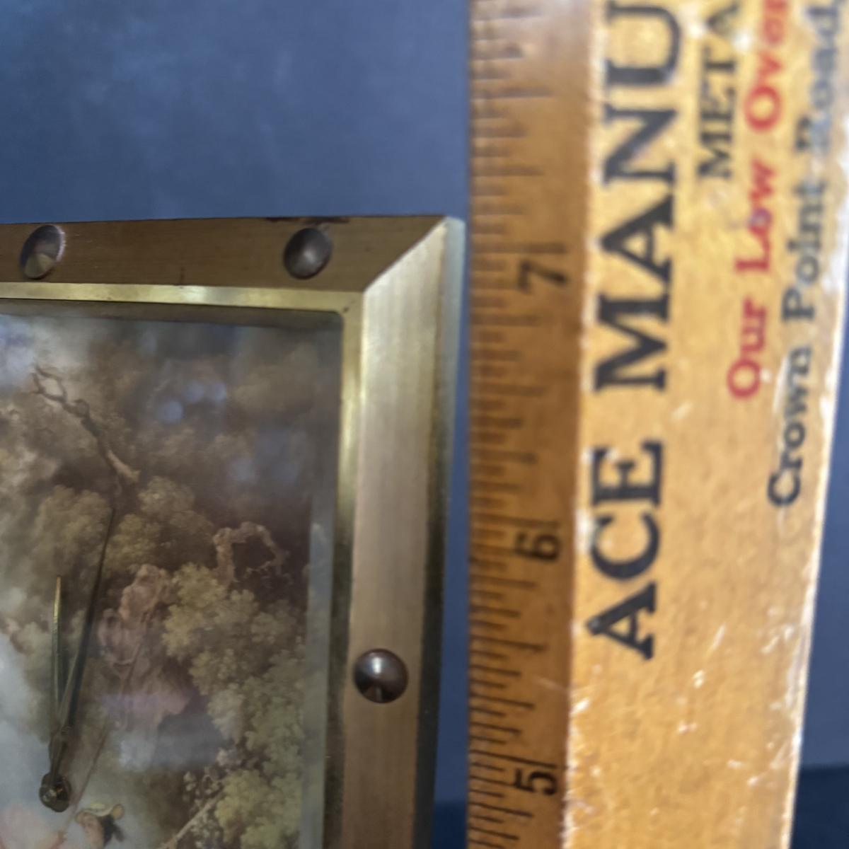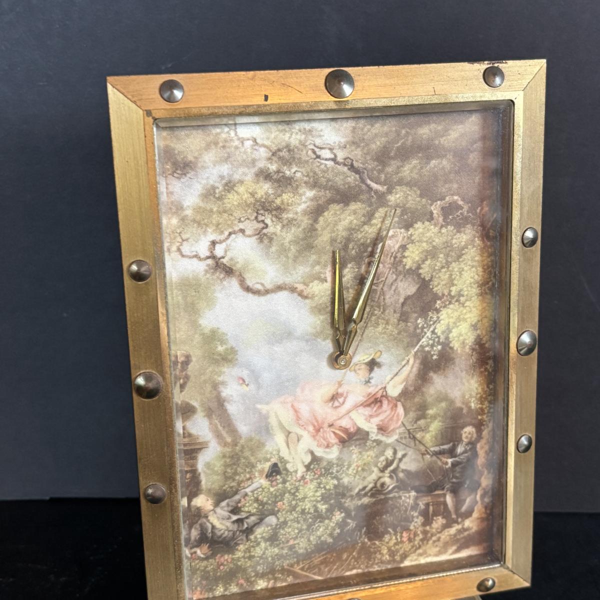 LOT 275: Vintage Linden Lucite Harp Alarm Clock, Luxor Desk Clock w/Scenic Dial, Brass Swiza 8-Day Travel Alarm Clock, & Kaiser Lamp Post Clock