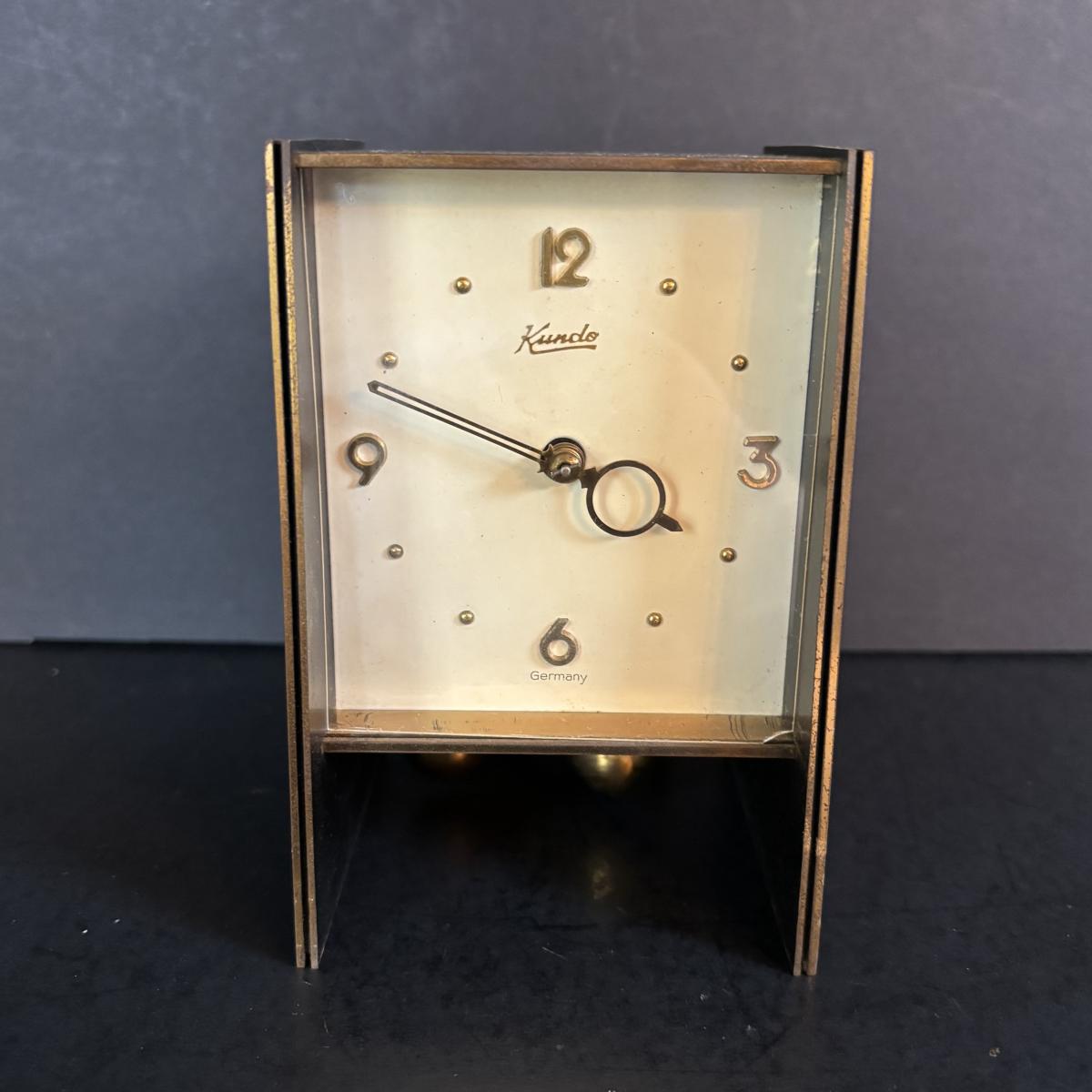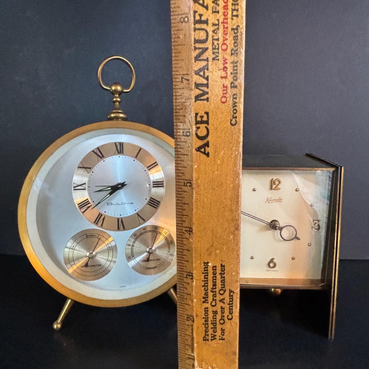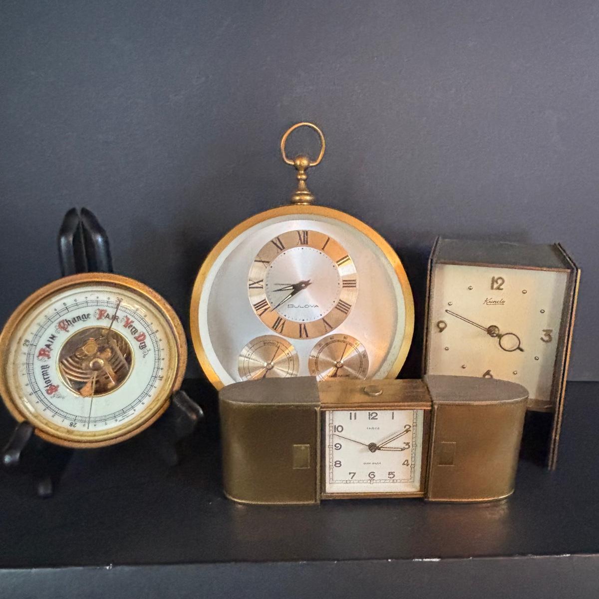 LOT 276: Vintage Art Deco Kundo Alarm Clock, Brass Semco 7 Jewels Travel Alarm Clock, Mid- Century Wind-Up Clock-Thermometer-Hydrometer & Brass Barometer