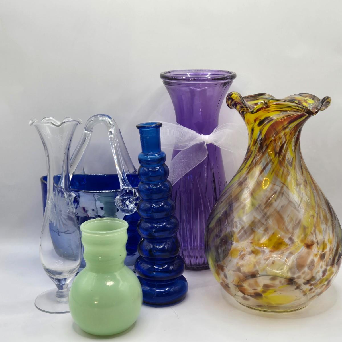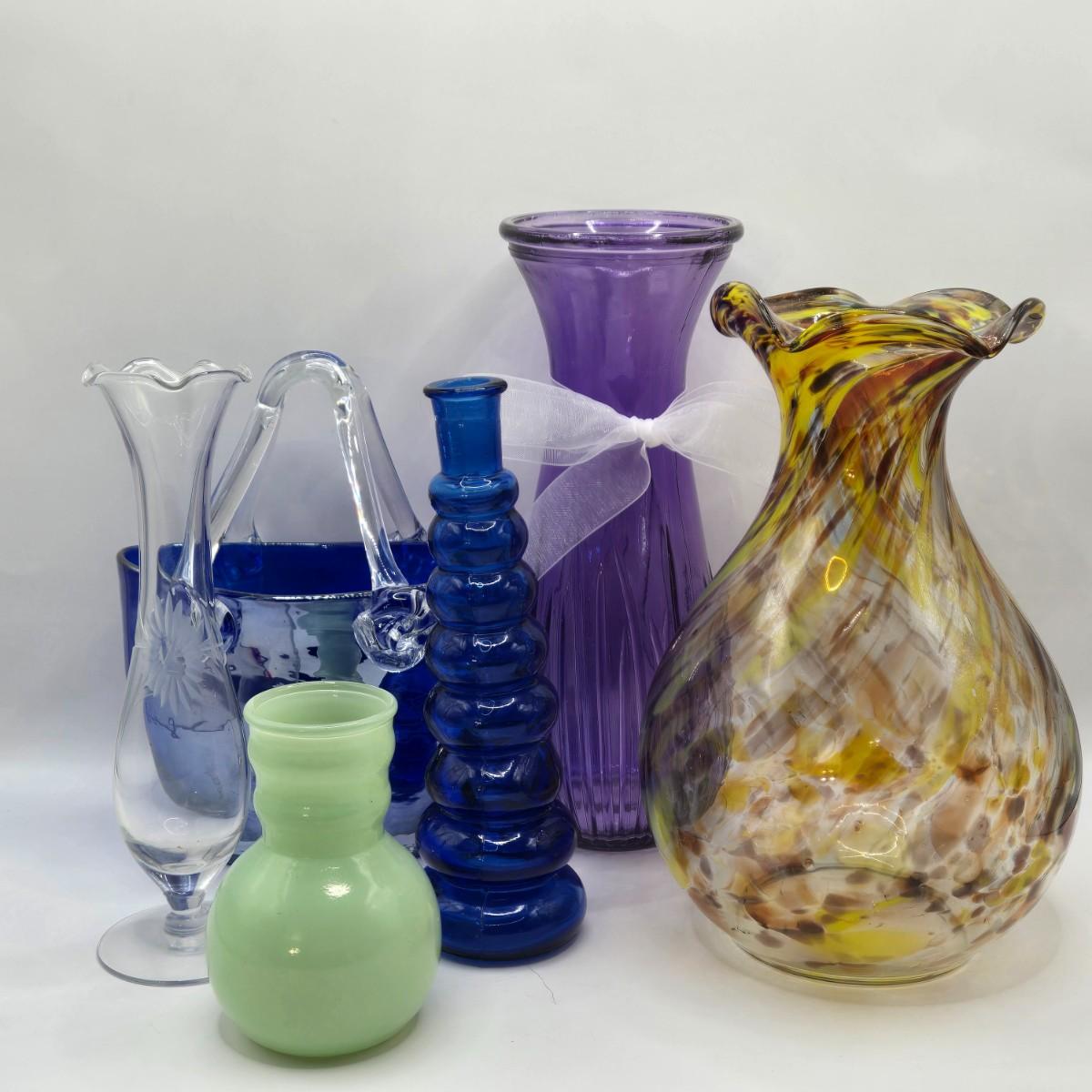 LOT 9L: Vases, Including Cobalt Blue Glass Stacked Bubble Bottle and More