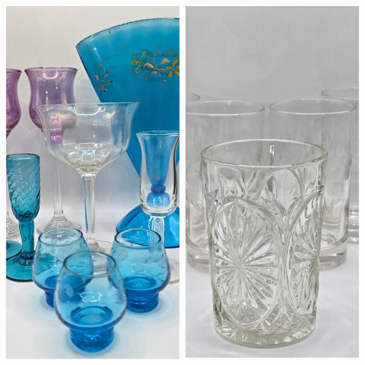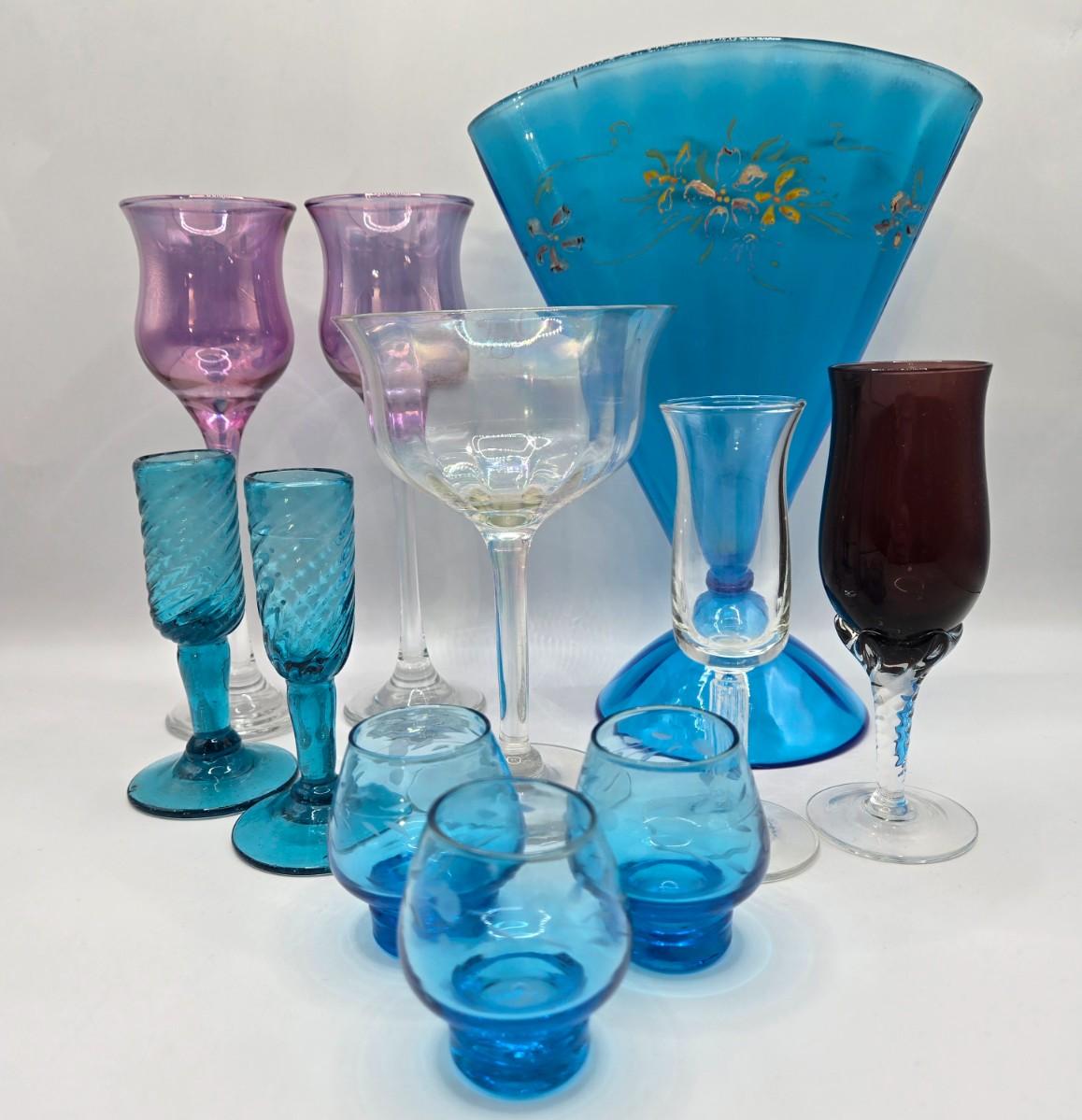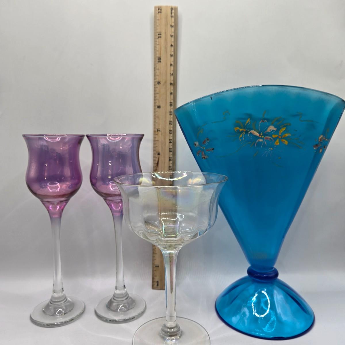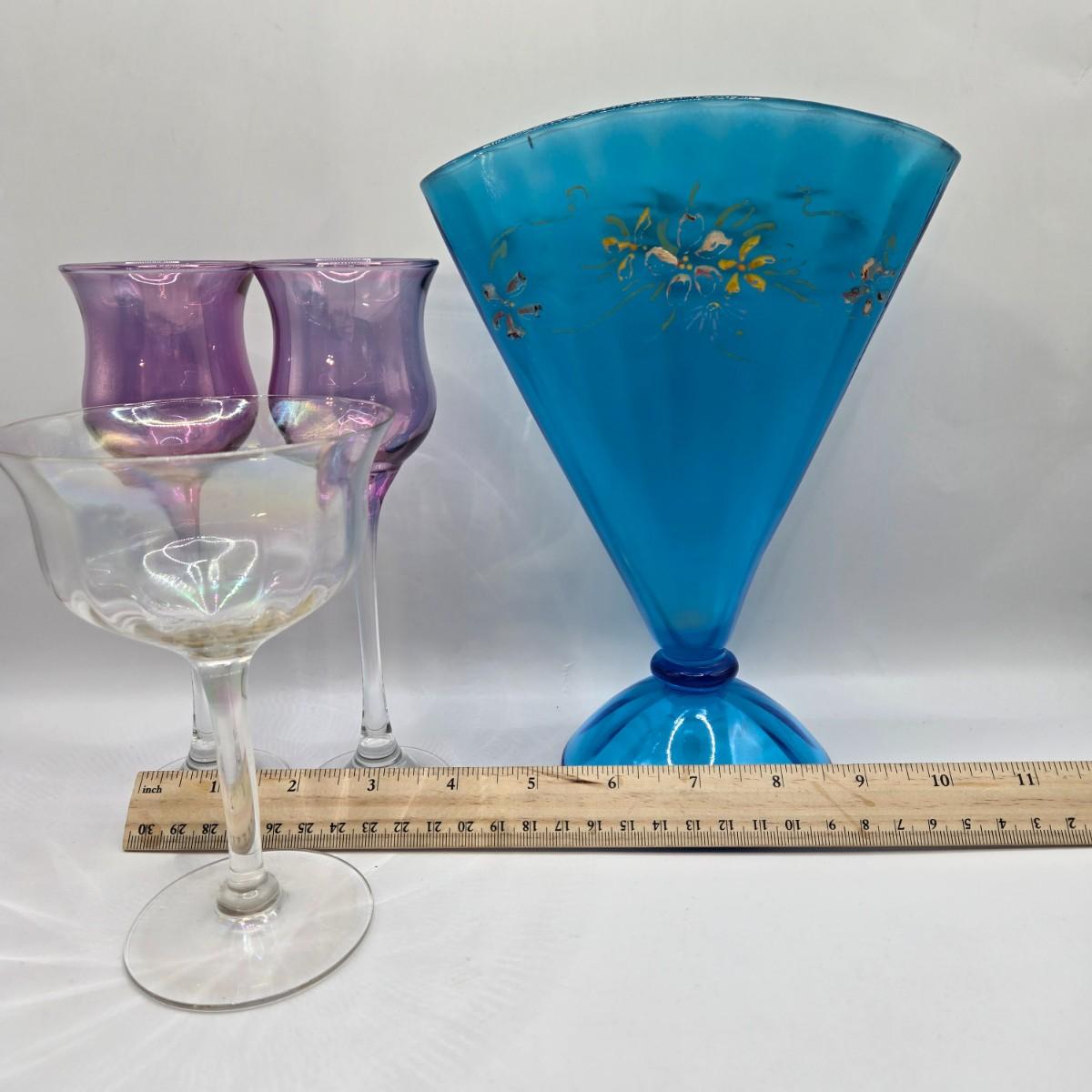 LOT 12L: Vintage Stretch Glass Fan Vase, Small Hand Blown Glass Goblets, Etched Glasses, and More