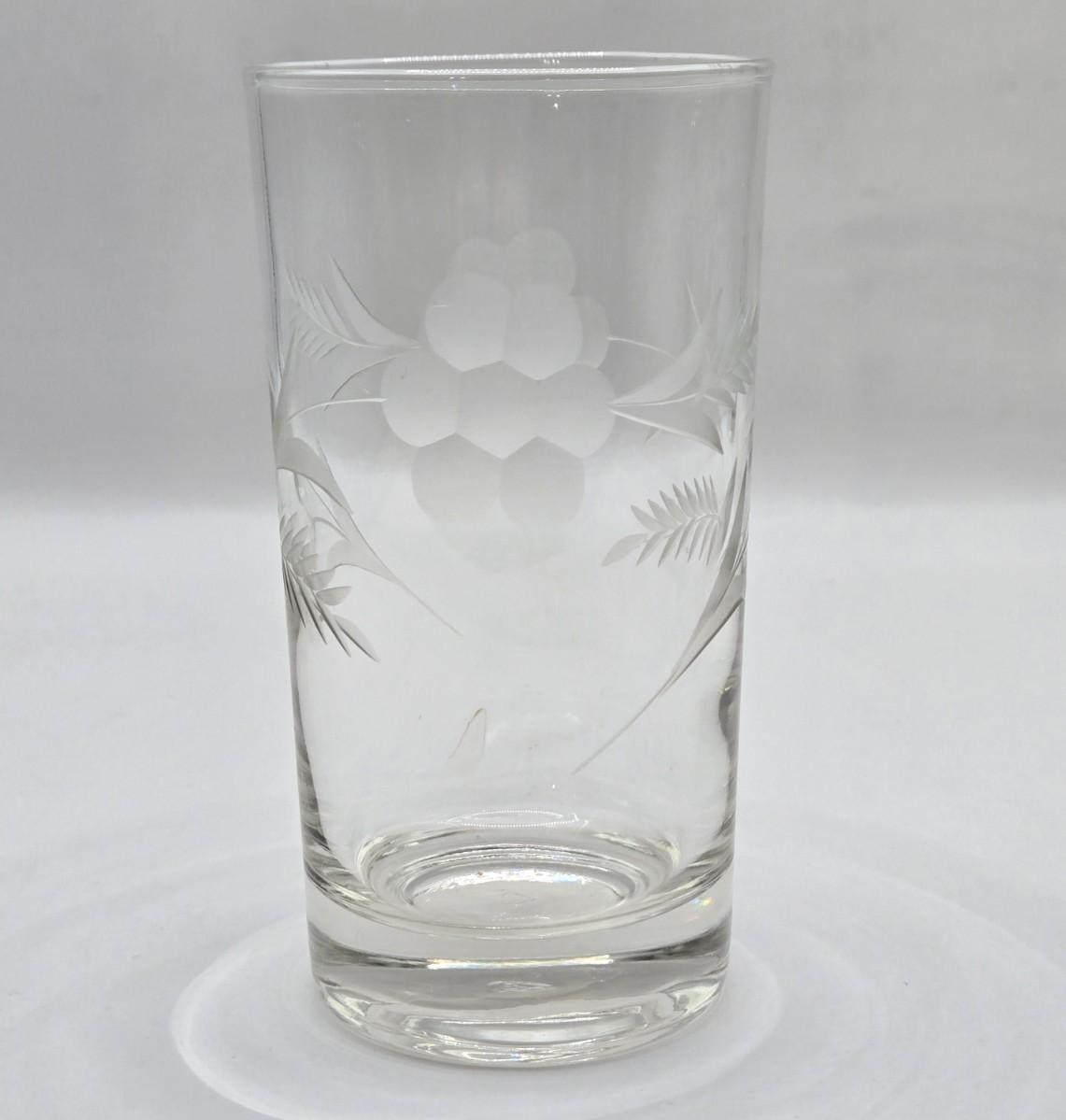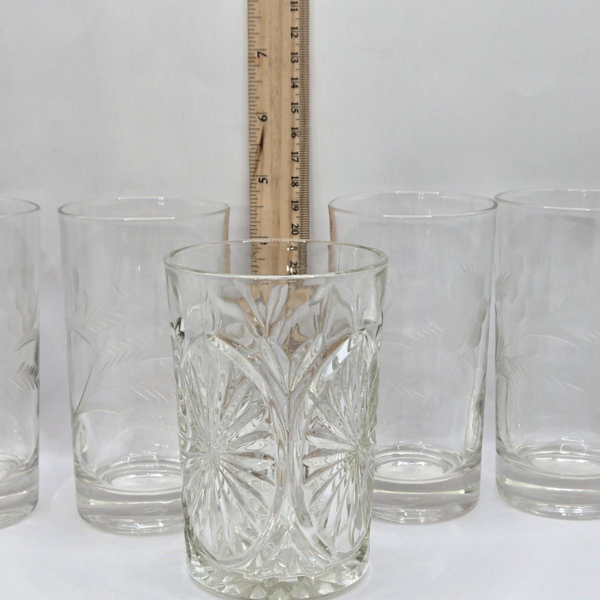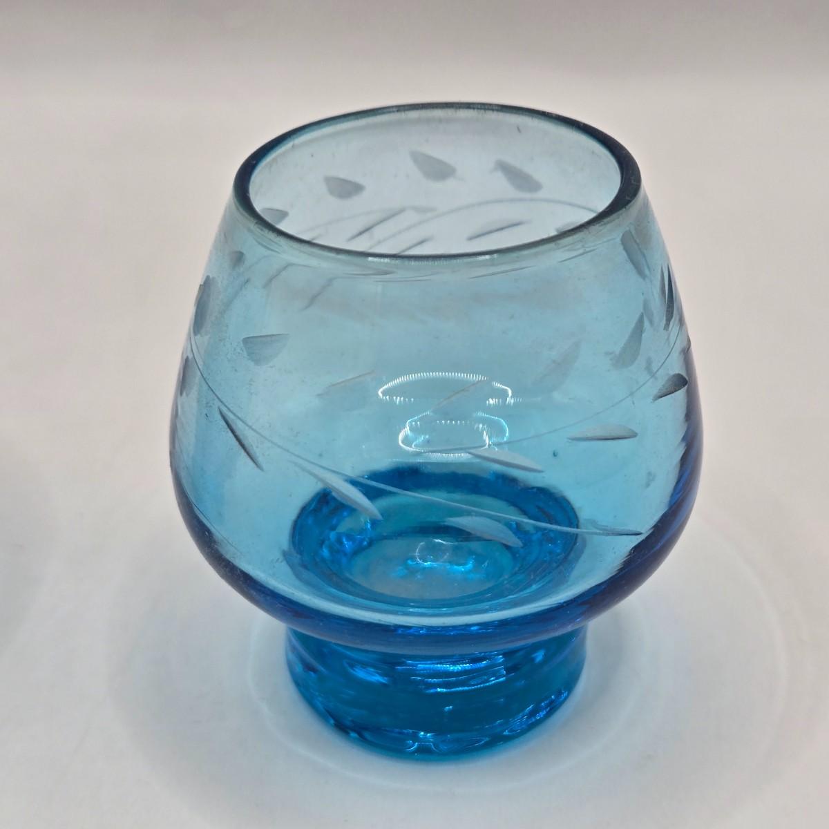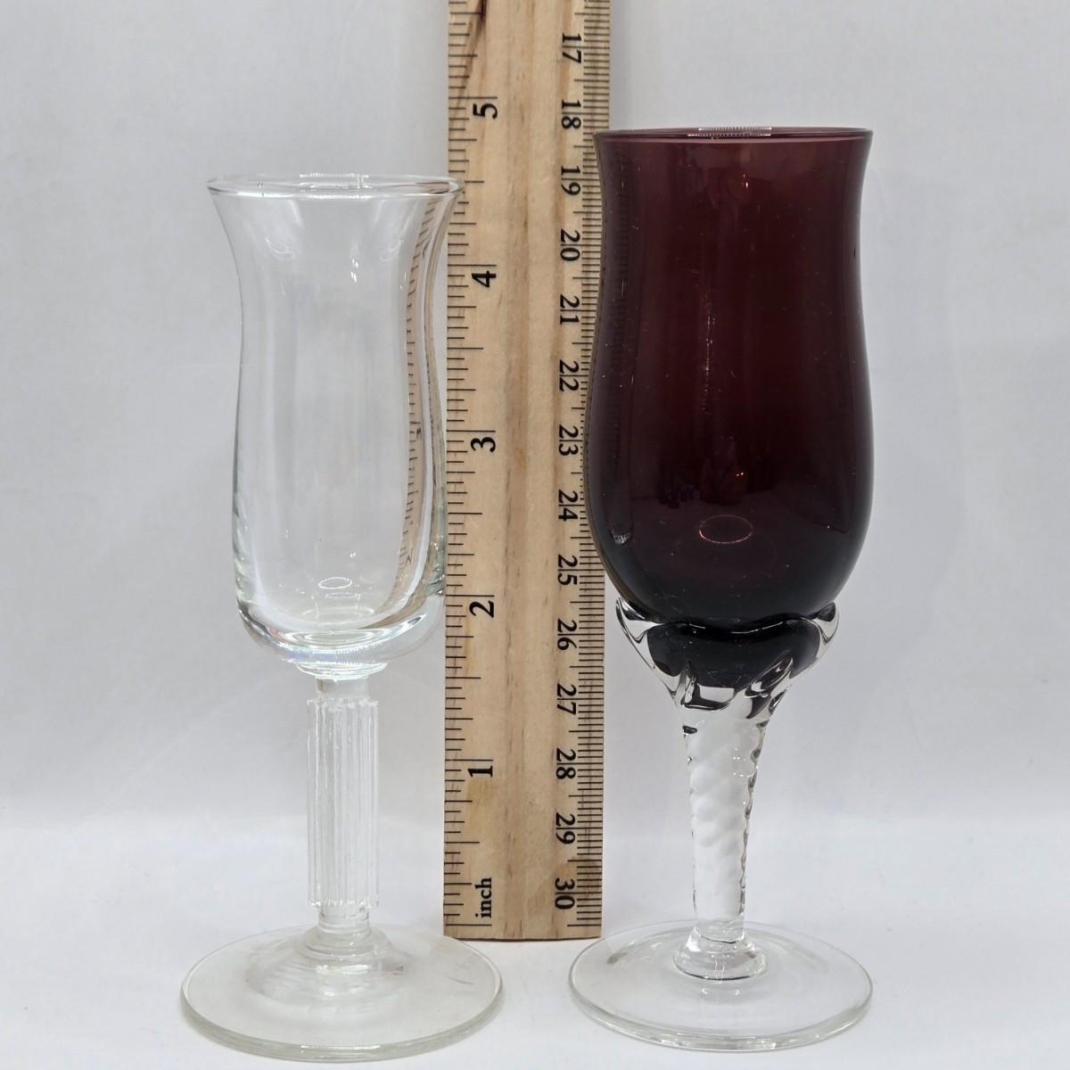 LOT 12L: Vintage Stretch Glass Fan Vase, Small Hand Blown Glass Goblets, Etched Glasses, and More