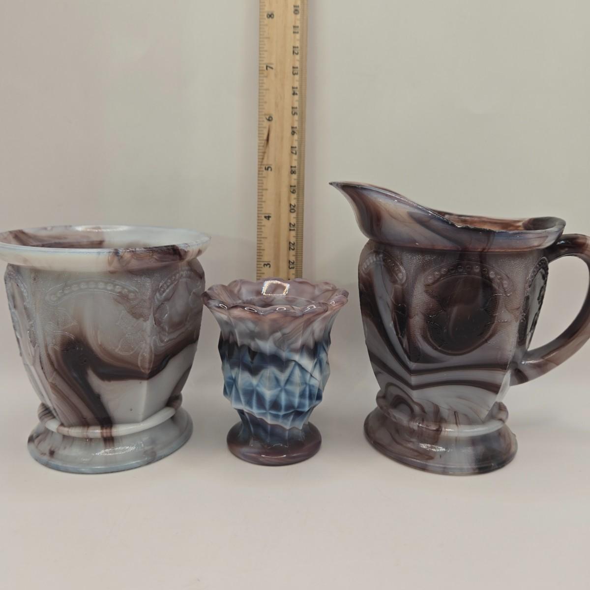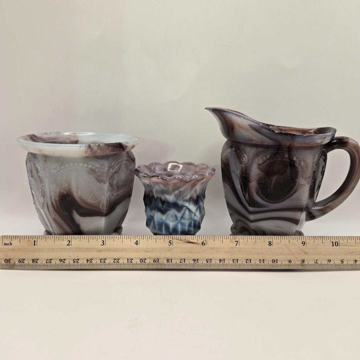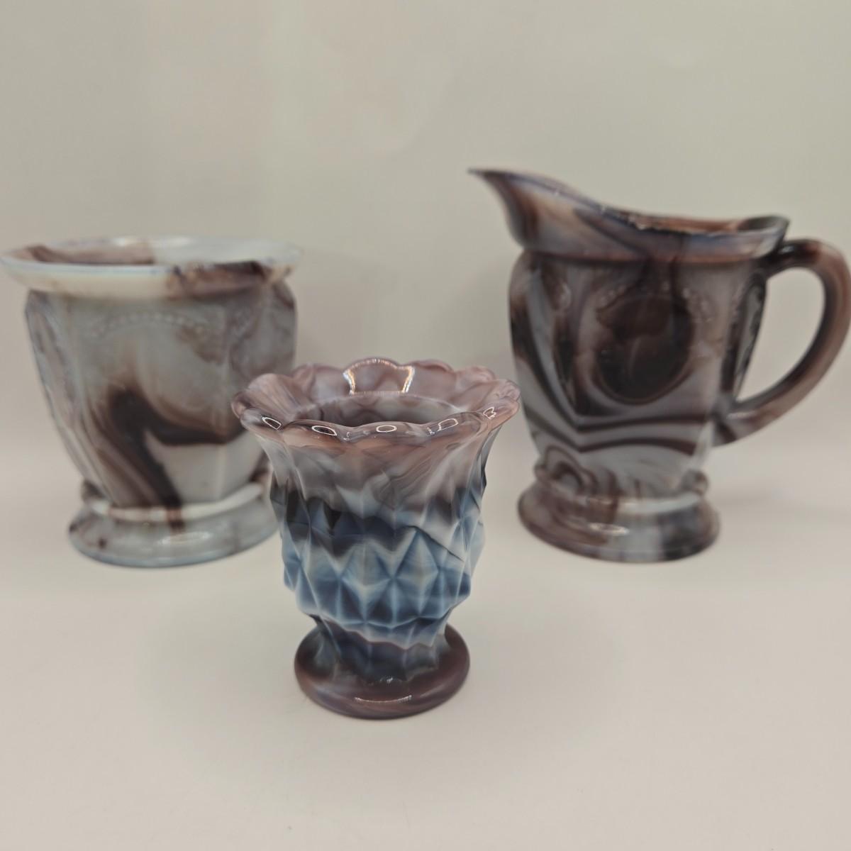 LOT 19L: Purple Slag Creamer & Sugar and Votive Candle/Toothpick Holder
