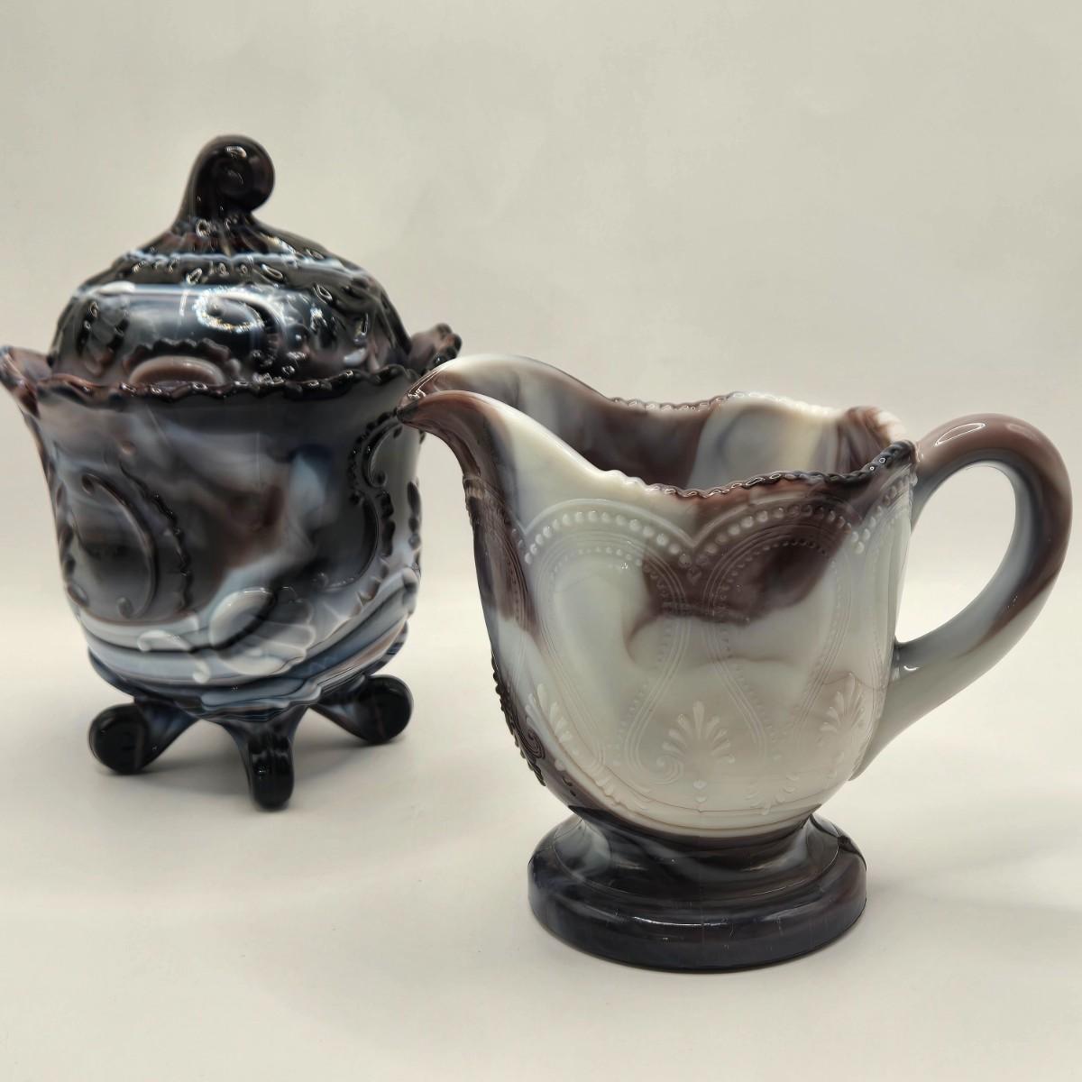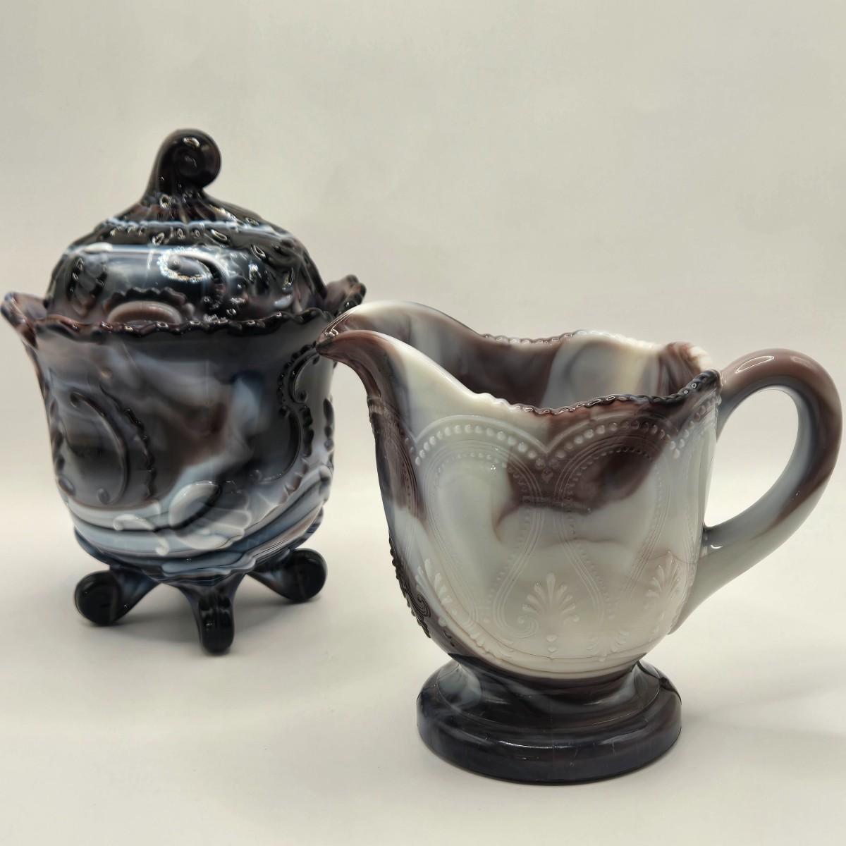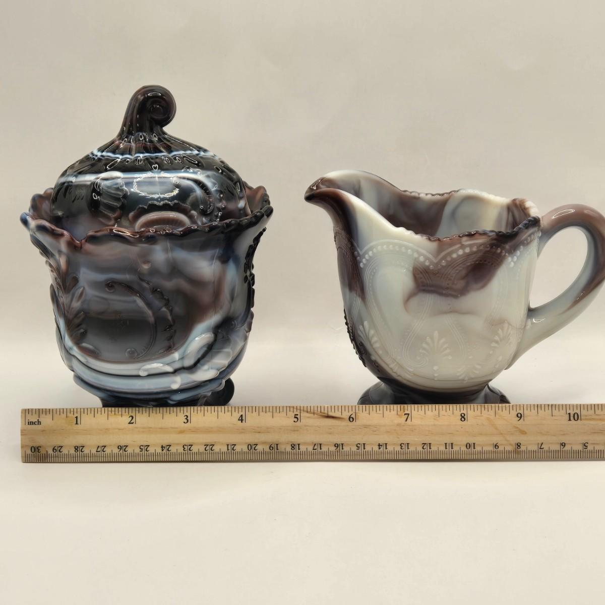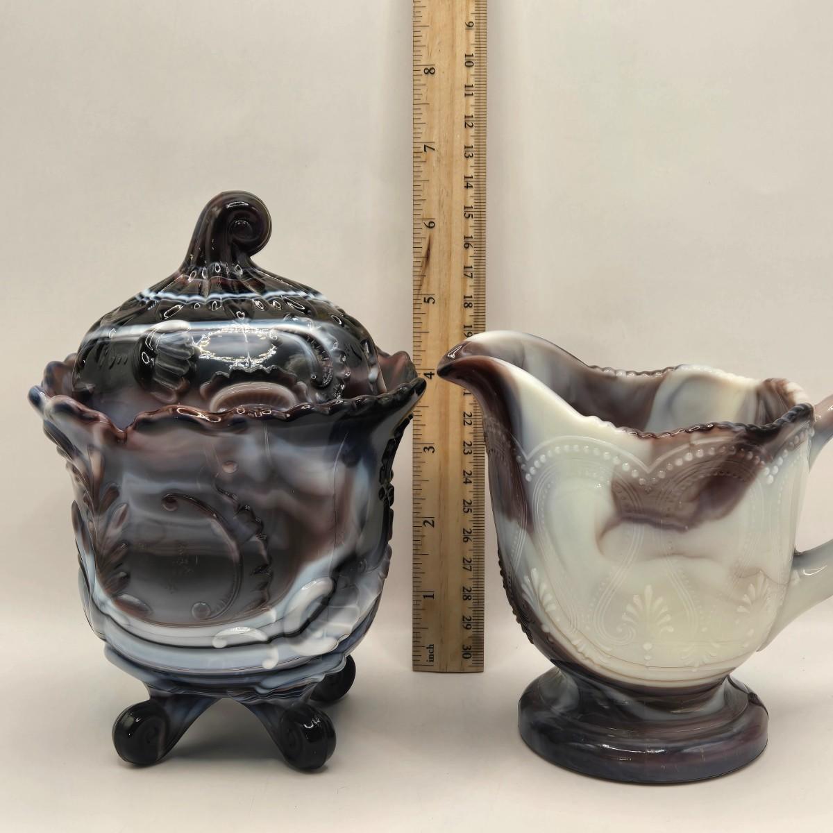 LOT 22L: Purple Slag Imperial Glass Footed Sugar Bowl with Lid and Slag Glass Creamer