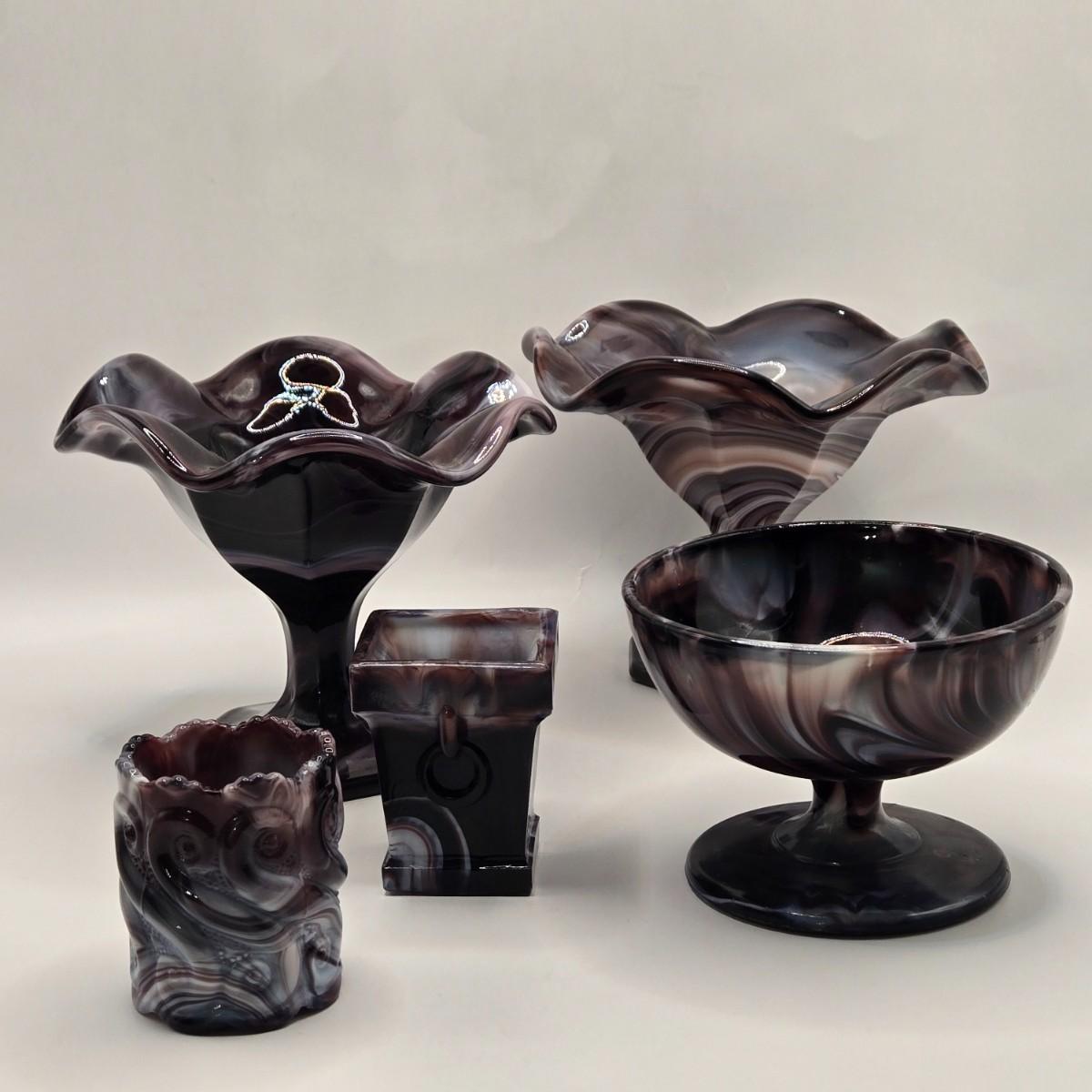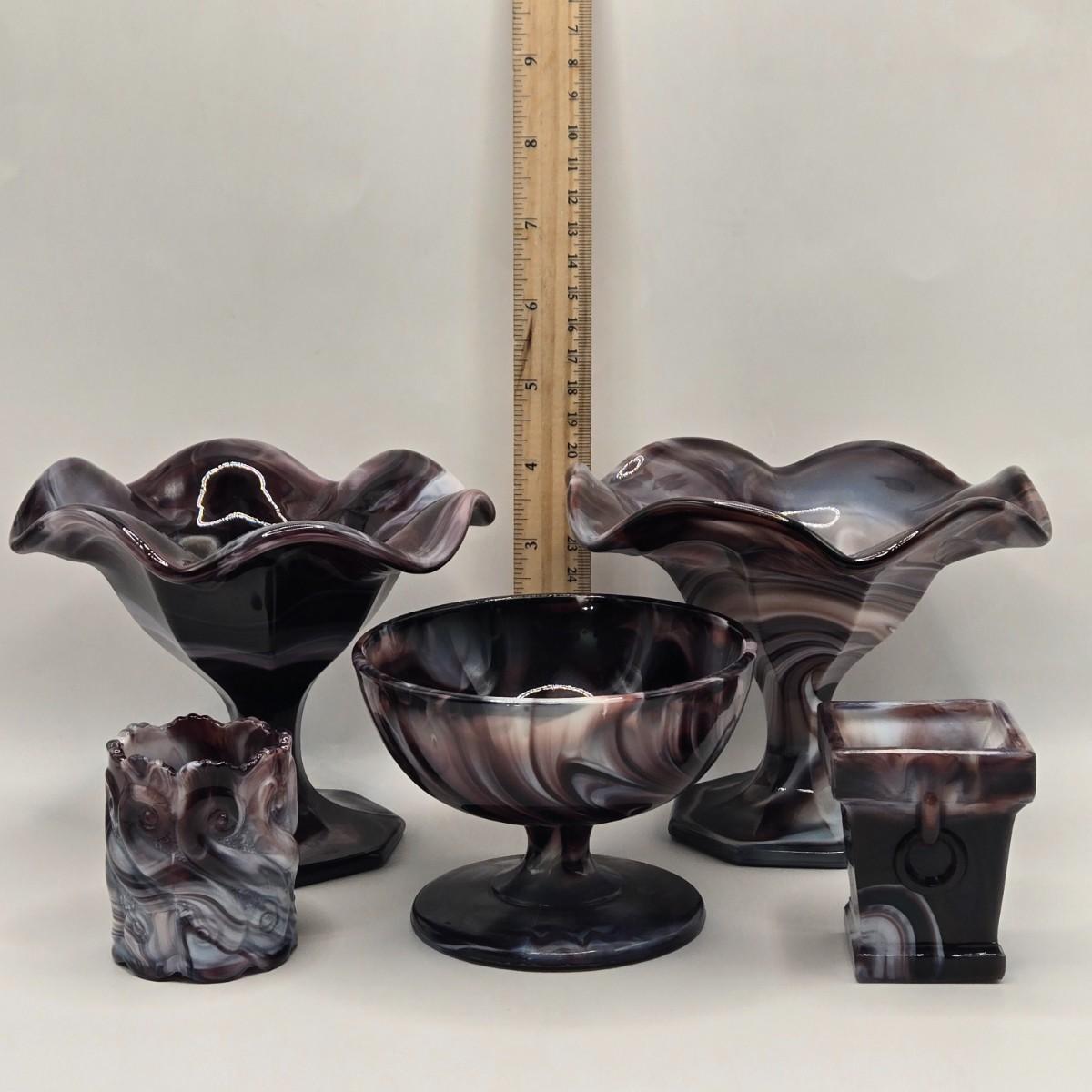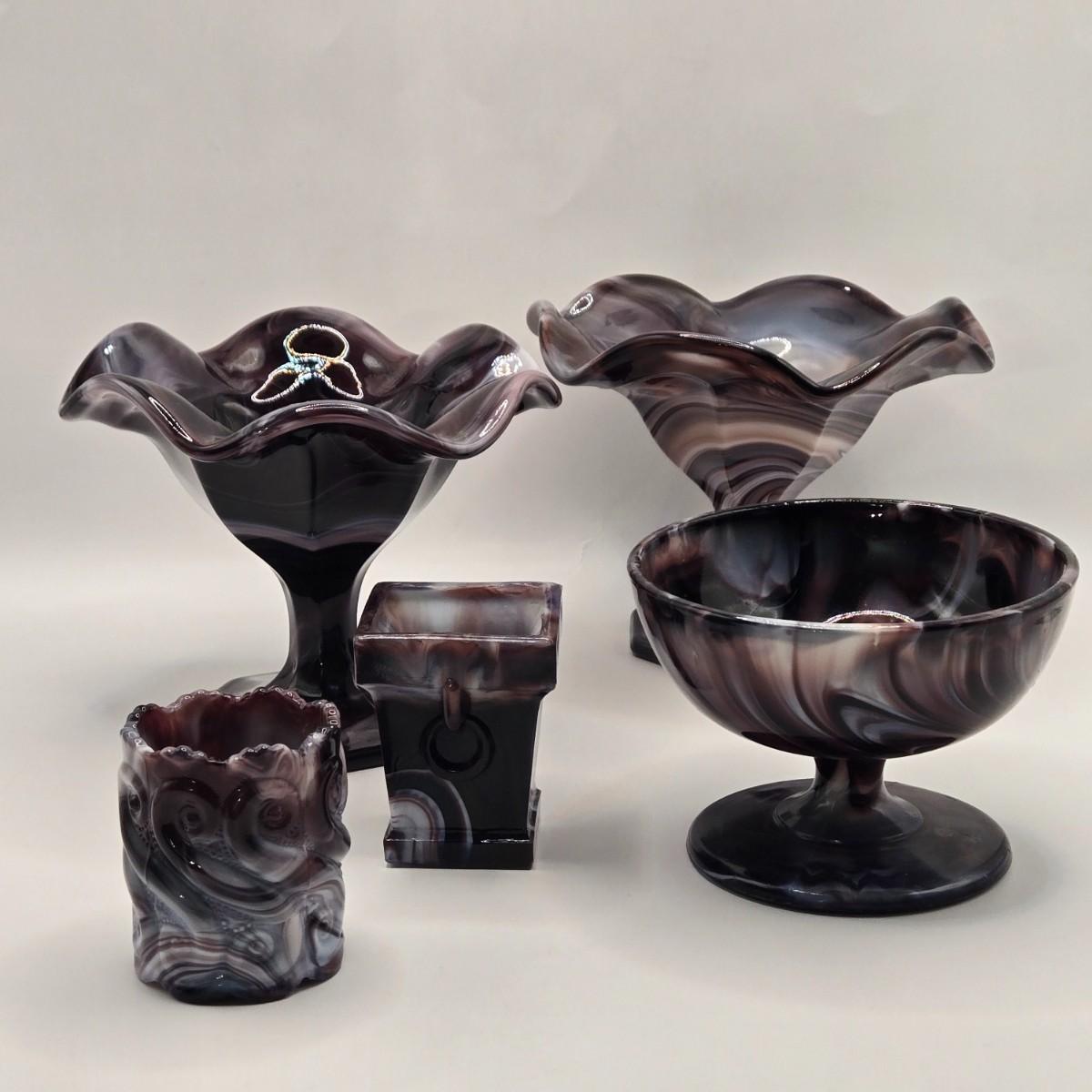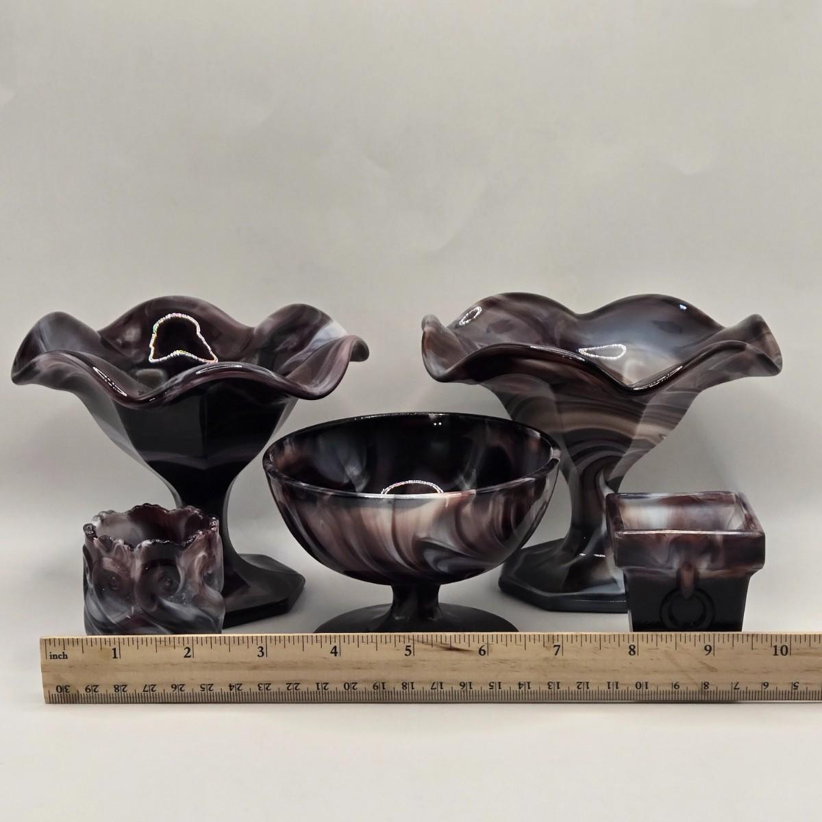LOT 25L: Two Vintage Slag Candy Dishes with Ruffled Edges and Pedestal Bases, Round Candy Dish , and Two Toothpick Holders