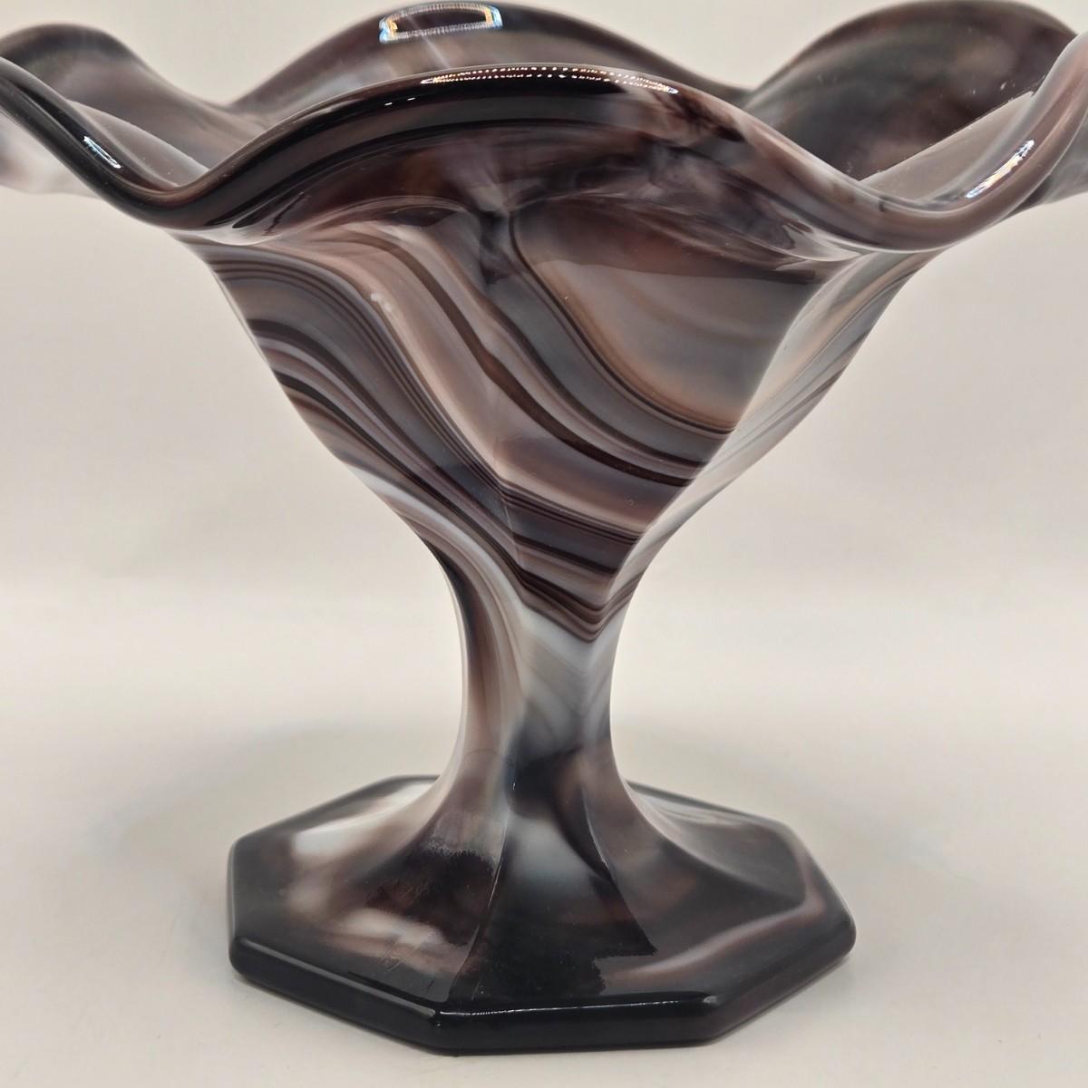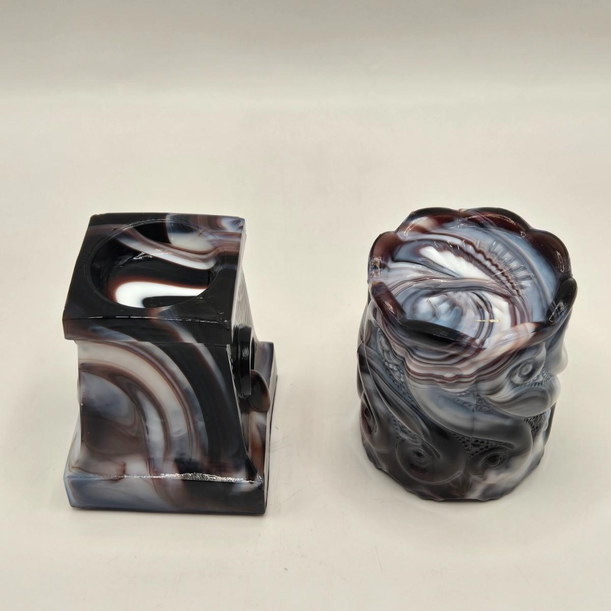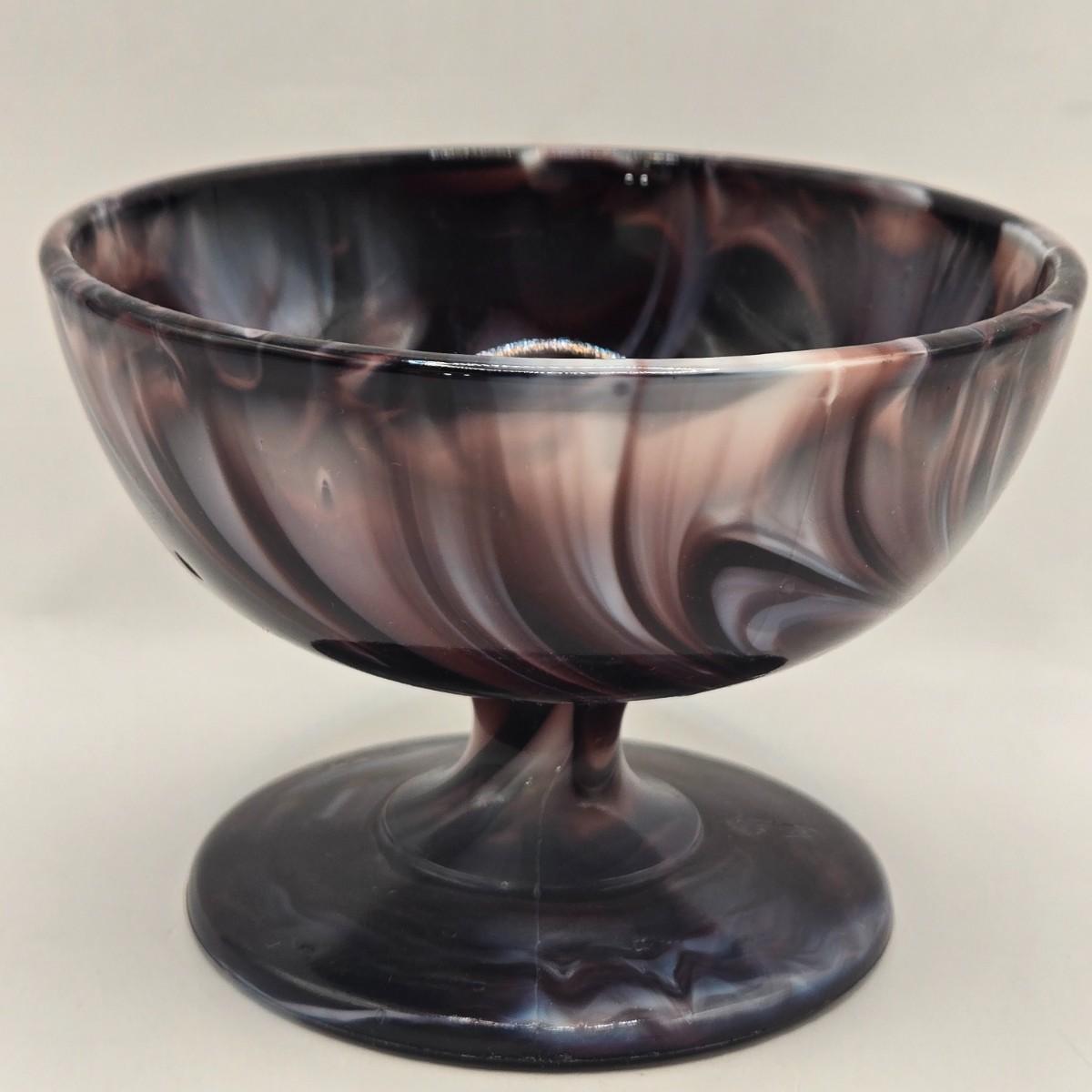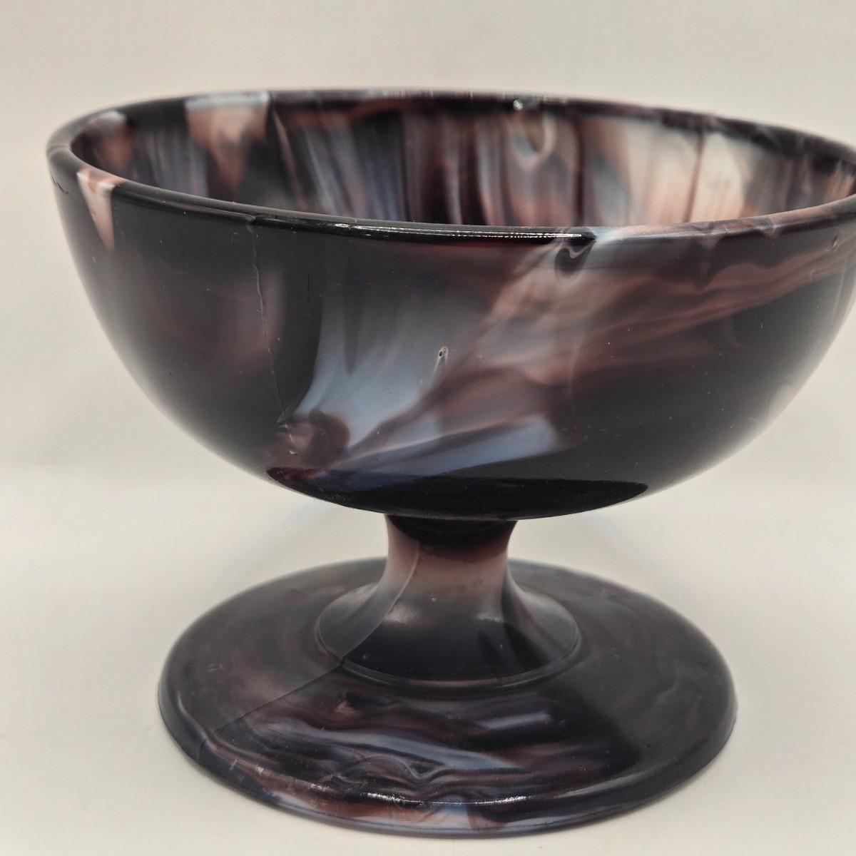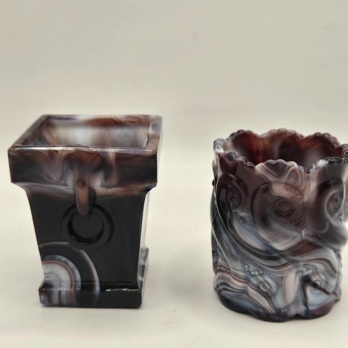 LOT 25L: Two Vintage Slag Candy Dishes with Ruffled Edges and Pedestal Bases, Round Candy Dish , and Two Toothpick Holders