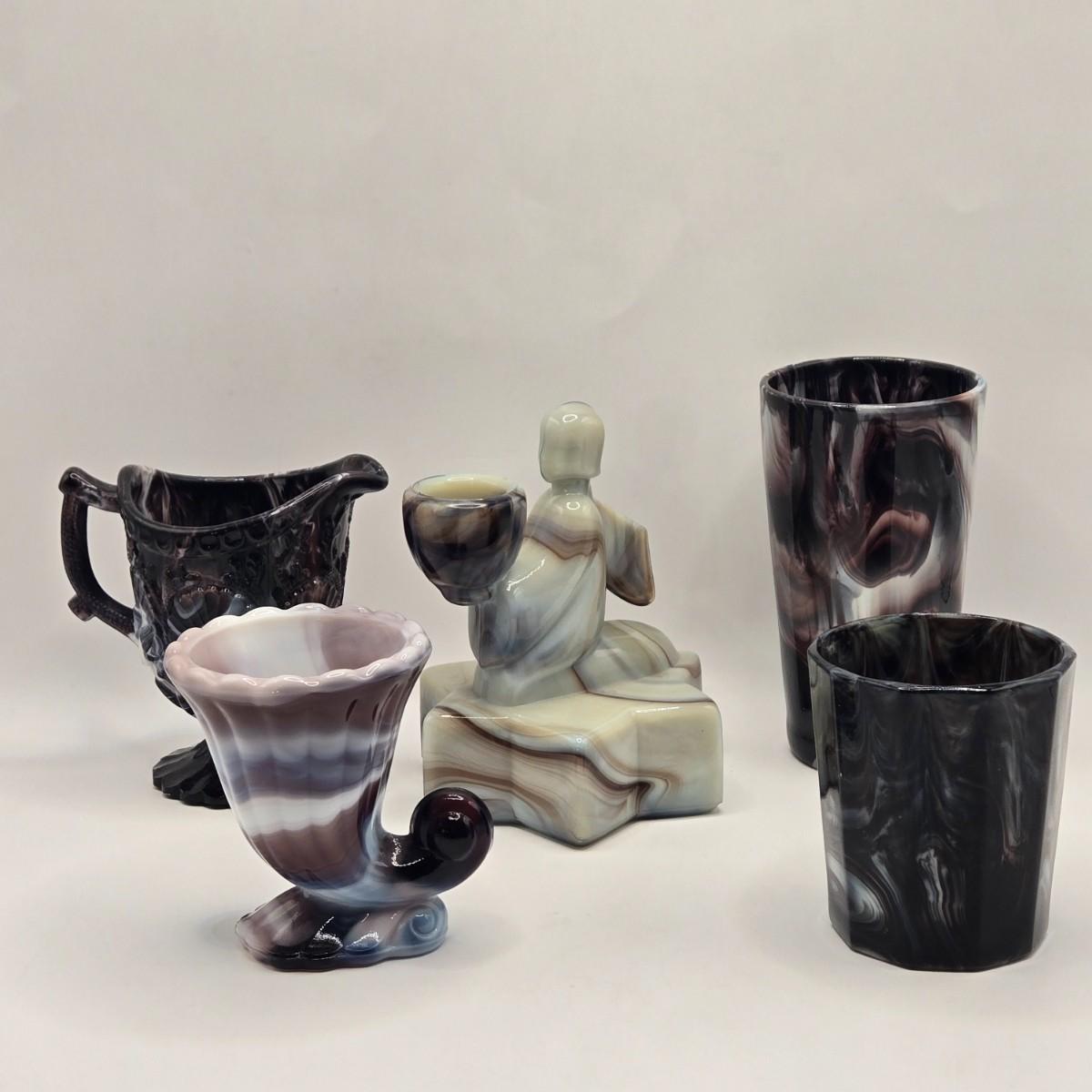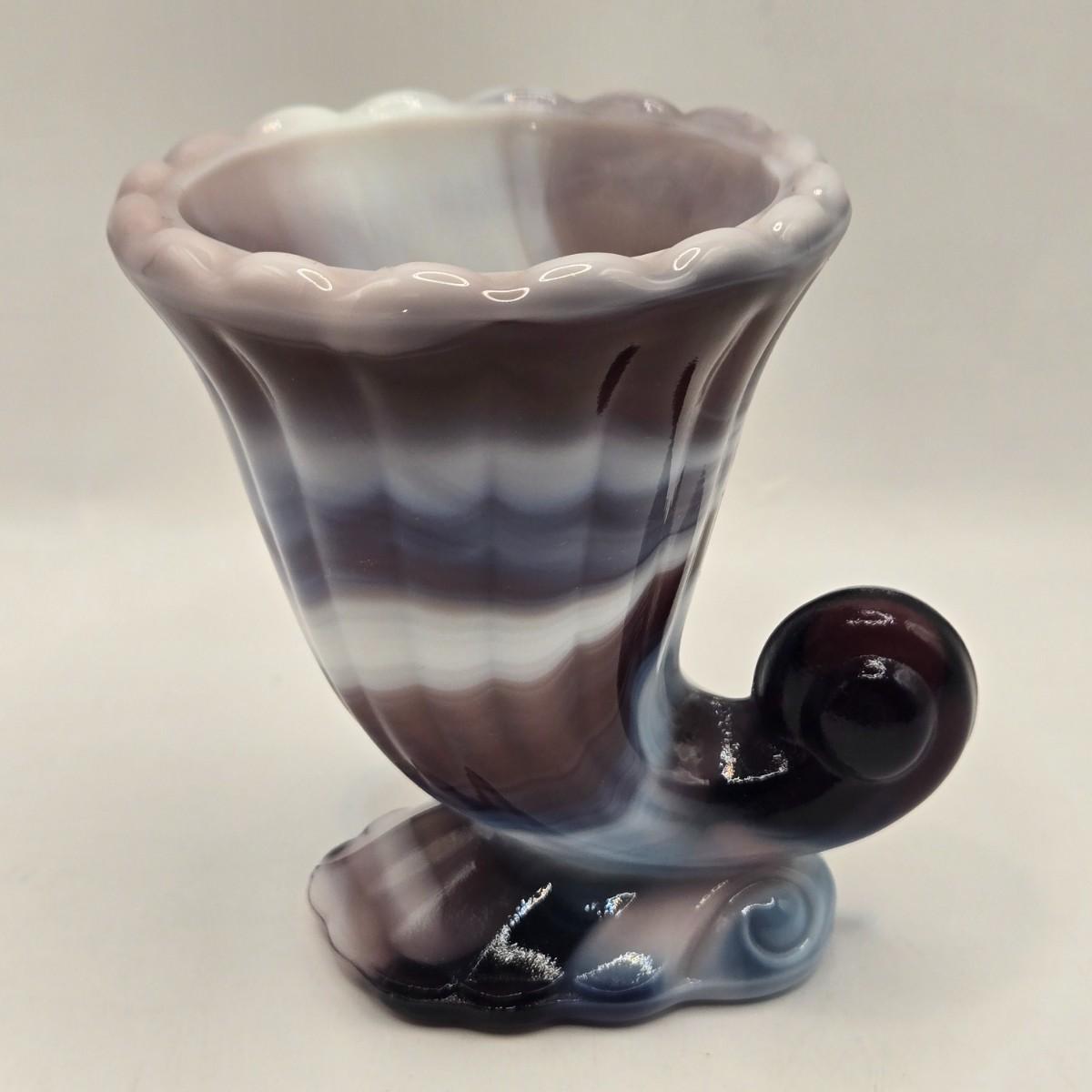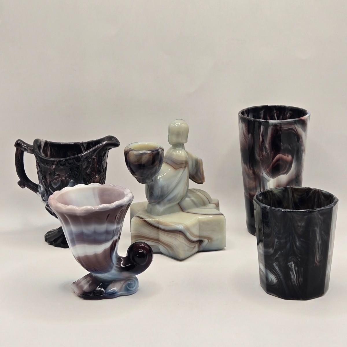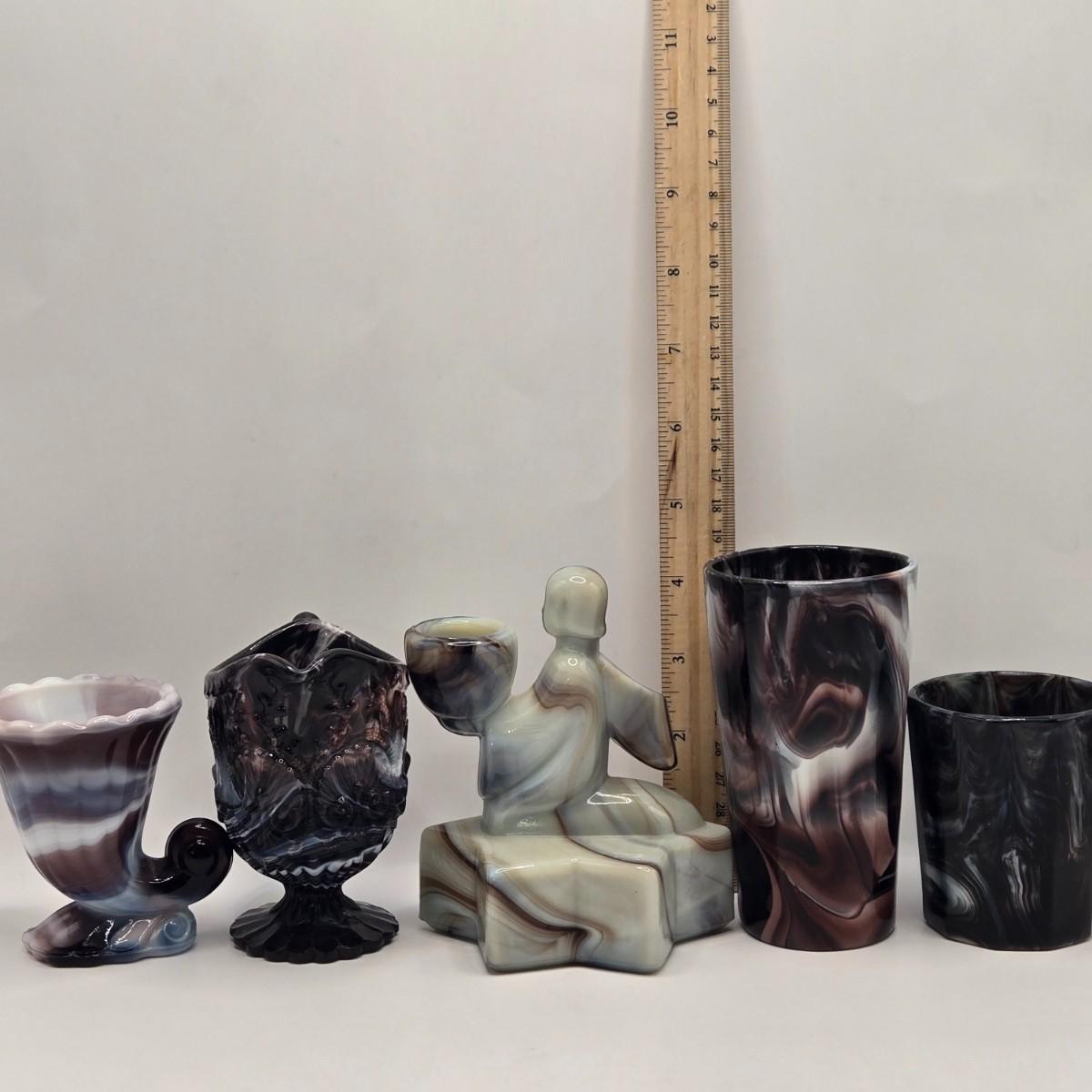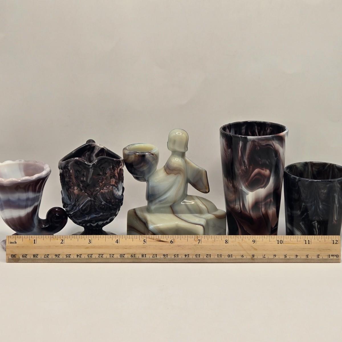 LOT 30L: Vintage Purple Slag Glass Angel on a Star Candle Holder, Small Cornucopia, Creamer/Small Pitcher, and Two Tumbler Glasses