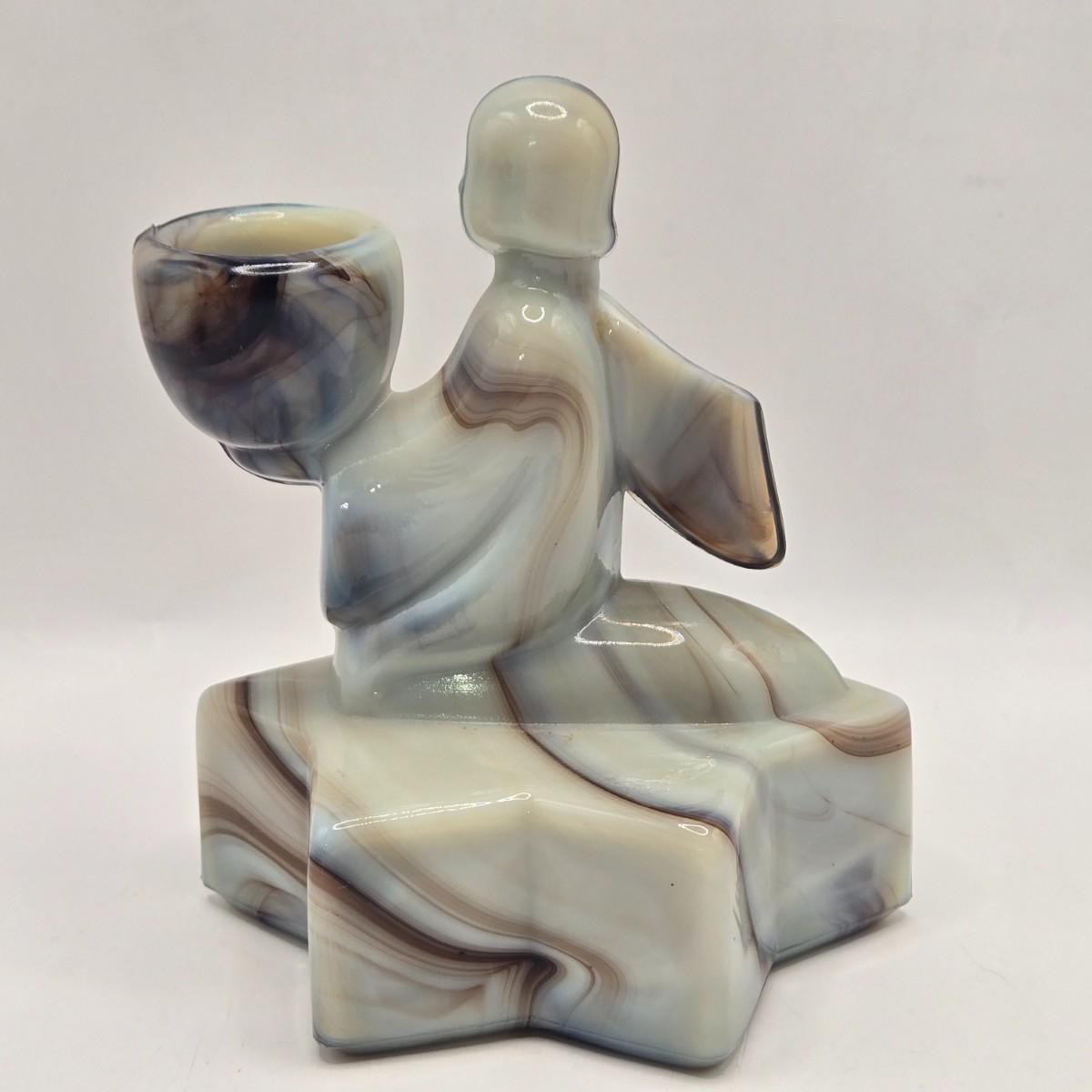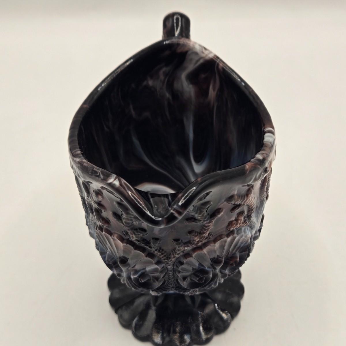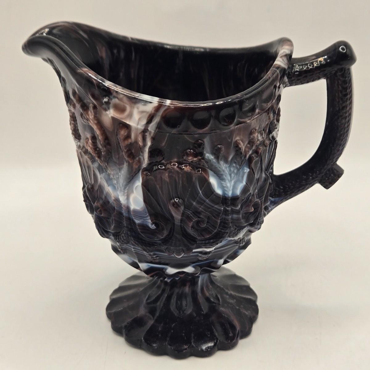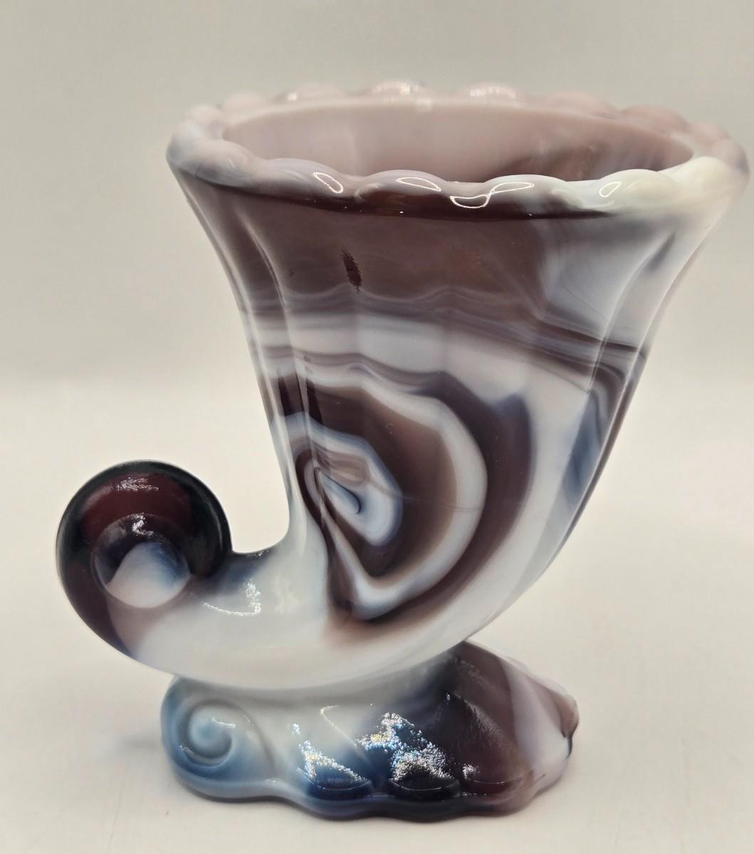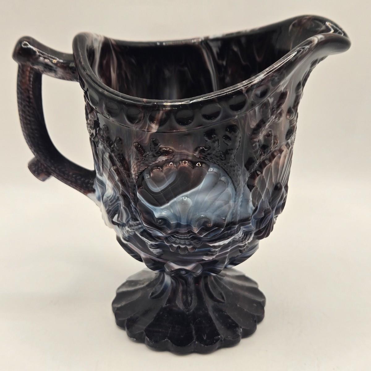 LOT 30L: Vintage Purple Slag Glass Angel on a Star Candle Holder, Small Cornucopia, Creamer/Small Pitcher, and Two Tumbler Glasses