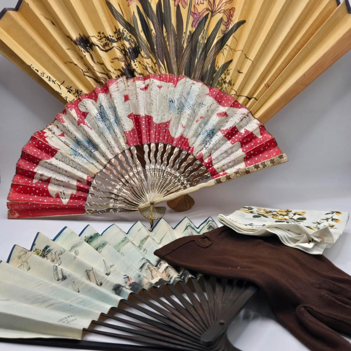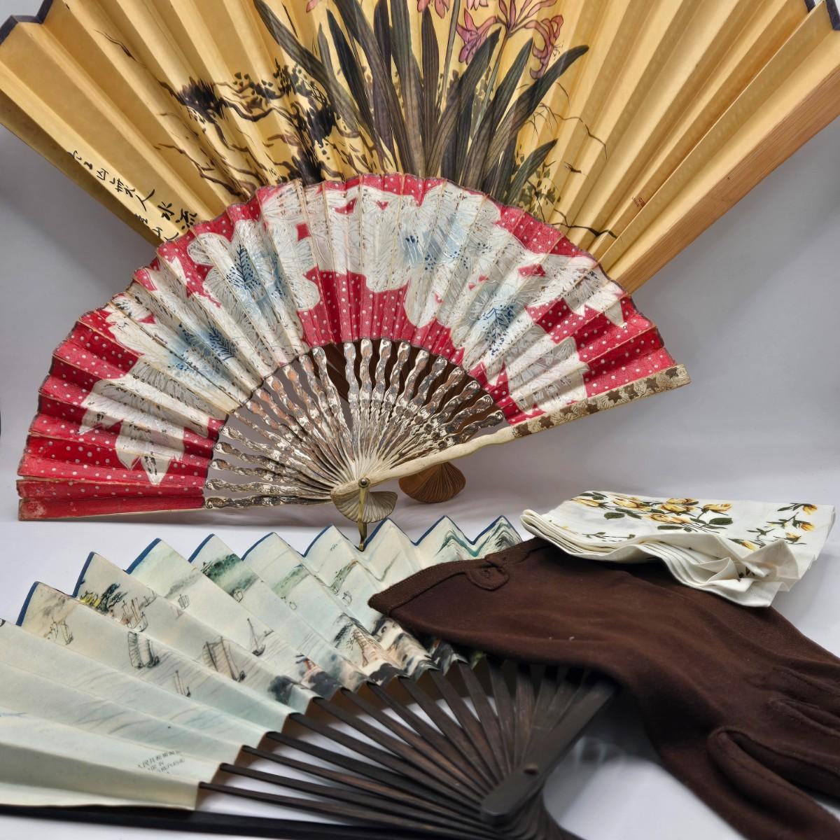LOT 36L: Fans, Ladies Dress Gloves, and Handkerchief