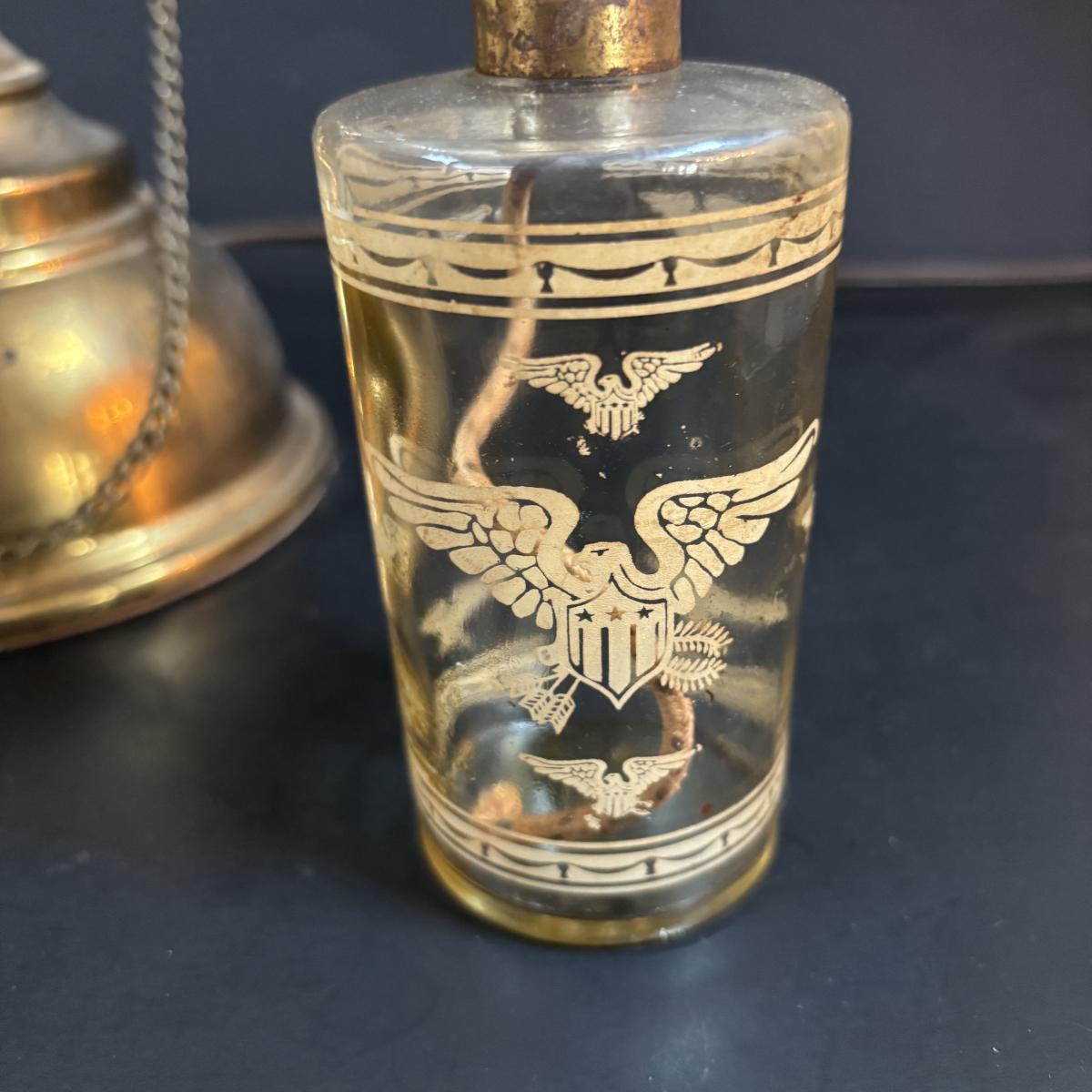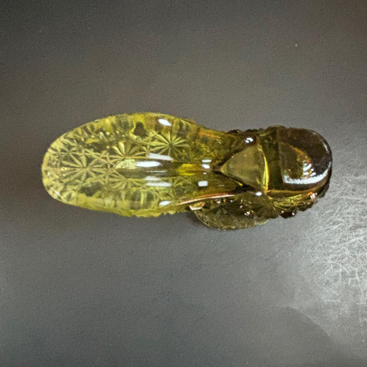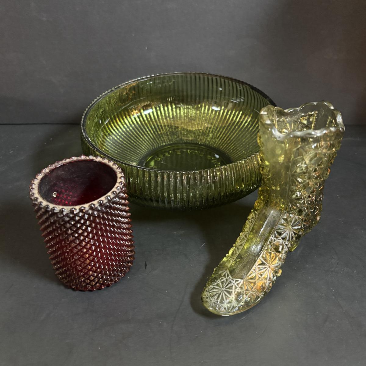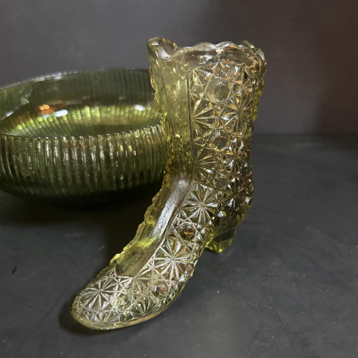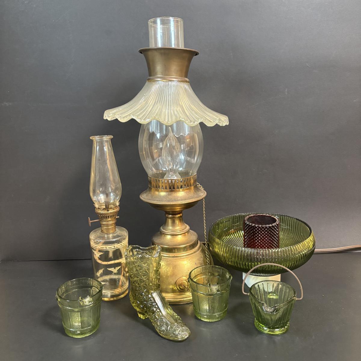 LOT 58: Vintage Olive Green Glass Collection: E.O. Brody Dish, Bucket Ashtray & Boot, Faroy Glass Votive/Toothpick Holder, Patriotic Oil Lamp & Brass Electrified Oil Lamp