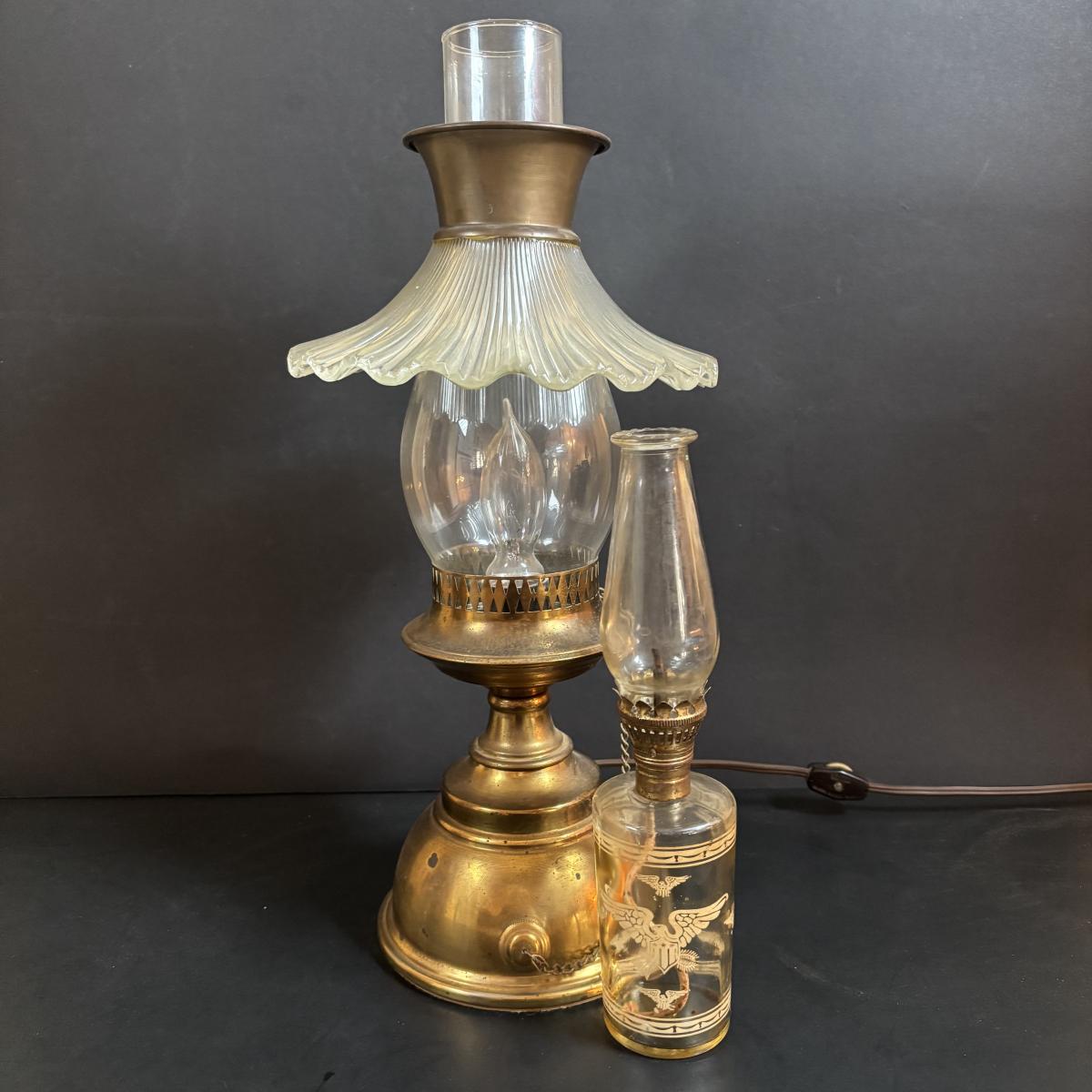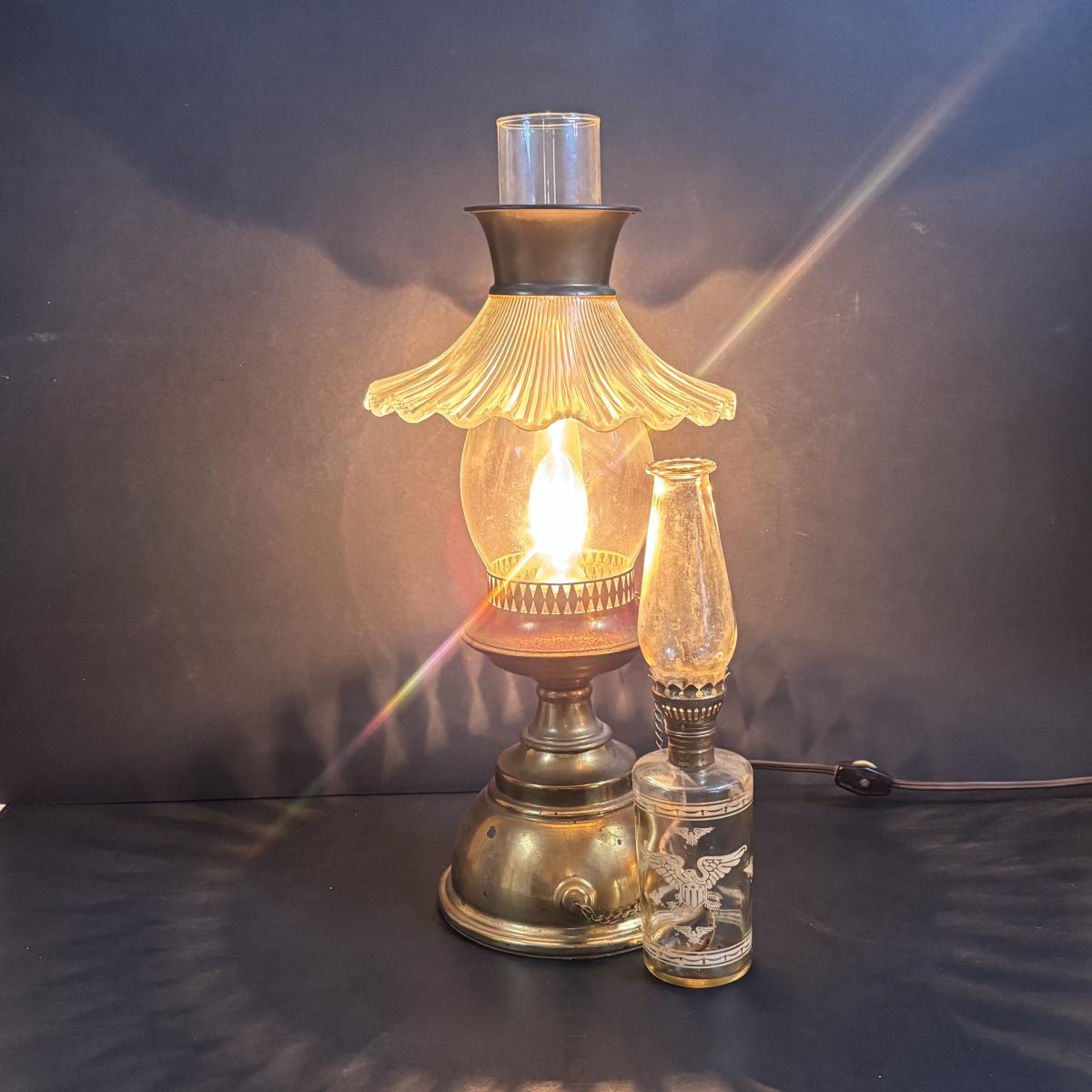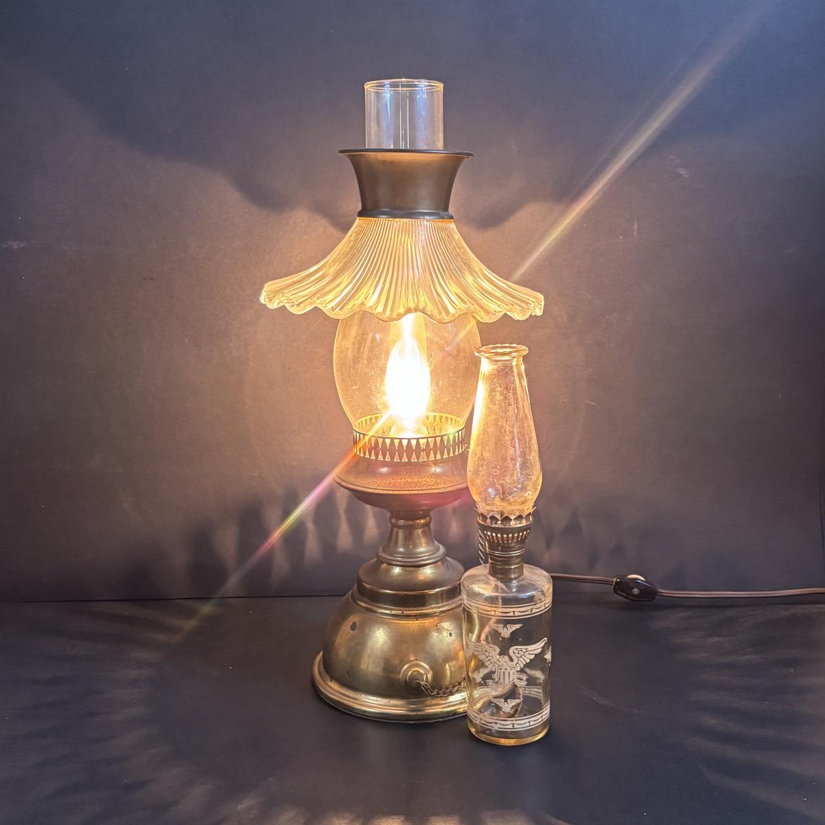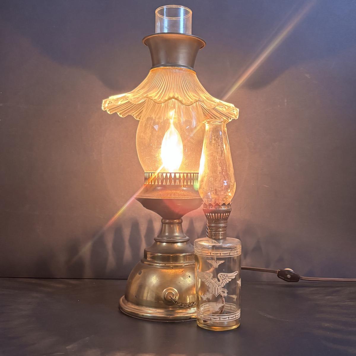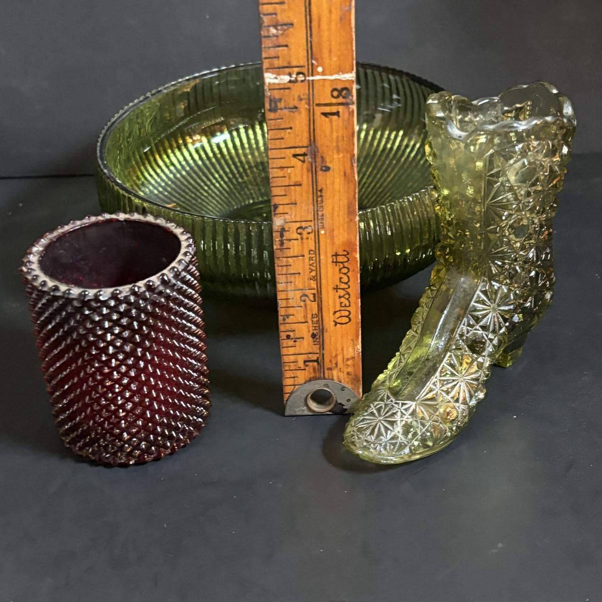 LOT 58: Vintage Olive Green Glass Collection: E.O. Brody Dish, Bucket Ashtray & Boot, Faroy Glass Votive/Toothpick Holder, Patriotic Oil Lamp & Brass Electrified Oil Lamp