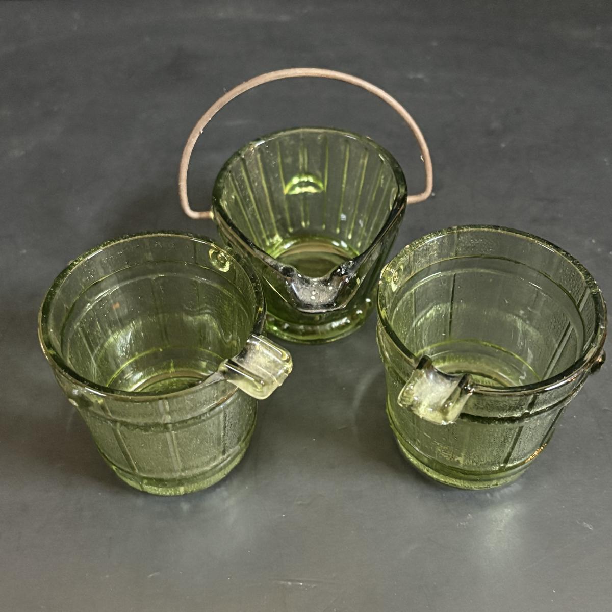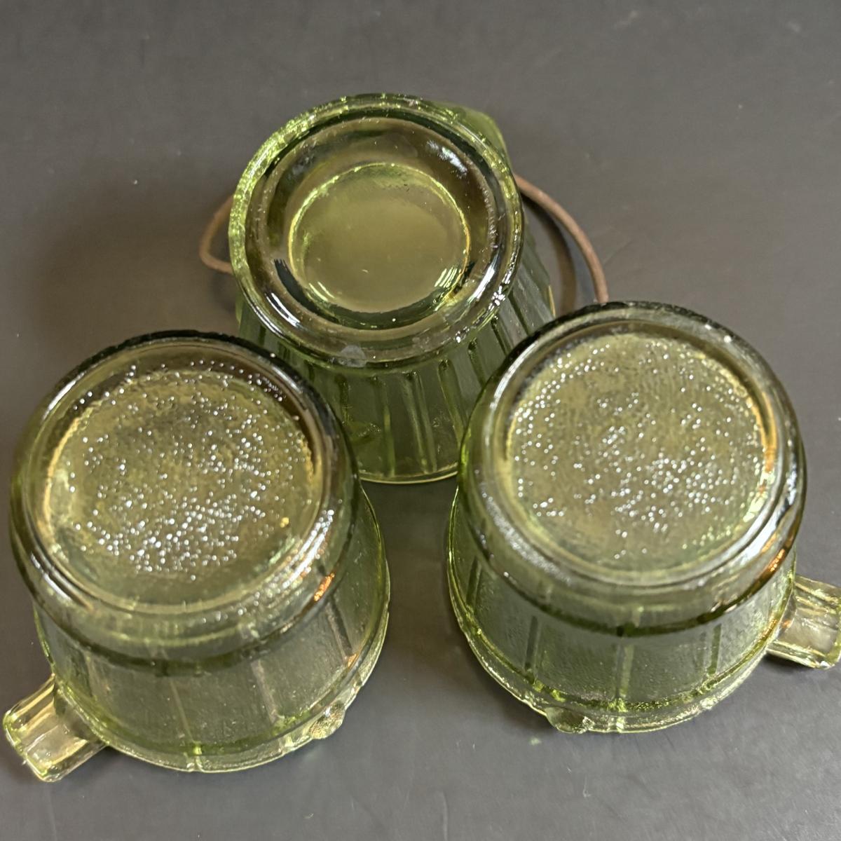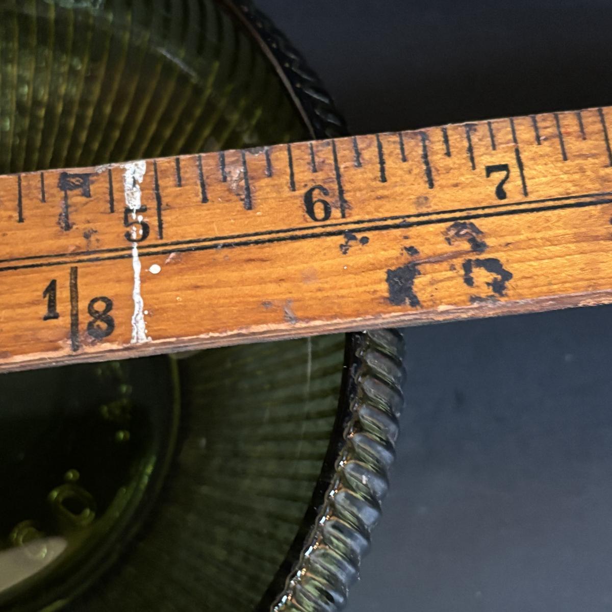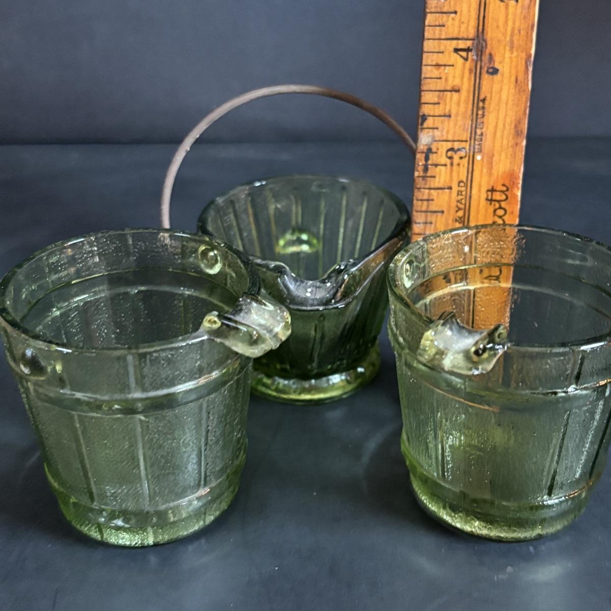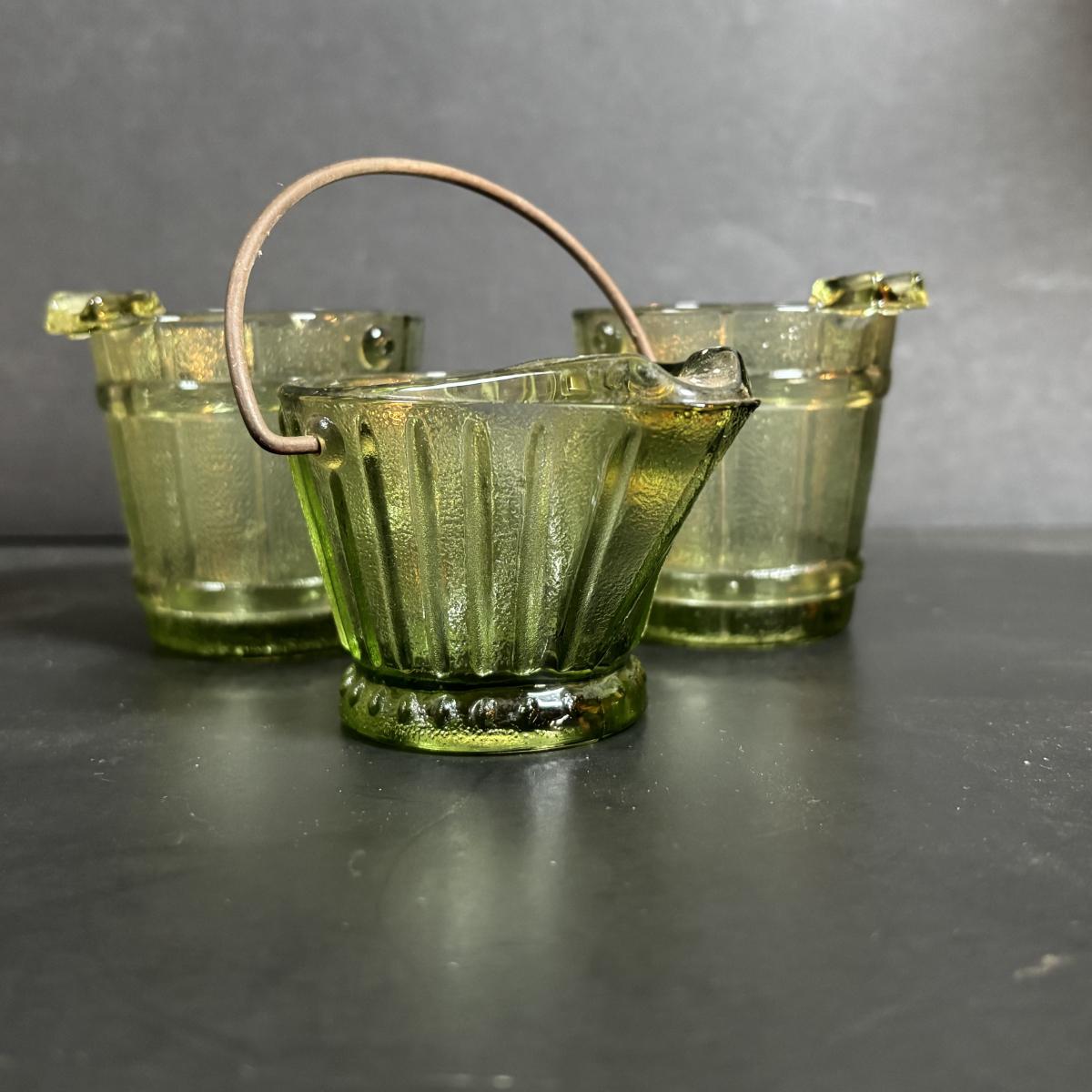 LOT 58: Vintage Olive Green Glass Collection: E.O. Brody Dish, Bucket Ashtray & Boot, Faroy Glass Votive/Toothpick Holder, Patriotic Oil Lamp & Brass Electrified Oil Lamp