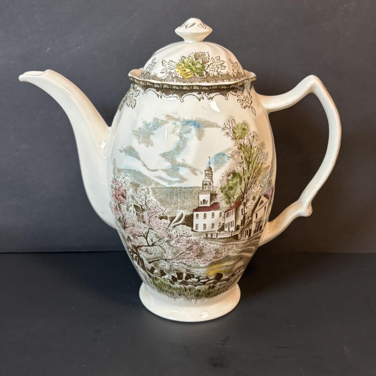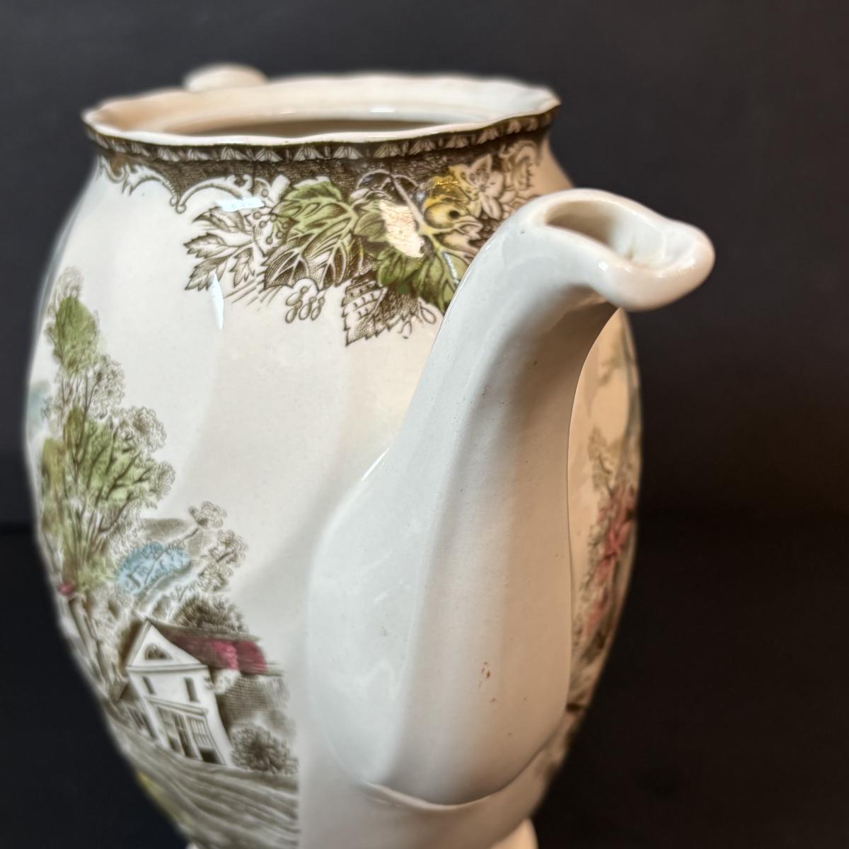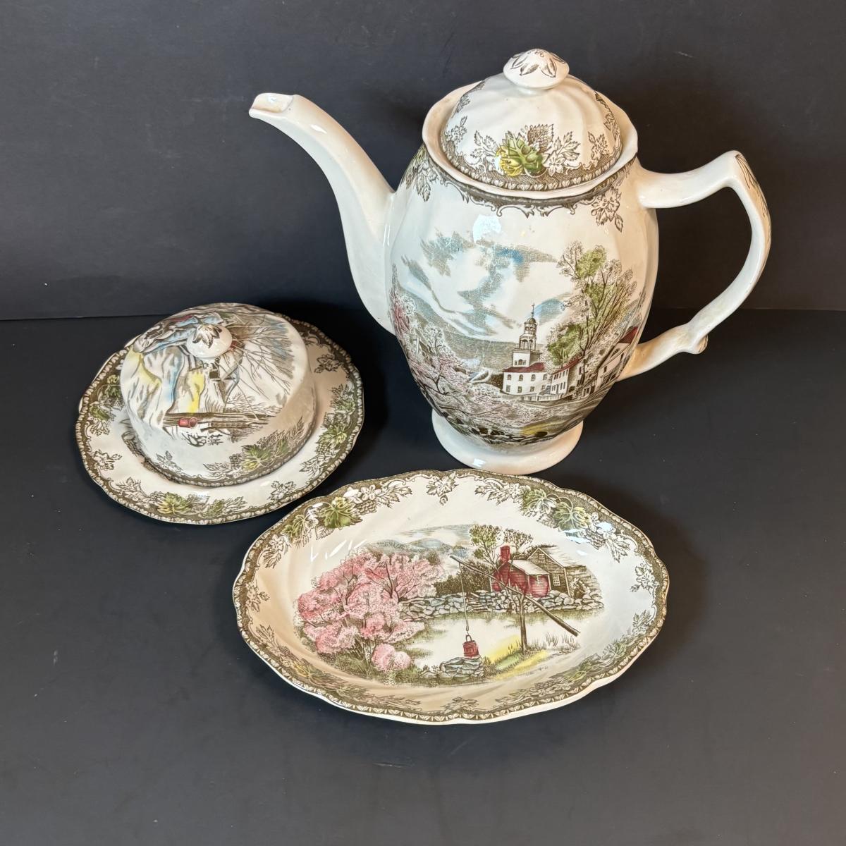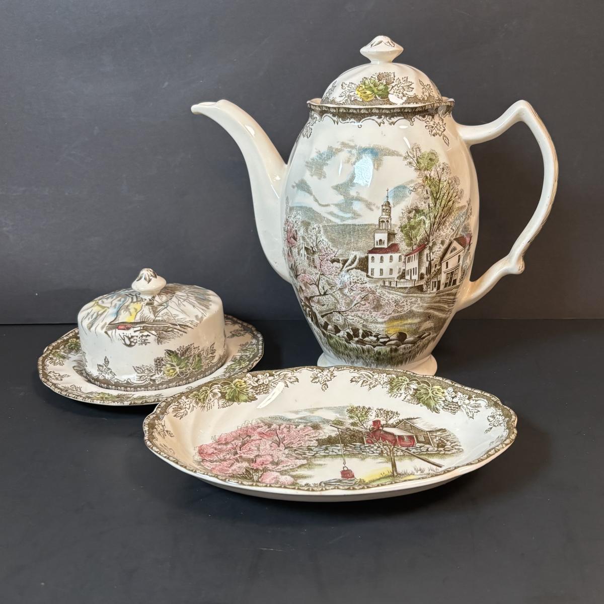 LOT 84: Johnson Bros. of England Ironstone Coffee Pot, Butter Dish & Small Oval Platter Dishware: The Friendly Village Collection